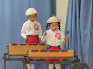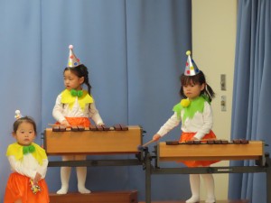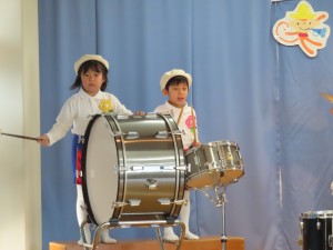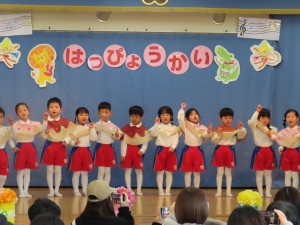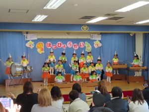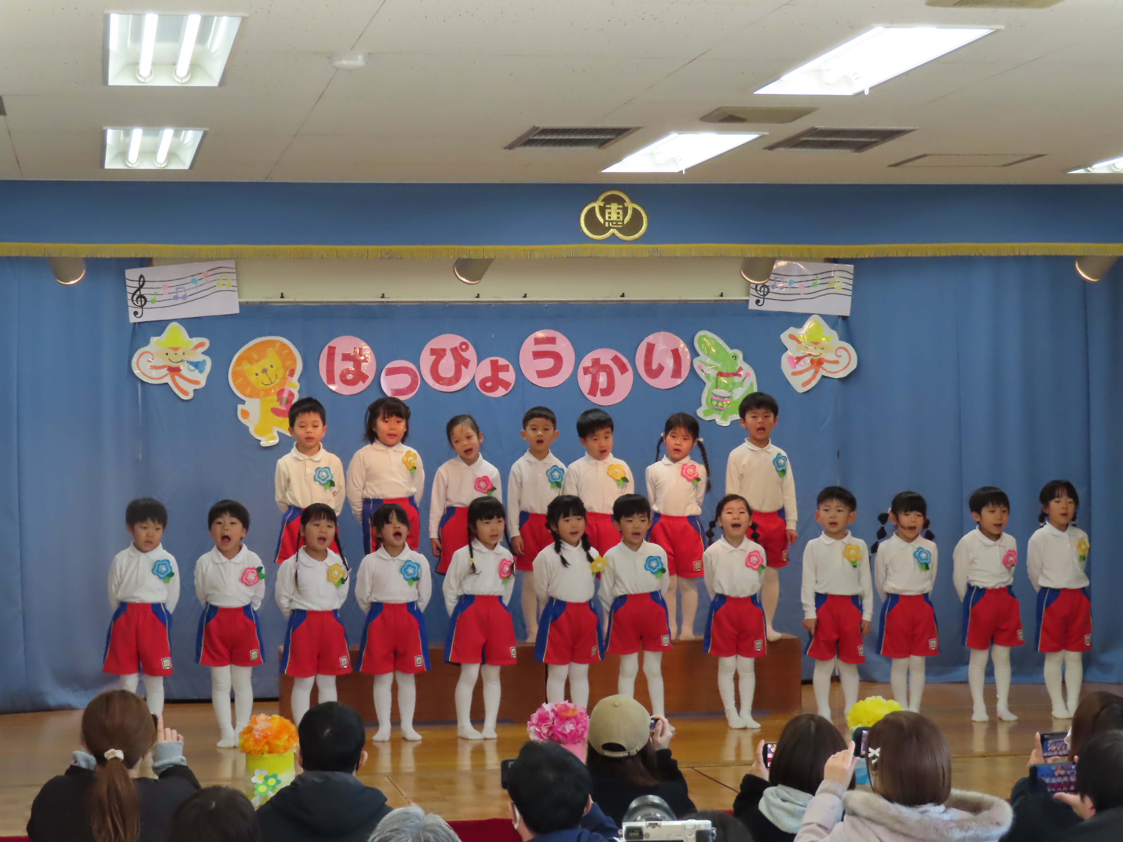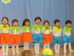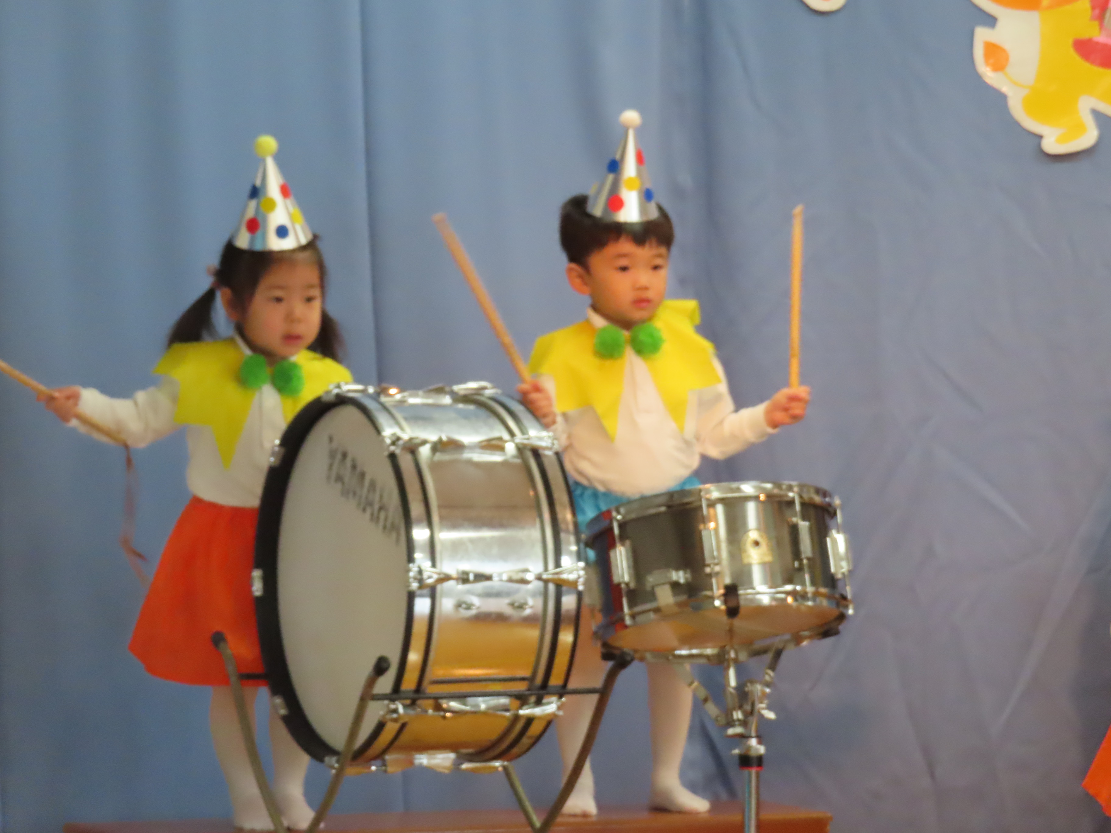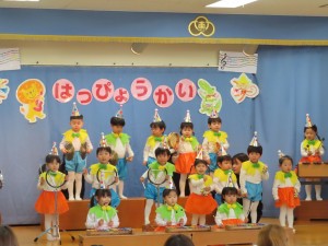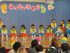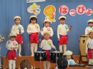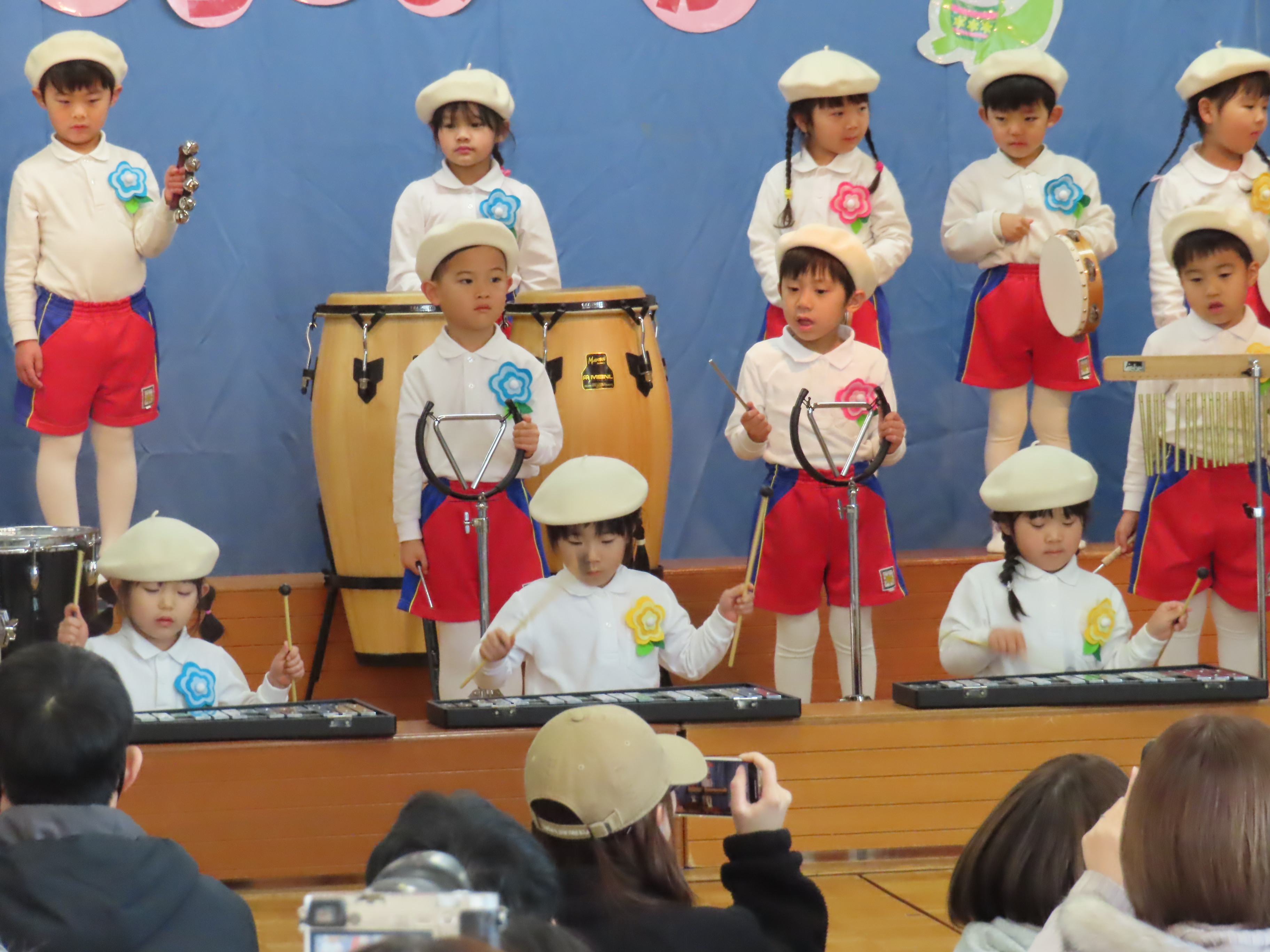 生活発表会「たのしいあつまり」が行われました。今年度最後の大きな行事です。今年に入って、毎日コツコツと練習を積み重ねてきました。2歳児すみれ組と4歳児ゆり組は、合奏と合唱を披露。すみれ組さんは、舞台に立ってるだけでもすごい!!そんな中でも、泣くことなく大きな声で一生懸命に歌い、音楽に合わせてリズム打ちをしとっても立派な演奏を見せてくれました!! ゆり組も、4歳児さん達らしく歌も大きな声で歌い、合奏も2曲ともかっこよく決めてくれました!!みんな最後までよく頑張りました!!(*^^)v