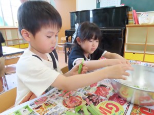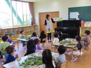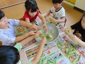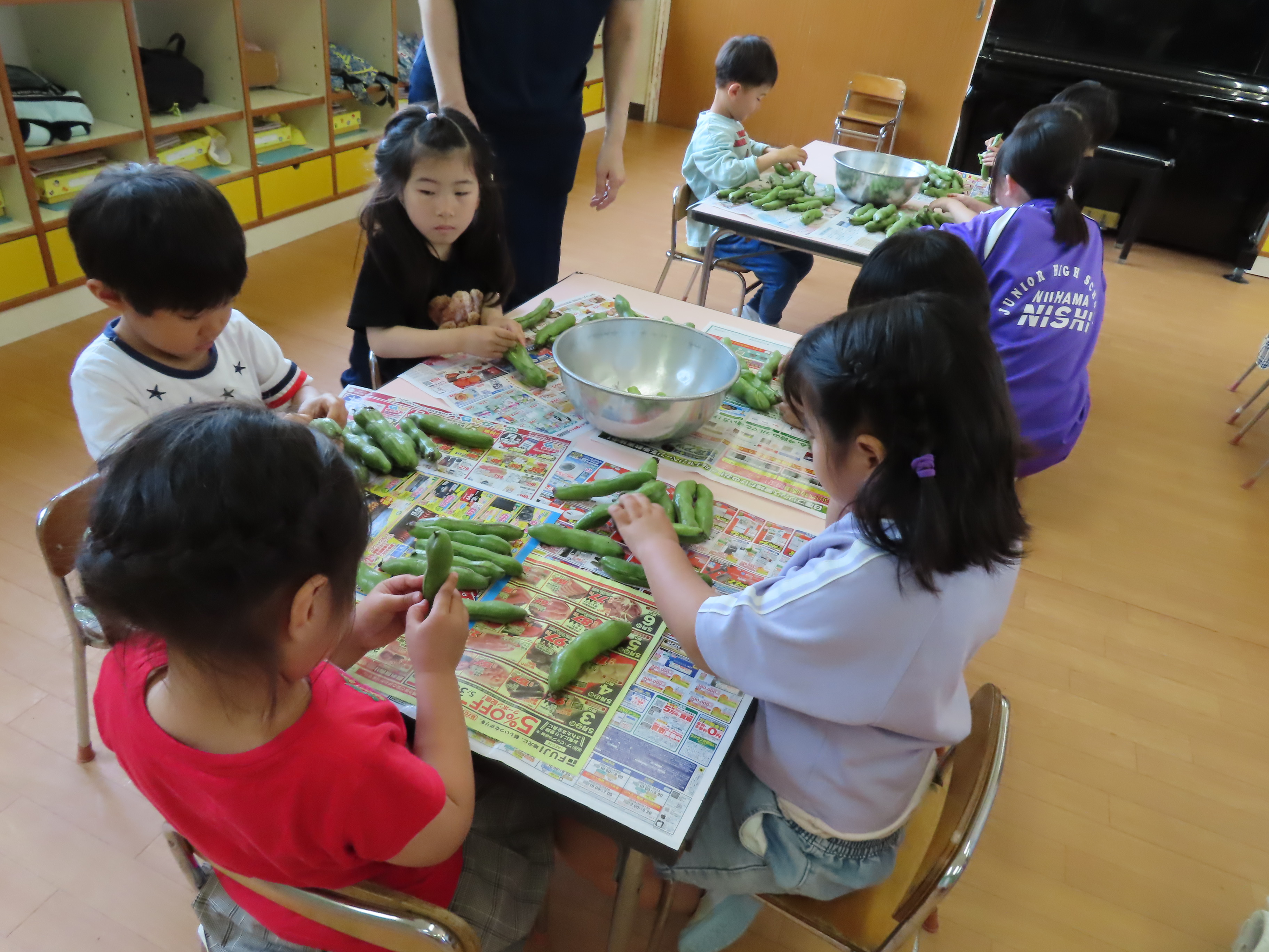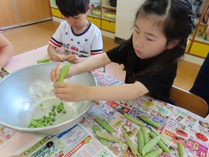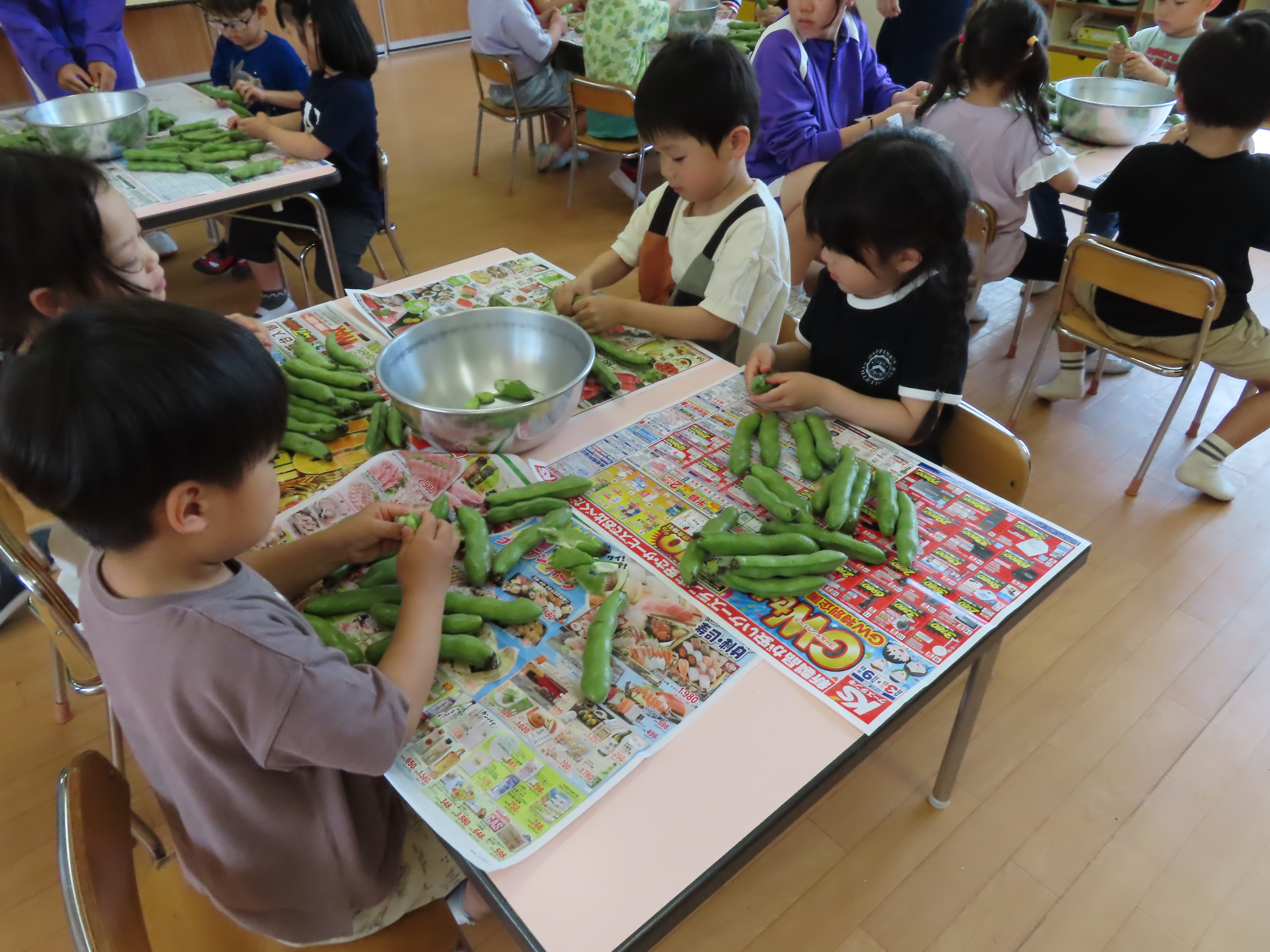 年長児がそら豆とスナップえんどうの皮むきをしました♪(*^_^*)そら豆の皮の中のフワフワな感触を楽しみながら皮をむいたひまわりさん。上手に皮がむけると嬉しそうな様子でした~!