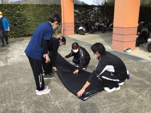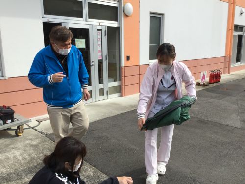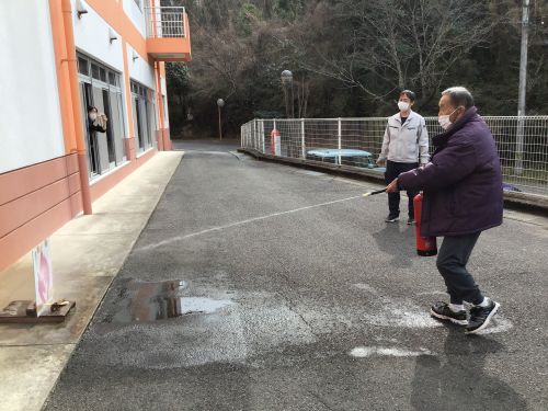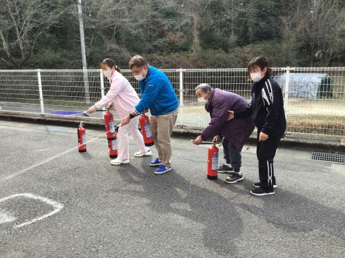施設で火災発生時の避難誘導訓練と消火器の使い方講習、