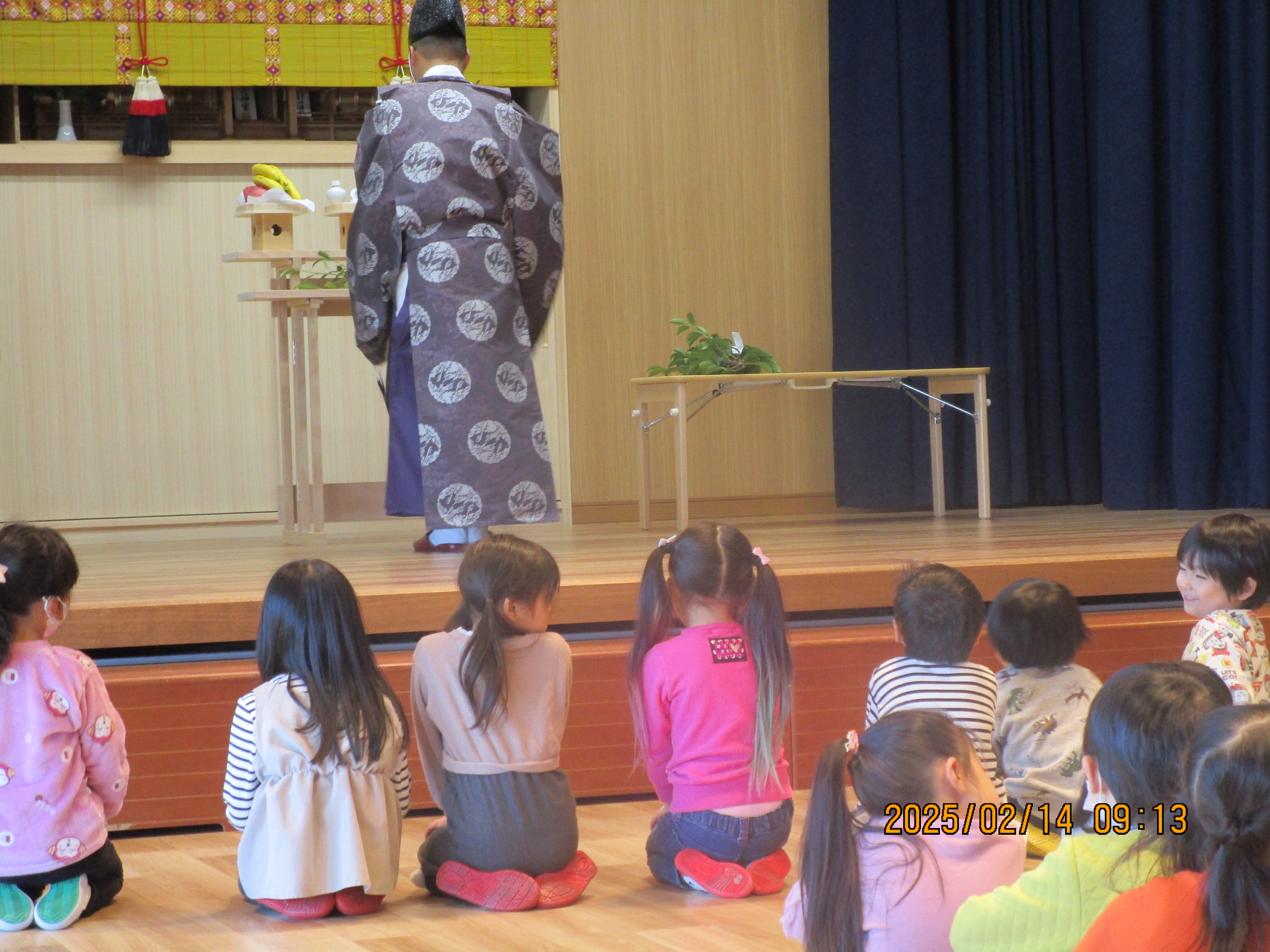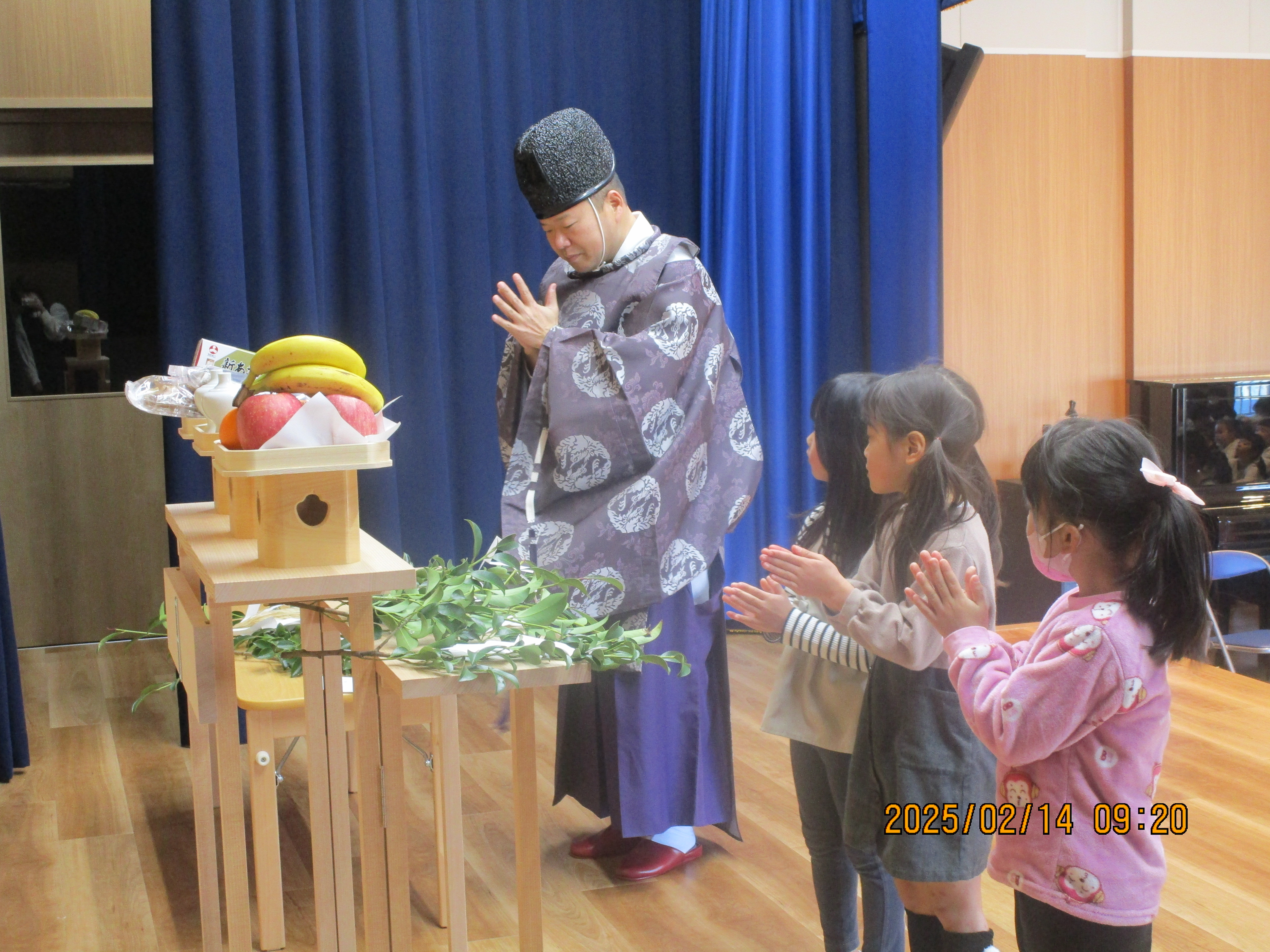 今月も年長さんが宮司さんに教えて頂きながら玉串奉奠の儀を執り行いました。