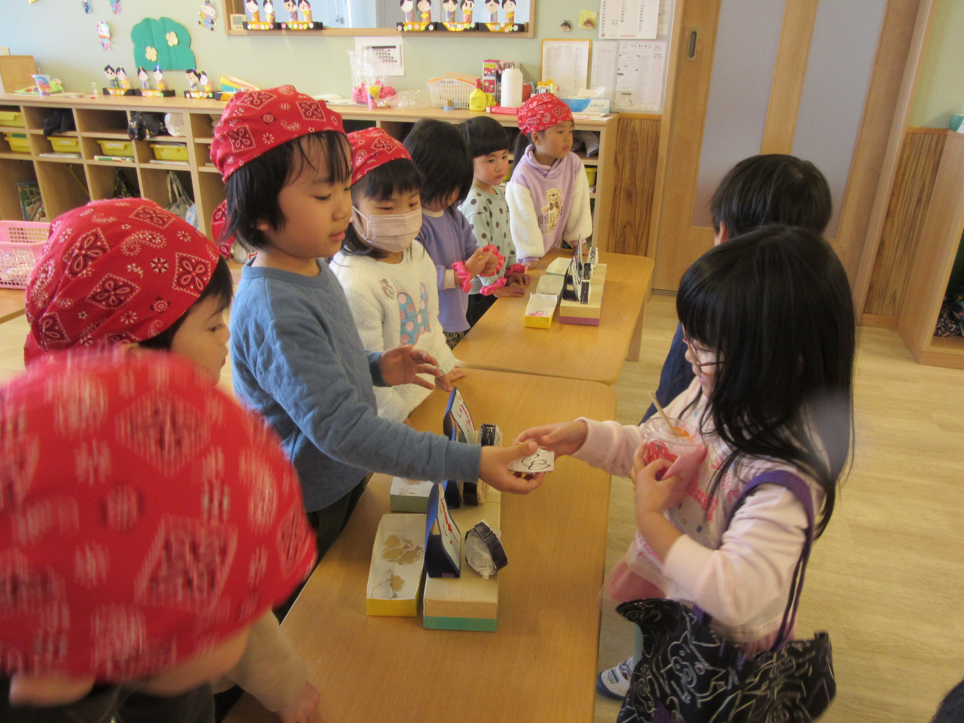 お店屋さんになって、商品を売ったり、もらったお金で好きなものを買ったりして