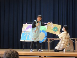 先生が大きなはさみでチョキチョキ切って、開くと・・・・あら不思議!