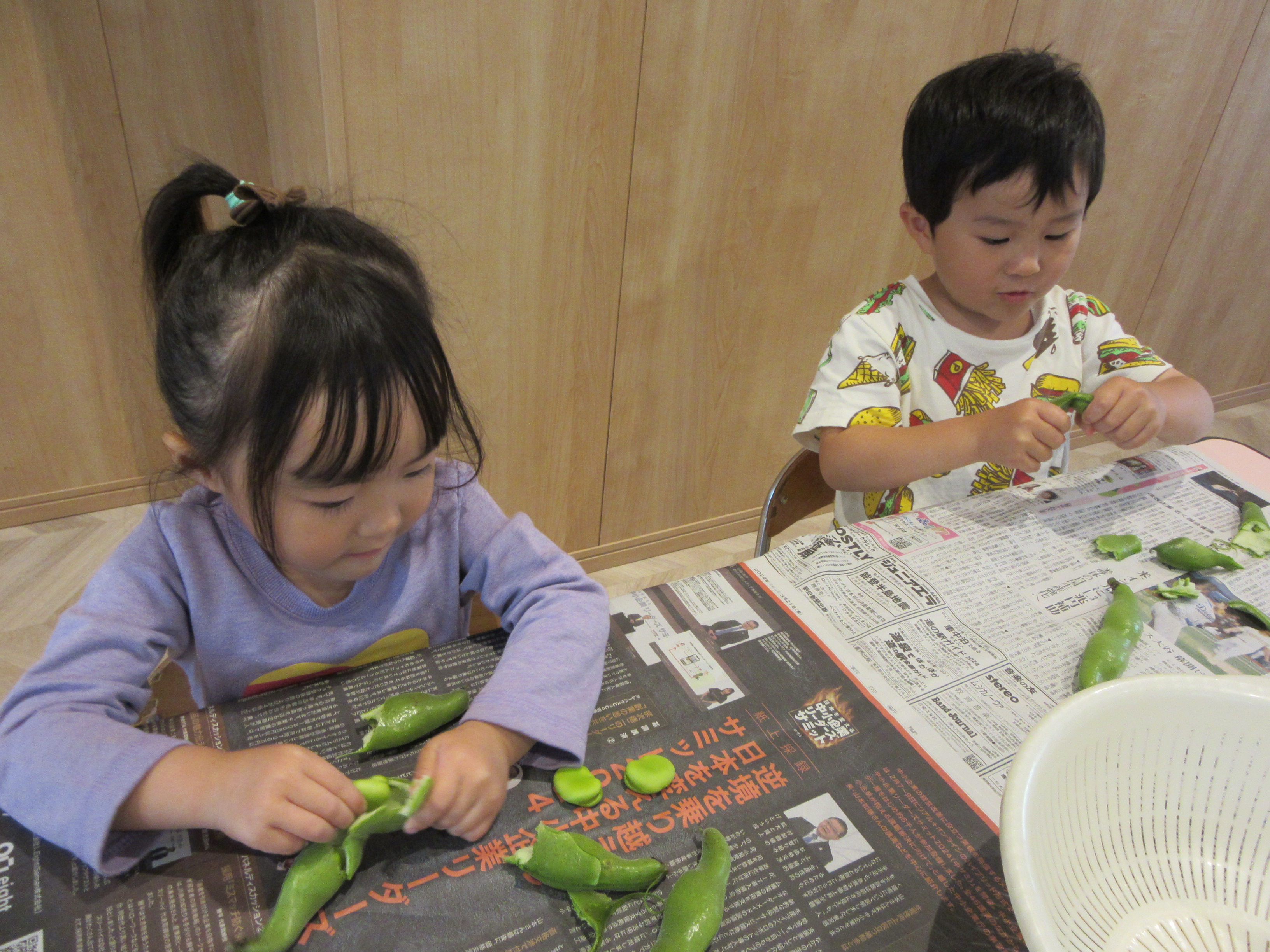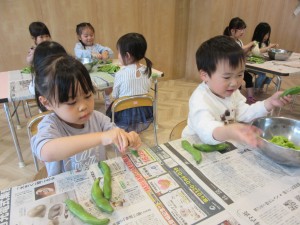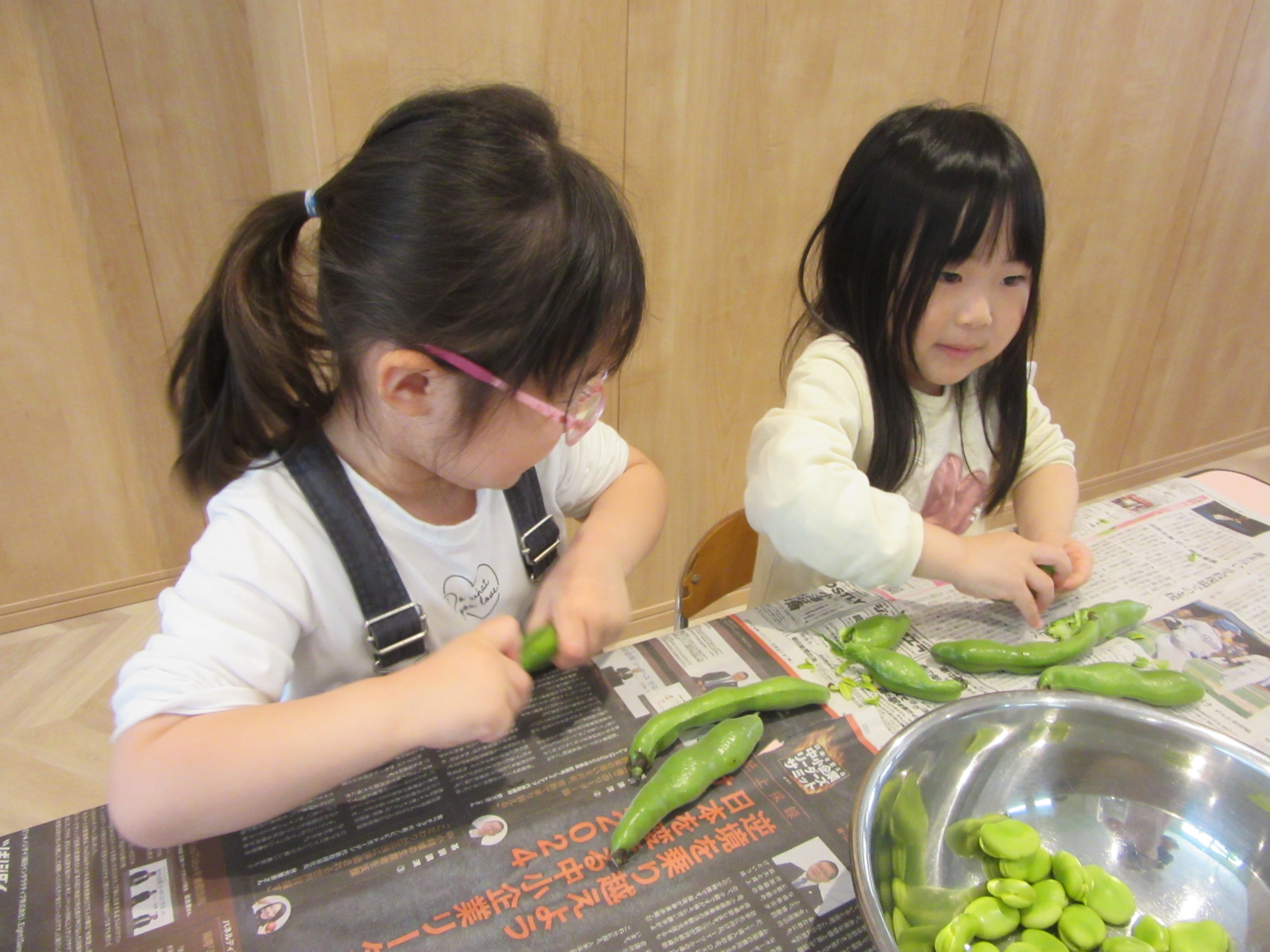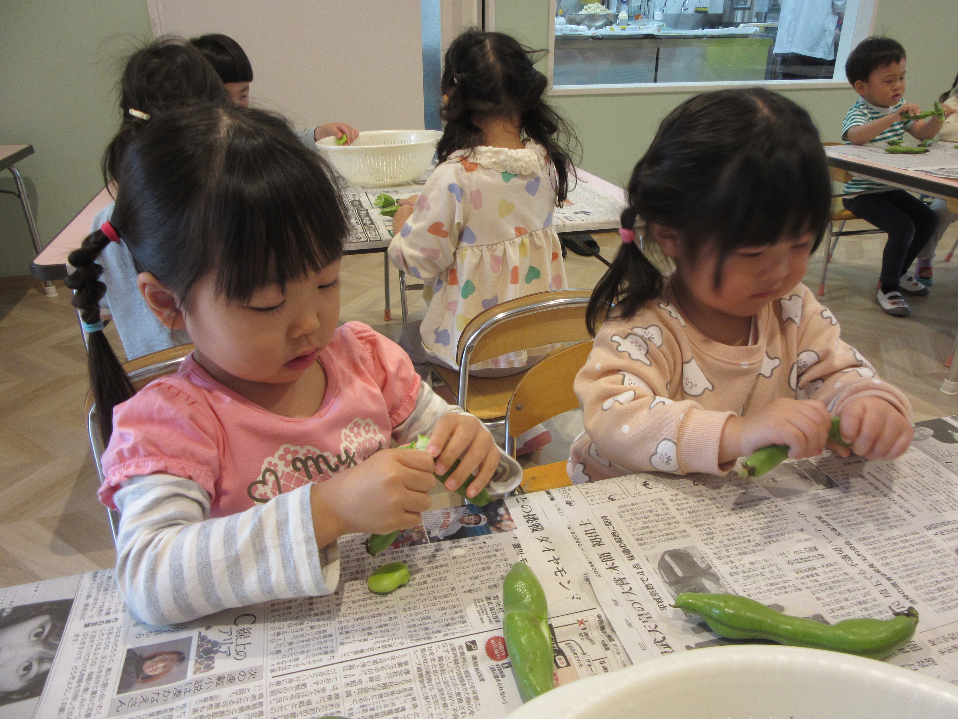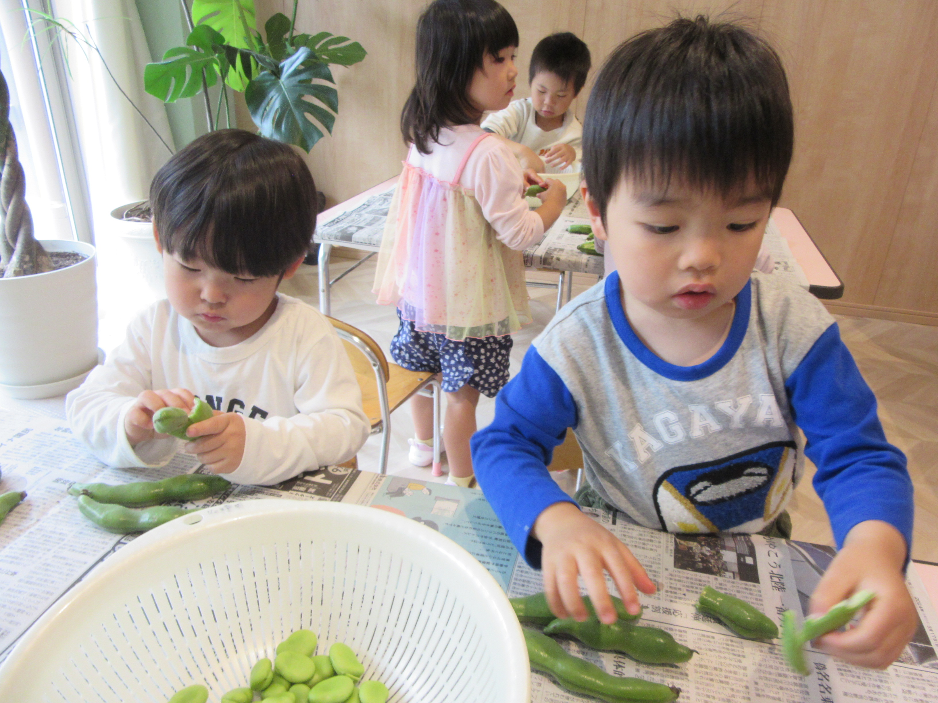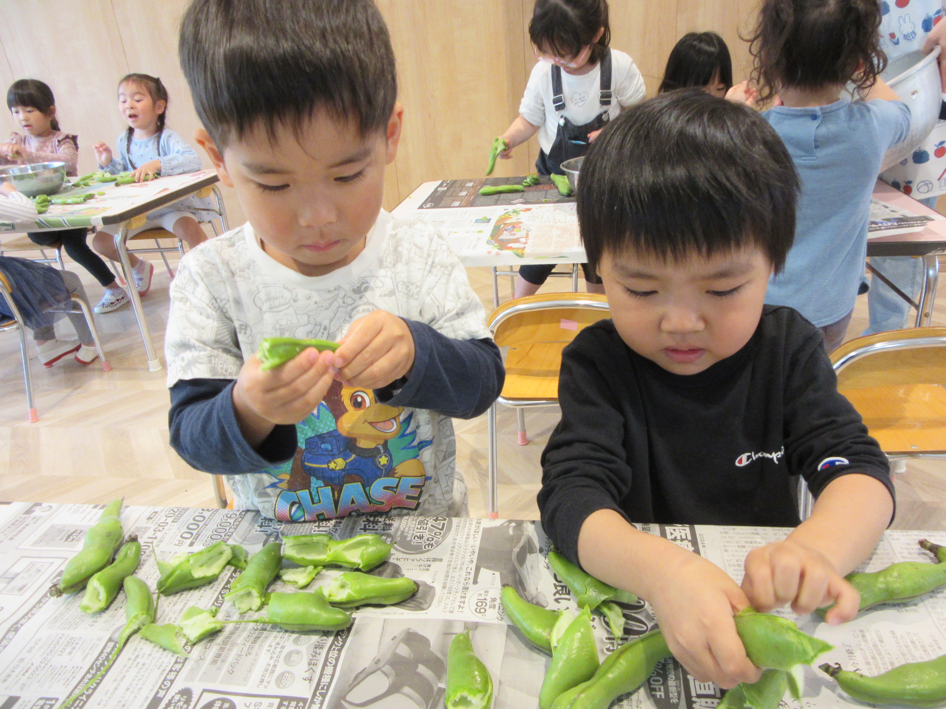 空豆の皮むき(5月12日実施)2025年5月19日こあらぐみ、ぱんだぐみ、ぞうぐみが空豆の皮むきのお手伝いをしてくれました!! 豆の名前は「空豆」、お空にむかって、元気に成長するよ☆ 皮むきの仕方を聞いて、皮むきを始めると、とても器用に手先を使っていく子どもたち!! 「たのしいね」「もっとしたい」と言いながら、楽しく行うことができました☆ 「空豆の塩ゆで」になって、給食の時間においしくいただきました☆ 自分でお手伝いしたことがうれしく、『おいしいね~』と笑顔いっぱいで食べることができてよかったです。 施設情報愛媛県新居浜市にある児童福祉施設中萩保育園あいさつのできる子 つよい体のやさしい子 話の聞ける子 自分で考えできる子児童福祉施設 中萩保育園〒792-0045愛媛県新居浜市中萩町8番1号TEL:0897-41-7233 FAX:0897-41-7209中萩保育園WEBサイト最近の記事2025年12月8日保育参観(12月3日実施)児童福祉施設 中萩保育園2025年11月28日親子遠足(11月20日実施)児童福祉施設 中萩保育園2025年11月28日火遊び防止教室(11月19日実施)児童福祉施設 中萩保育園2025年11月26日シルエット劇場(11月14日実施)児童福祉施設 中萩保育園2025年11月26日交通安全教室(11月13日実施)児童福祉施設 中萩保育園2025年11月26日食育のお話(11月10日実施)児童福祉施設 中萩保育園中萩保育園の記事一覧