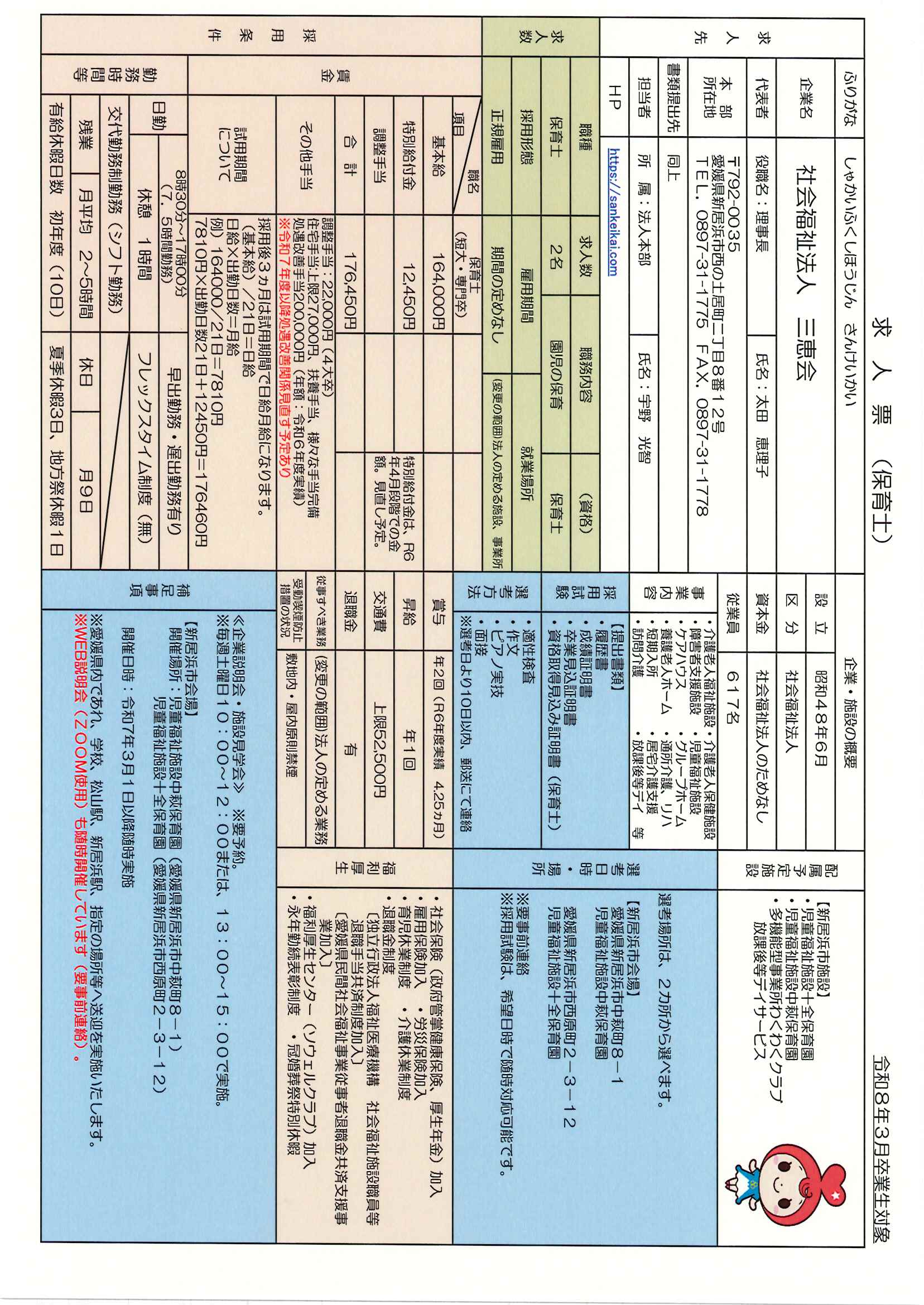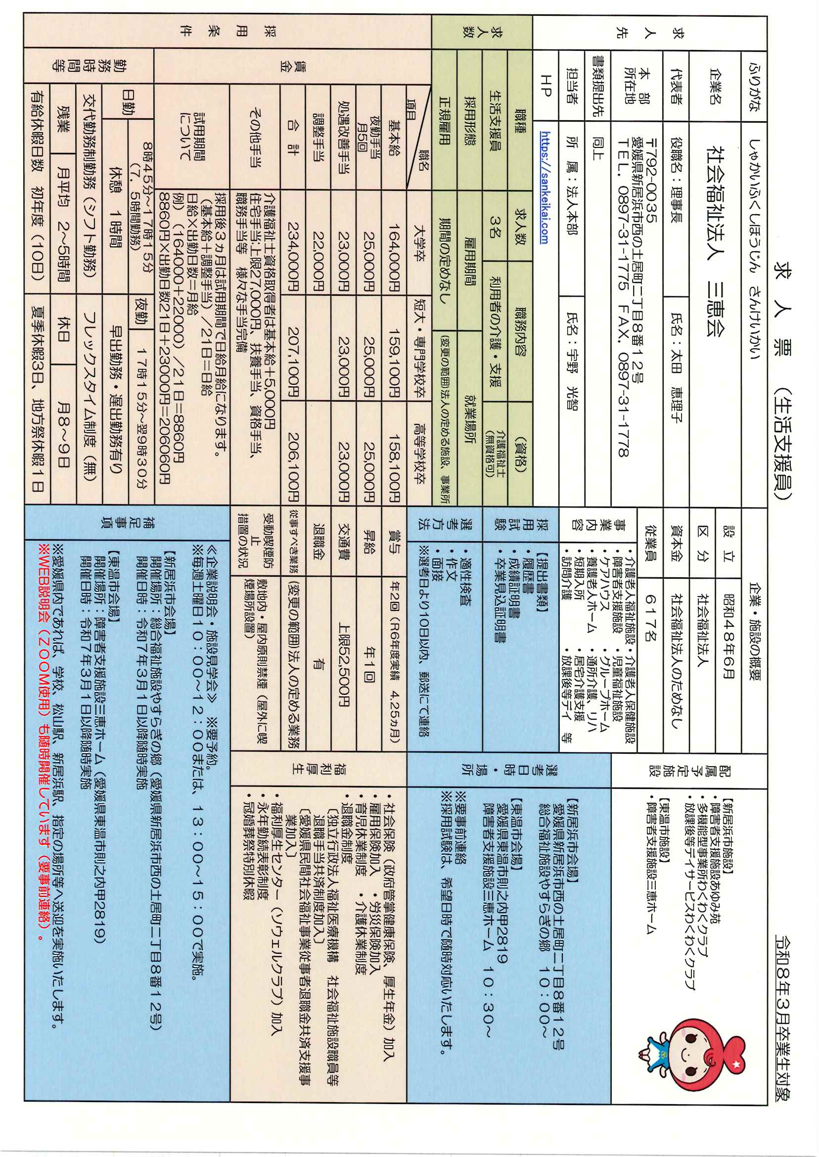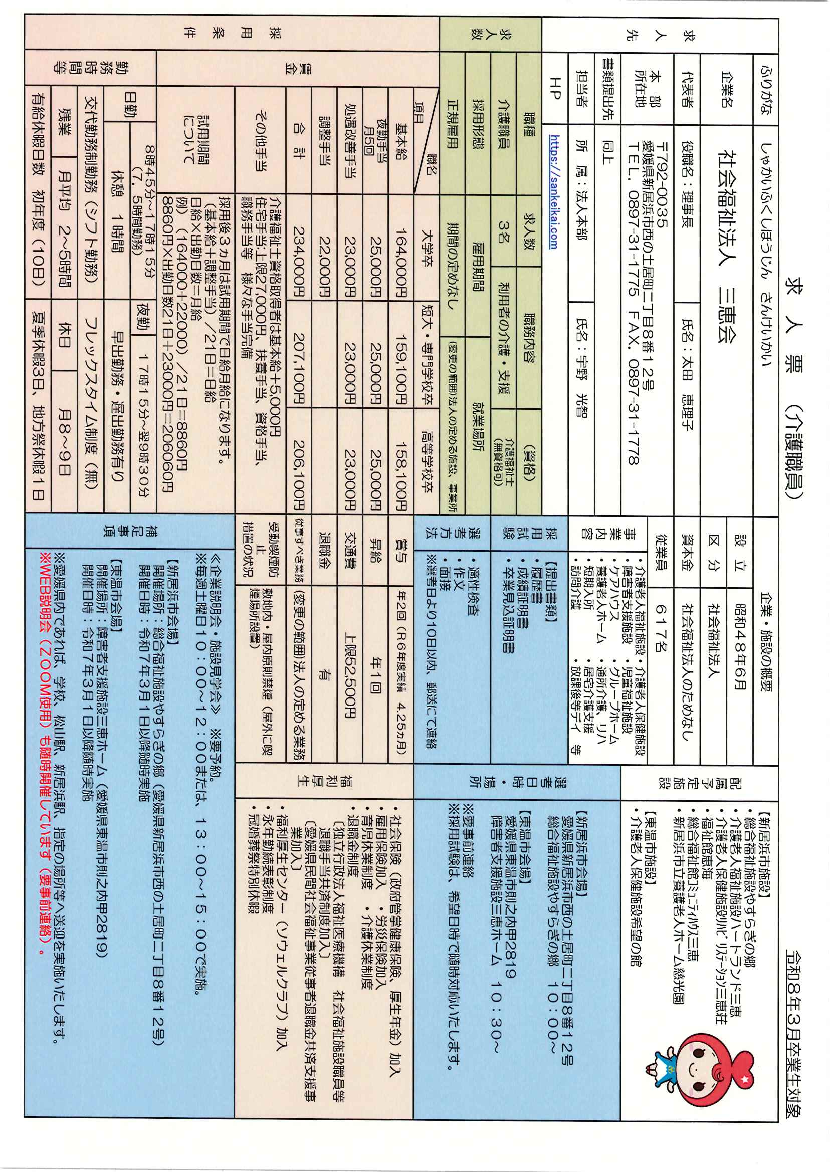 出願先・お問い合わせ先:社会福祉法人三恵会 法人本部 求人担当者:宇野・片上まで