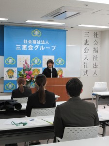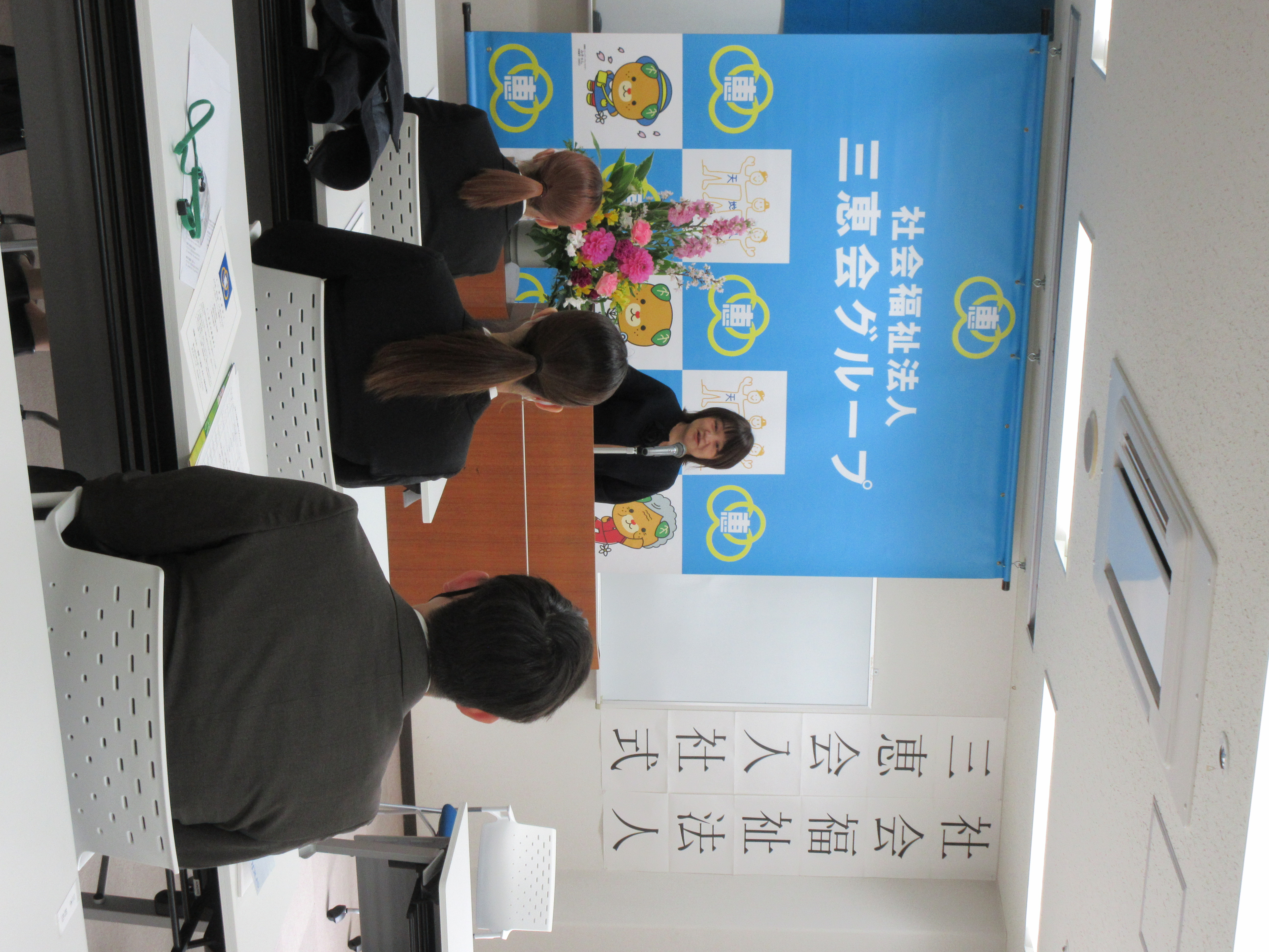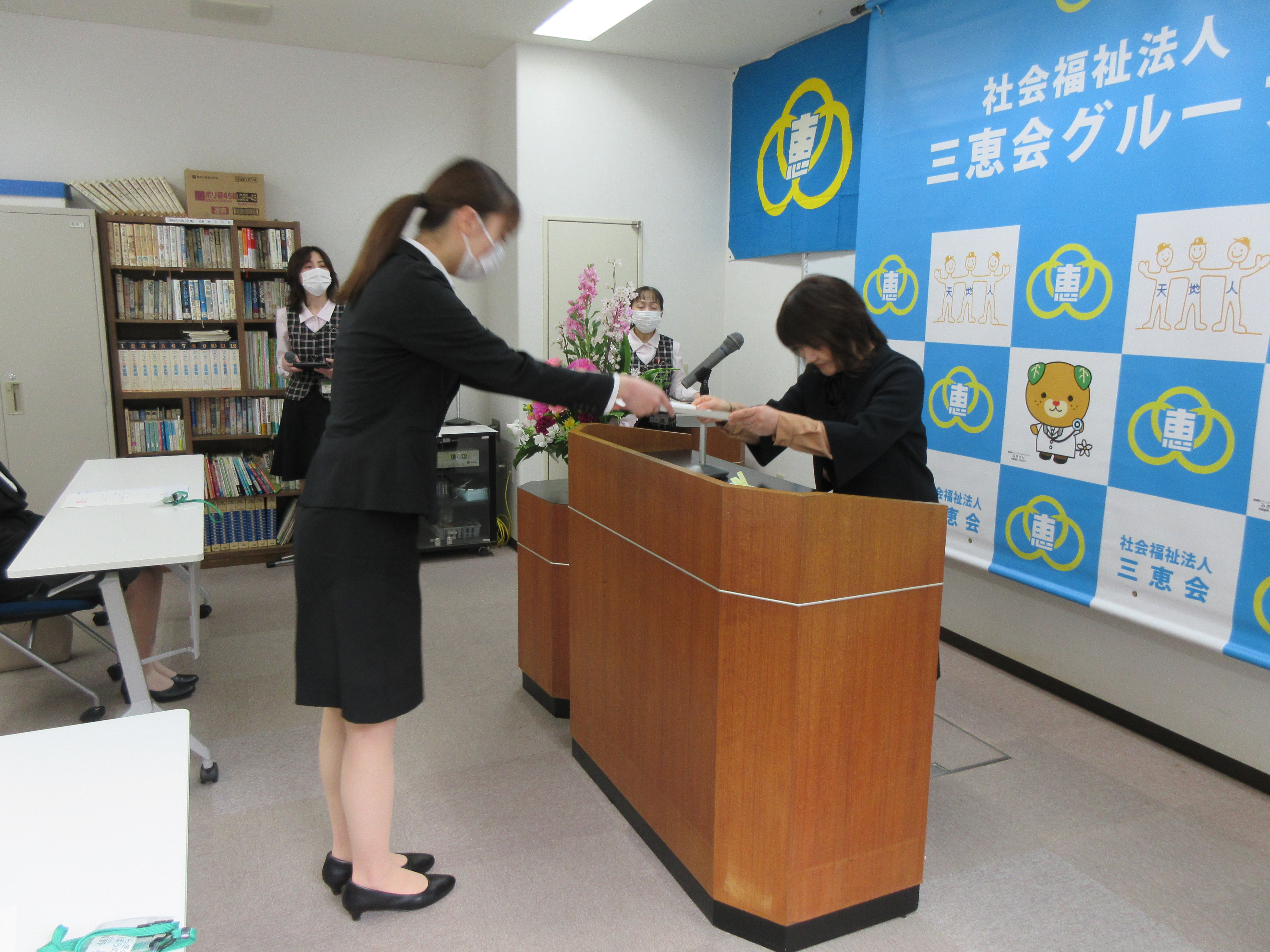 令和7年度新入職員入社式及び辞令交付式2025年4月7日「令和7年度『社会福祉法人三恵会』新入職員入社式及び辞令交付式」を執り行いました。 今年度は6名の新入職員が入社し、三恵会職員の仲間入りです。 福祉の道を志していただいた皆さんを、大切に育てたいと思います!! 施設情報社会福祉法人三恵会本部三恵会は、愛媛県内10ヶ所に施設があり、乳幼児から障がいのある方、高齢者までの支援が出来る社会福祉法人です。社会福祉法人三恵会本部住所:〒792-0035 愛媛県新居浜市西の土居町2-8-12TEL(0897)31-1775 FAX(0897)31-1778三恵会本部WEBサイト最近の記事2025年10月9日「介護就職デイ」に出展します社会福祉法人 三恵会本部2025年10月7日【ひめボスNAVI】に掲載されました!社会福祉法人 三恵会本部2025年10月6日秋の採用試験情報(保育士・介護職員・生活支援員)社会福祉法人 三恵会本部2025年10月6日三恵会オリジナルキャラクター『めぐりん』です!!社会福祉法人 三恵会本部2025年10月1日児童福祉施設十全保育園大規模改修工事に係る一般競争入札のご案内社会福祉法人 三恵会本部2025年9月16日東予おしごと体験フェス2025社会福祉法人 三恵会本部三恵会本部の記事一覧