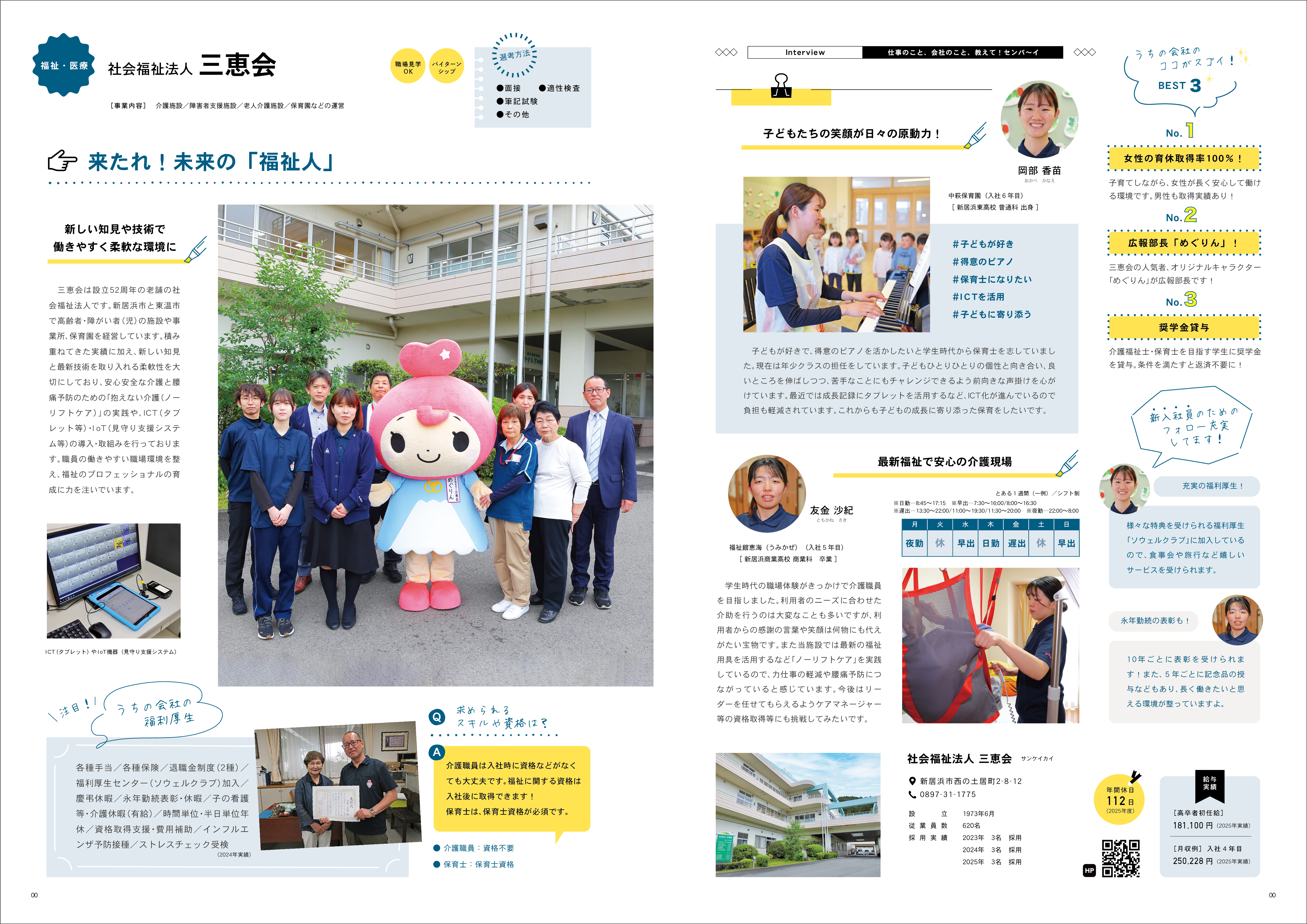 SEARCH104(サーチ東予)に掲載されました!2025年6月10日高校生と家族のための東予企業情報誌【SEARCH104(サーチ東予)】に三恵会が 掲載されました!! サーチ東予は新居浜・西条・四国中央エリアのお仕事が紹介されている「企業紹介冊子」です。 東予地域の高校に配布され、スーパーや公共施設等にも設置されています。 三恵会は、介護職員と保育士が登場していますので、皆さまぜひご覧ください!! 施設情報社会福祉法人三恵会本部三恵会は、愛媛県内10ヶ所に施設があり、乳幼児から障がいのある方、高齢者までの支援が出来る社会福祉法人です。社会福祉法人三恵会本部住所:〒792-0035 愛媛県新居浜市西の土居町2-8-12TEL(0897)31-1775 FAX(0897)31-1778三恵会本部WEBサイト最近の記事2025年10月9日「介護就職デイ」に出展します社会福祉法人 三恵会本部2025年10月7日【ひめボスNAVI】に掲載されました!社会福祉法人 三恵会本部2025年10月6日秋の採用試験情報(保育士・介護職員・生活支援員)社会福祉法人 三恵会本部2025年10月6日三恵会オリジナルキャラクター『めぐりん』です!!社会福祉法人 三恵会本部2025年10月1日児童福祉施設十全保育園大規模改修工事に係る一般競争入札のご案内社会福祉法人 三恵会本部2025年9月16日東予おしごと体験フェス2025社会福祉法人 三恵会本部三恵会本部の記事一覧