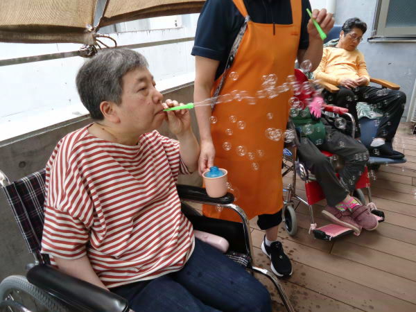 10/11 外気浴(3階)2025年10月14日 3階ウッドデッキにて、菜の花、さくらユニットの利用者様が外気浴をしながら、シャボン玉を楽しまれました。「フ~」と、上手に吹くことが難しく沢山のしゃぼん玉が出来た時には、歓声があがりました。いつもは見られない子供みたいな笑顔が見られました。 他の写真を見たい人はここをクリックしてください。 施設情報愛媛県東温市にある障害者支援施設三恵ホーム明るく楽しく元気よくみんないきいき三恵ホーム障害者支援施設 三恵ホーム〒791-0311 愛媛県東温市則之内甲2819TEL:089-966-3555 FAX:089-966-3571三恵ホームWEBサイト最近の記事2025年10月14日10/10 給食(ステーキの日)障害者支援施設 三恵ホーム2025年10月10日10/10 作品制作(2階)障害者支援施設 三恵ホーム2025年10月8日10/8 カラオケ(3階)障害者支援施設 三恵ホーム2025年10月7日10/4 作品制作(2階)障害者支援施設 三恵ホーム2025年9月23日9/23 魚釣りゲーム(3階)障害者支援施設 三恵ホーム2025年9月23日9/23 風船バレー(2階)障害者支援施設 三恵ホーム三恵ホームの記事一覧