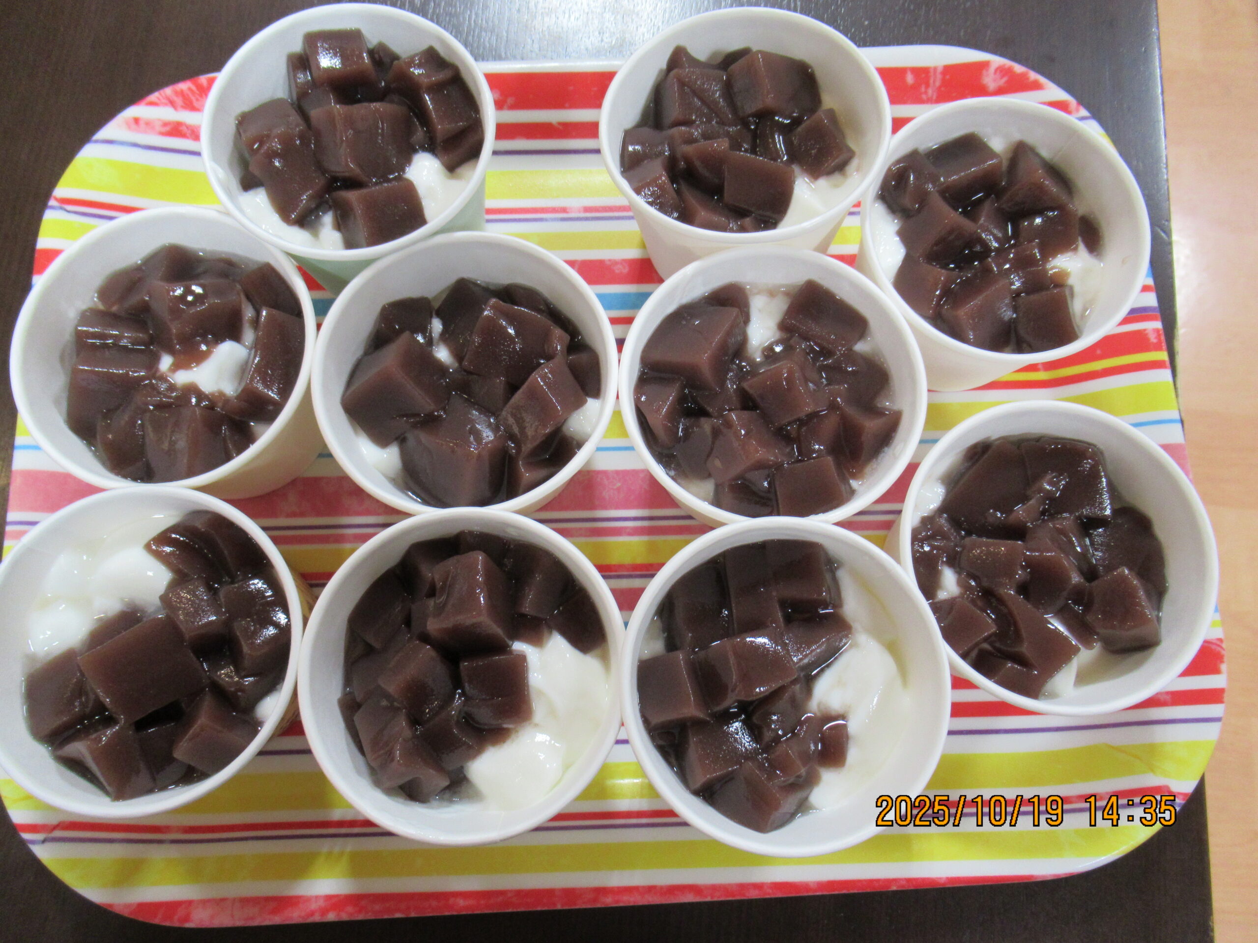 プリンに羊かんを乗せておやつを喫食(≧▽≦)