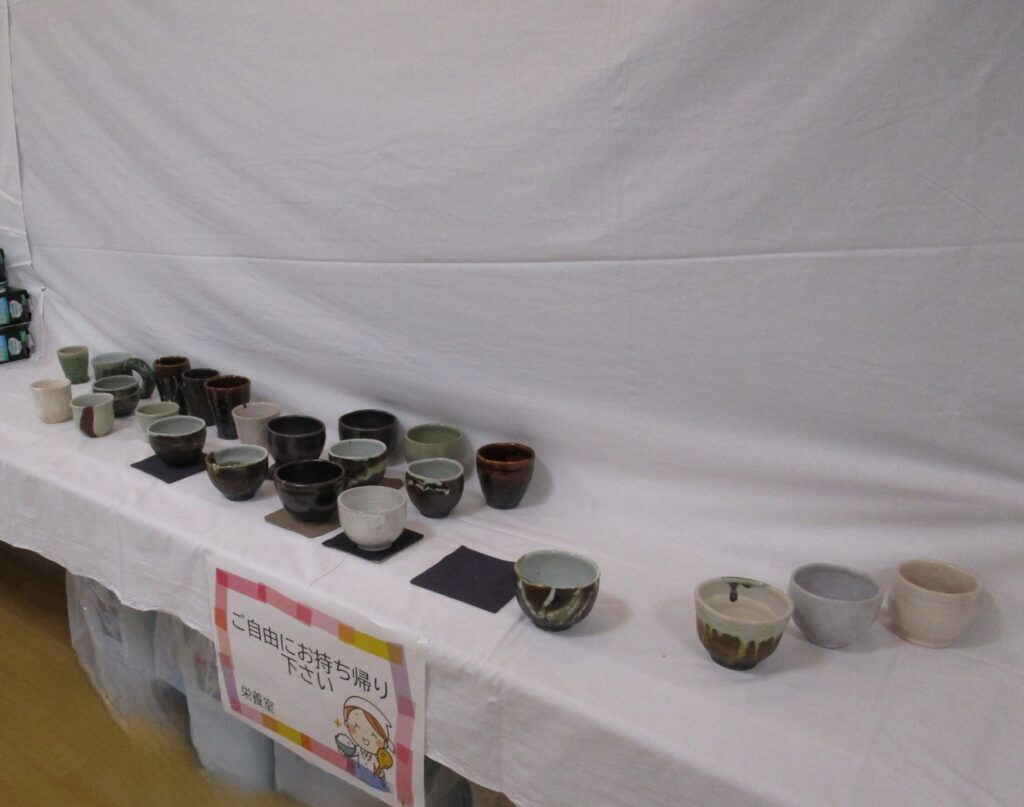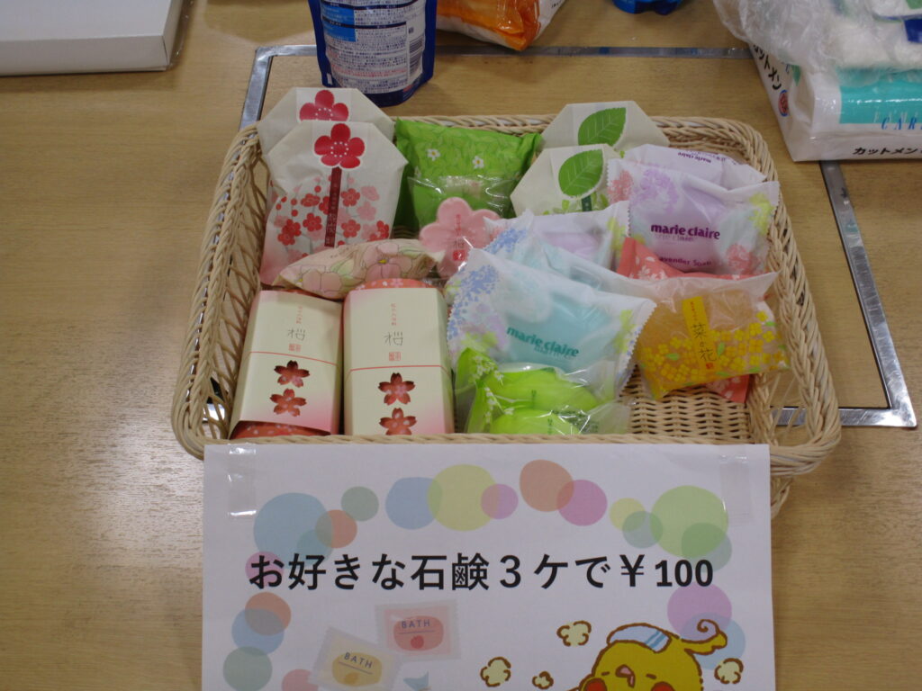 タオルや洗剤等がなんと!100円!で販売していました(人´口`) 手作りの食器がなんと!ご自由に(°o°;)!お得です!!