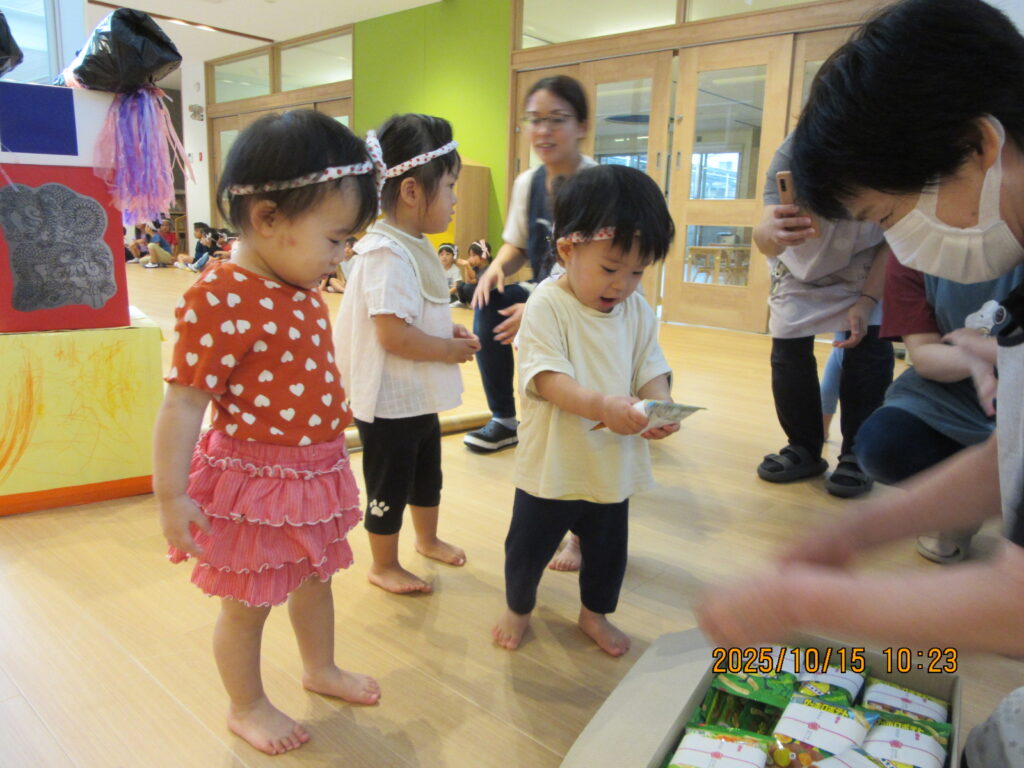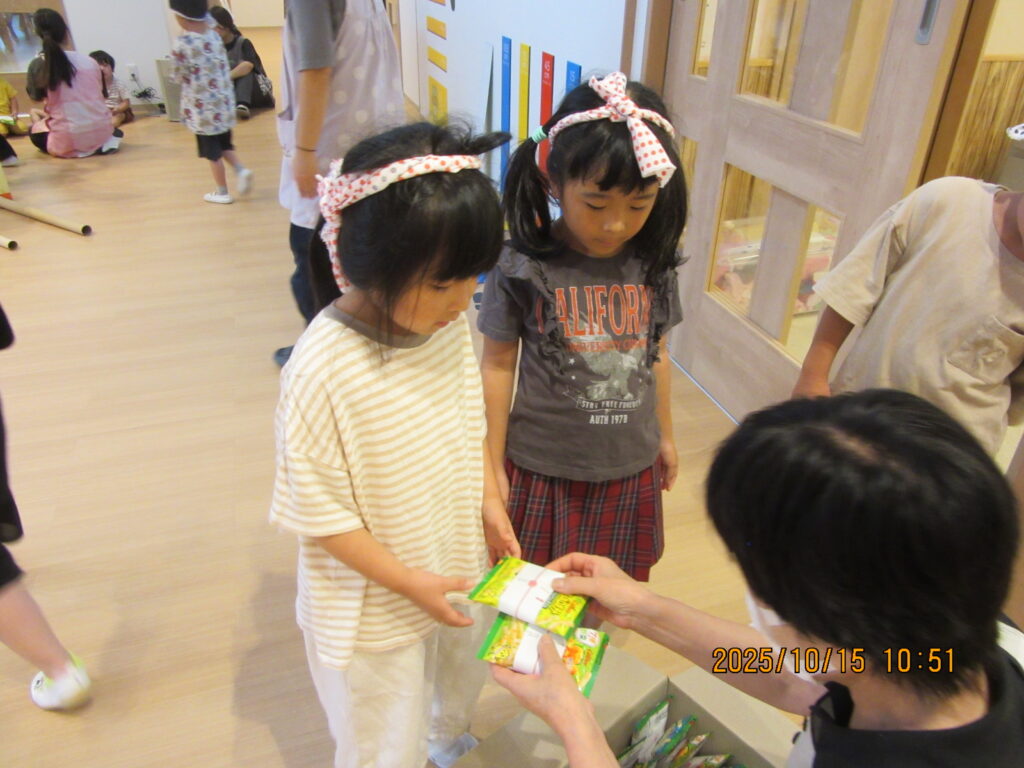 最後にはお菓子の御花をもらって大喜びの
