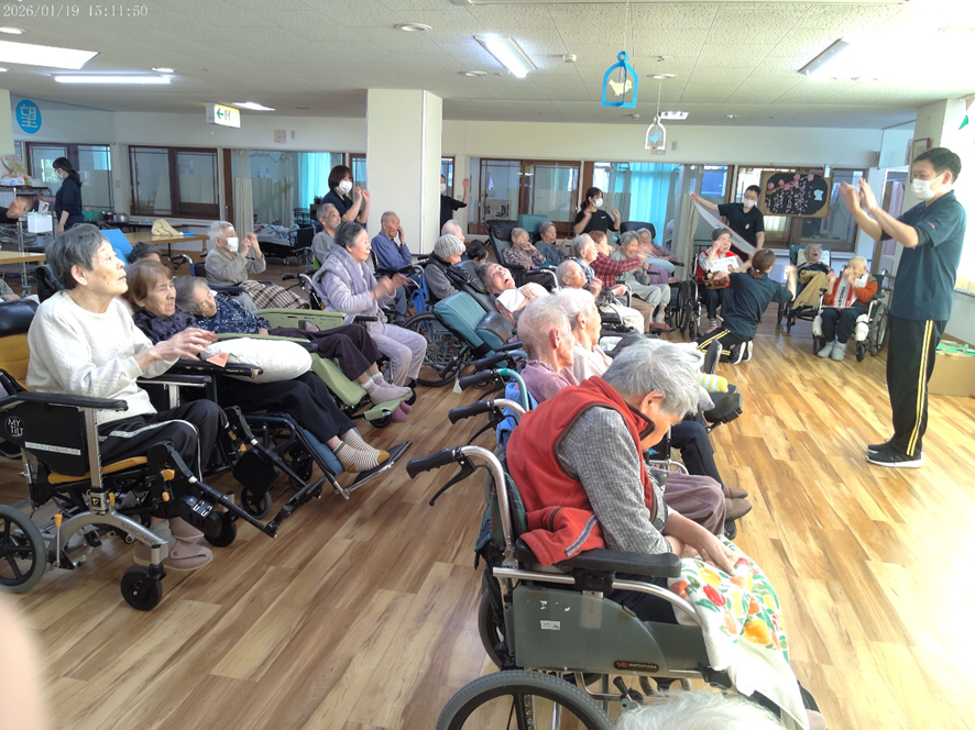 デイルームに入所者の方に集まってもらいました☺…