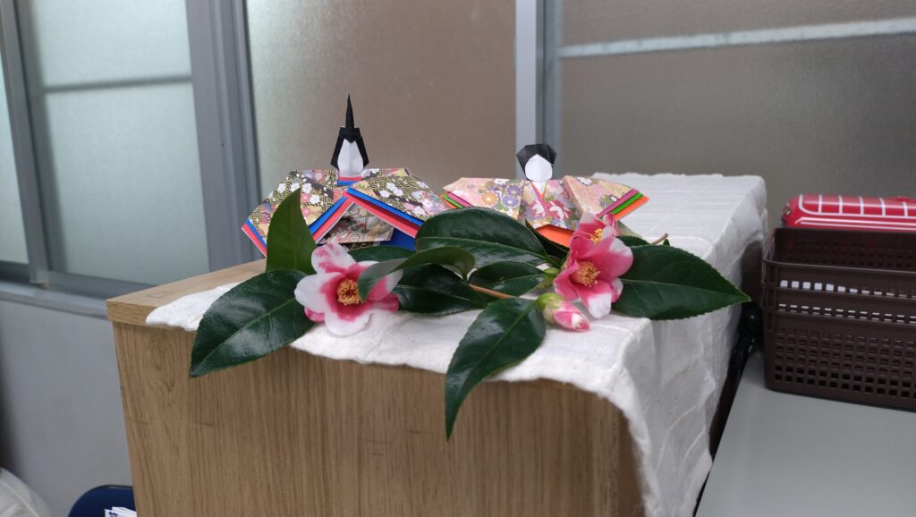 このお雛様は利用者様が作られた作品です。折り紙で上手に折られています。