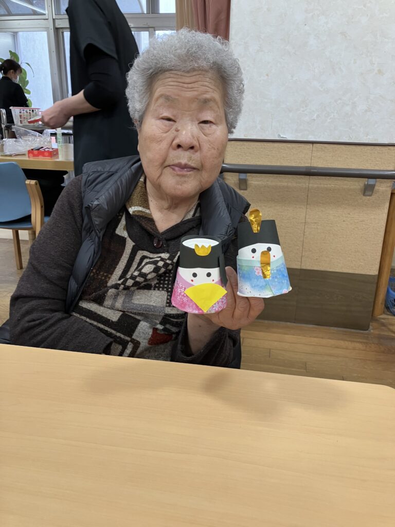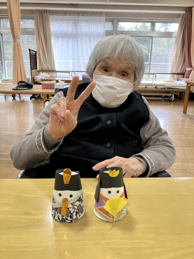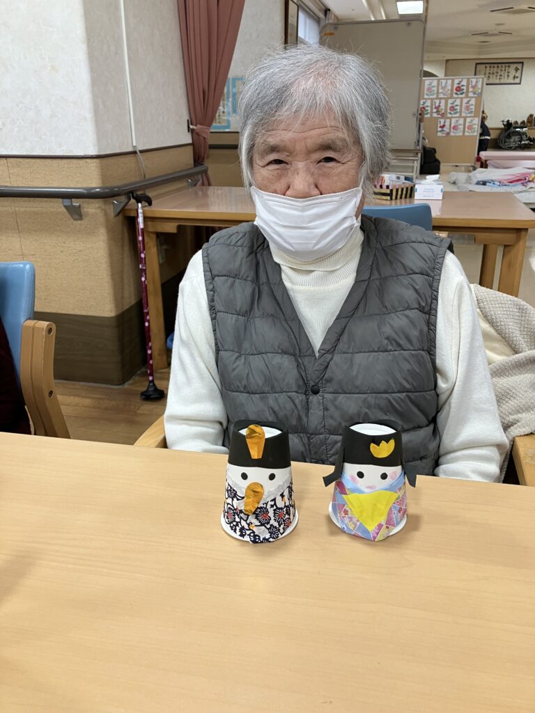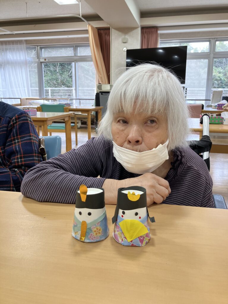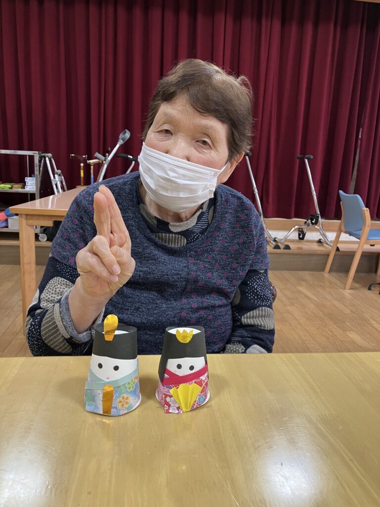 また、紙コップを使用した雛人形の工作も行いました。好きな柄の着物を選んでもらい貼ったり、切ったり、書いたり皆様真剣に作っておられました