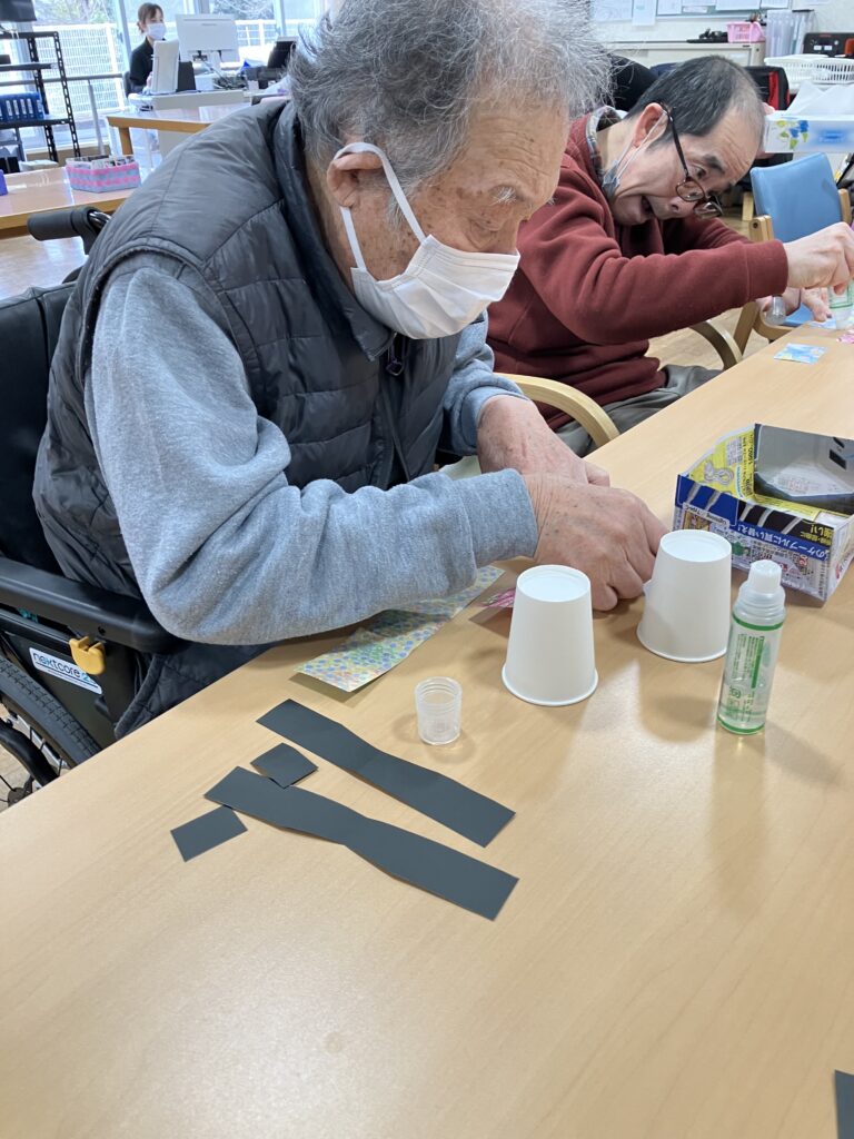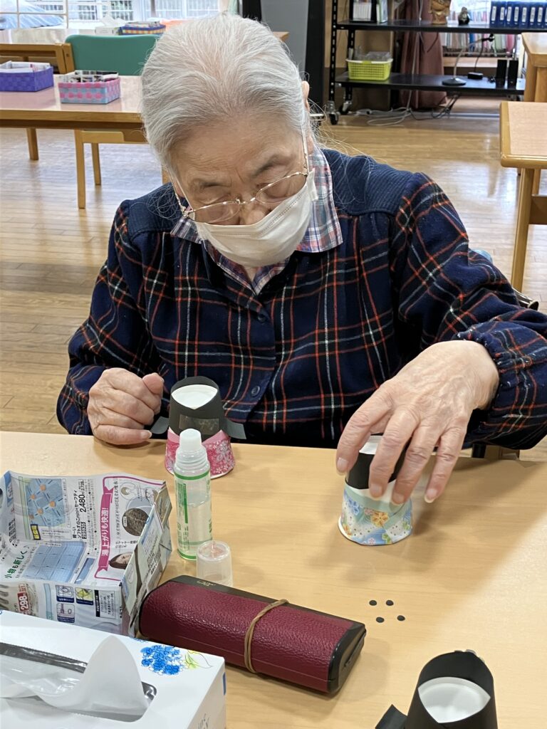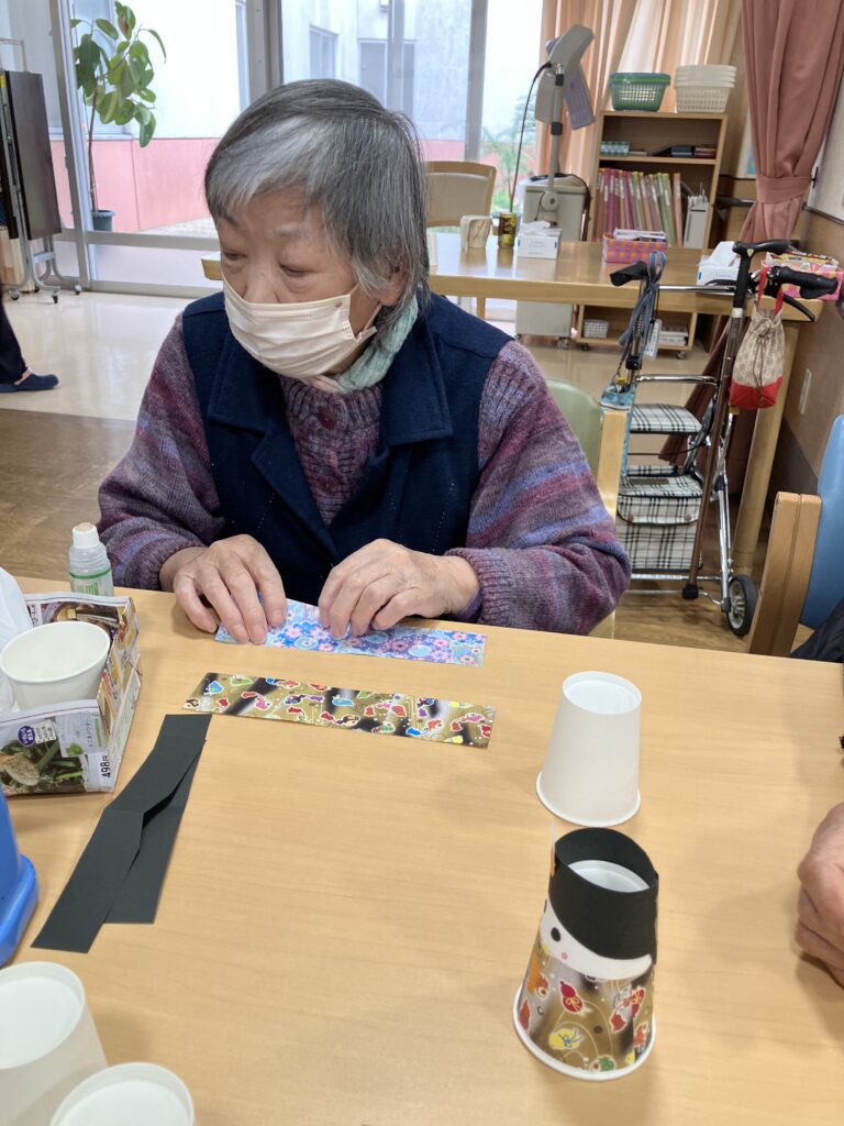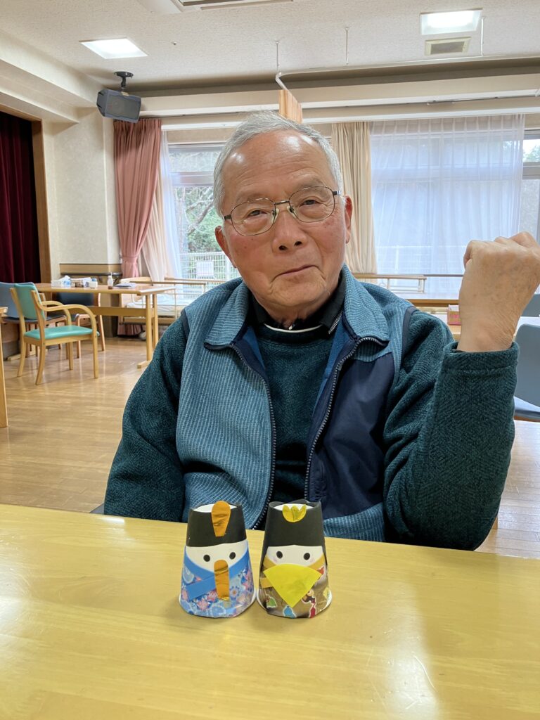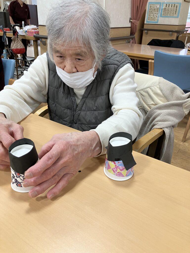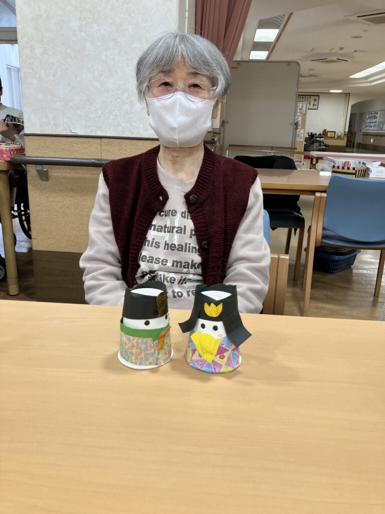 また、紙コップを使用した雛人形の工作も行いました。好きな柄の着物を選んでもらい貼ったり、切ったり、書いたり皆様真剣に作っておられました