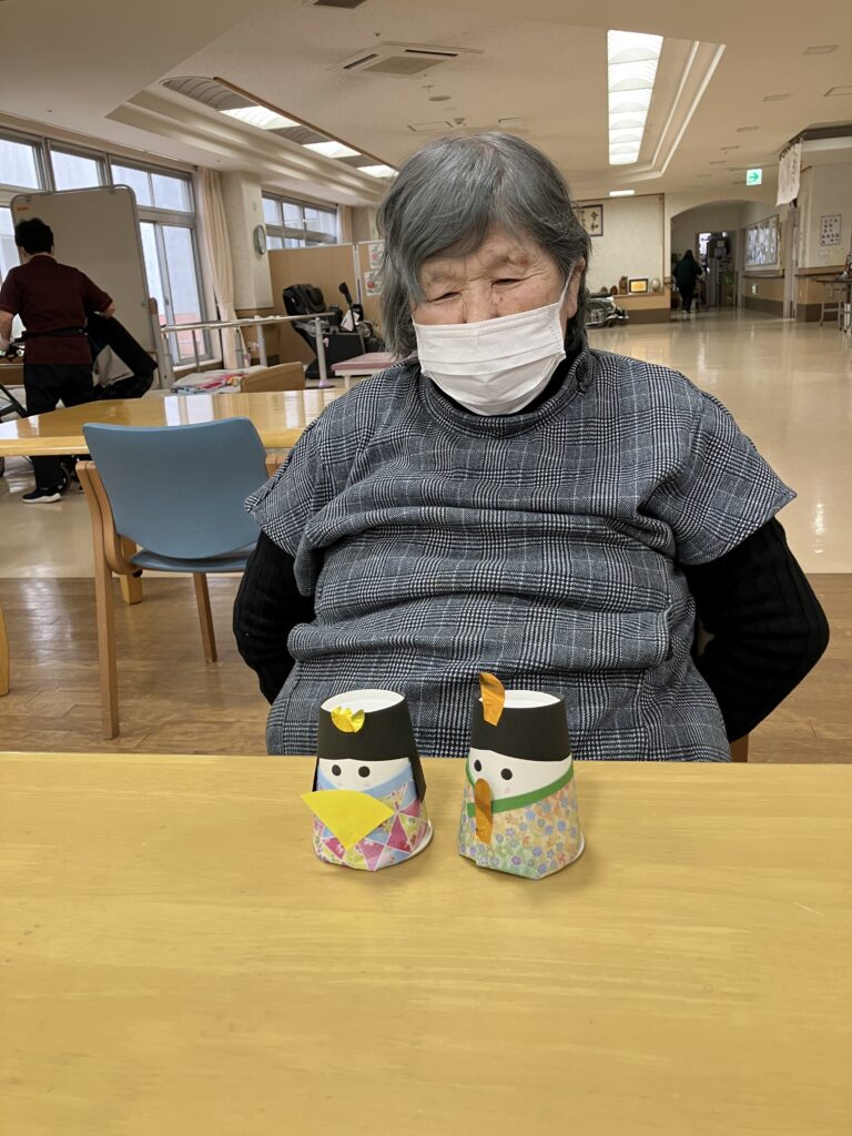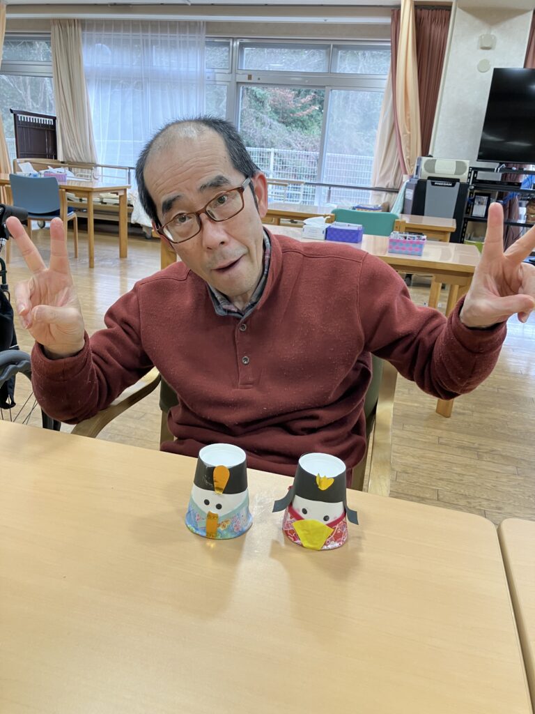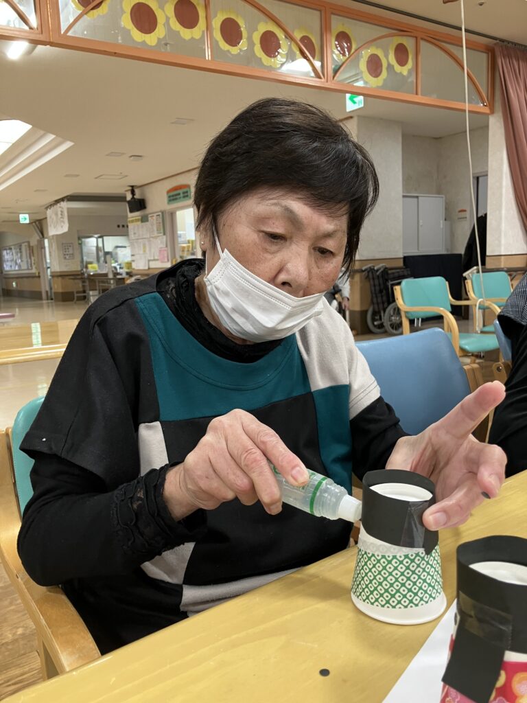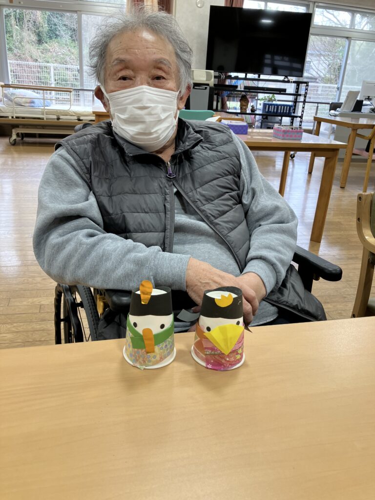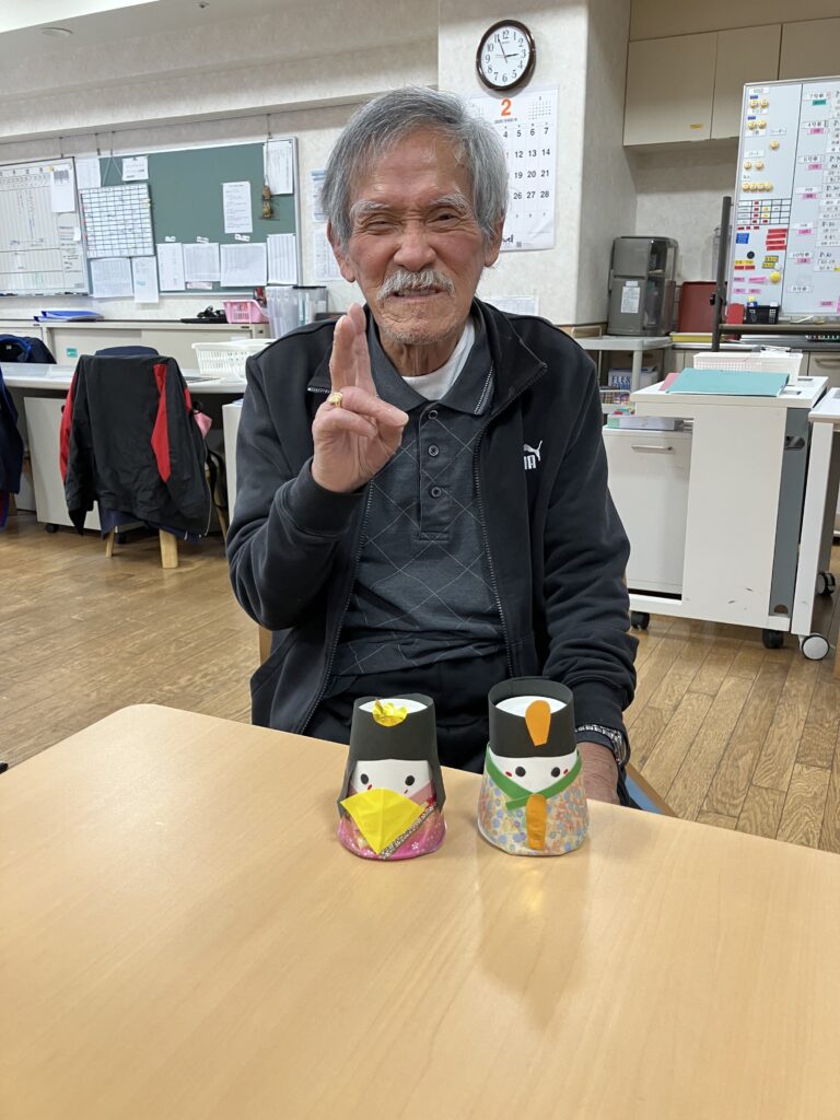 また、紙コップを使用した雛人形の工作も行いました。好きな柄の着物を選んでもらい貼ったり、切ったり、書いたり皆様真剣に作っておられました