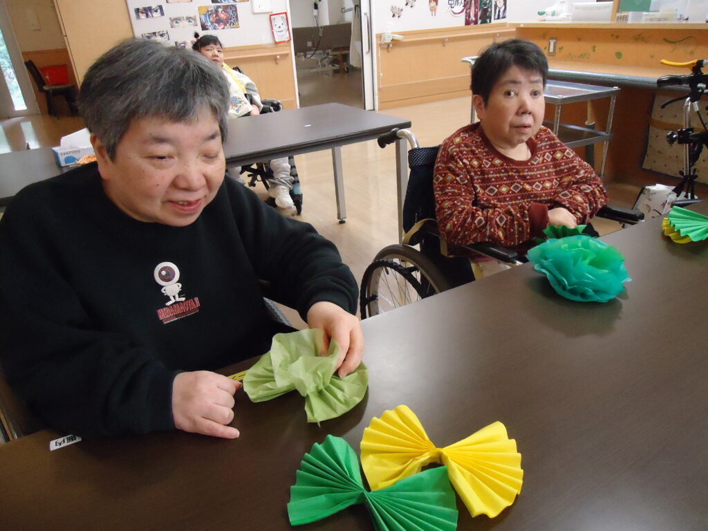 3階の作品制作ではフロアを飾る壁画のための作業を続けています。利用者様が作ってくれた作品を使い、壁画は日に日に完成に近づいています!今日は花紙でお花を作りました。これは壁画のどの部分になるのでしょうか?