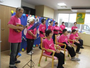 お手玉を使ったリズム体操で、利用者の皆さんと手足を動かしたり、一緒に歌を歌ったりと、