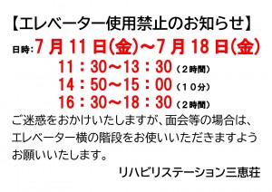 エレベーター使用禁止のお知らせ2025年7月2日いつもお世話になっております。 7月11日より厨房用エレベーターの工事があります。 それに伴い、下記の時間帯のエレベーター使用を禁止させていただきます。 ご迷惑お掛けいたしますが、今後ともよろしくお願いします。 施設情報愛媛県新居浜市にある介護老人保健施設三恵荘拡げよう繋がり深まる信頼、ともに歩む喜び・思いやり。温かい心でスマイルケア介護老人保健施設 リハビリステーション三恵荘 〒792-0050 愛媛県新居浜市萩生河の北67-60TEL:0897-40-3366 FAX:0897-40-3360三恵荘WEBサイト最近の記事2025年10月7日指定居宅介護支援事業所 三恵 ケアマネ便りリハビリステーション 三恵荘2025年9月24日敬老会のお祝いリハビリステーション 三恵荘2025年9月17日敬老の日行事食☆リハビリステーション 三恵荘2025年9月11日長寿のお祝いリハビリステーション 三恵荘2025年9月3日指定居宅介護支援事業所 三恵 ケアマネ便りリハビリステーション 三恵荘2025年8月27日通所リハビリセンター 三恵荘リハビリステーション 三恵荘三恵荘の記事一覧