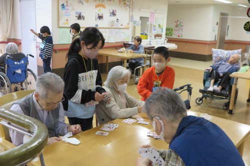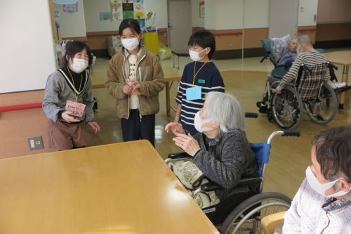 西谷小学校との交流2024年12月6日 12月3日(火)に西谷小学校の3・4年生が校外学習で来てくれました。 福祉体験の一環として、利用者様とカードゲームや絵しりとりなどをして コミュニケーションを楽しみました。 高齢者施設をはじめて訪れた生徒さんもいらっしゃったと思いますが、 みなさんコミュニケーション取り方が自然で、 笑顔も見られ、驚きました。 利用者の皆さんも とてもうれしそうでした(^0^) 西谷小学校の皆様、ありがとうございました。 施設情報愛媛県東温市にある老人保健施設希望の館身の回りのお世話から心のケアまで、トータルなサポートを心がけています。介護老人保健施設 希望の館〒791-0311 愛媛県東温市則之内甲2783-1TEL:089-960-6336 FAX:089-966-1239希望の館WEBサイト最近の記事2025年10月23日空室状況のお知らせ(10月23日)介護老人保健施設 希望の館2025年10月9日空室状況のお知らせ(10月9日)介護老人保健施設 希望の館2025年10月8日地方祭のご案内介護老人保健施設 希望の館2025年9月26日空室状況のお知らせ(9月26日)介護老人保健施設 希望の館2025年9月22日やかた祭り 第4弾介護老人保健施設 希望の館2025年9月20日やかた祭り 第3弾介護老人保健施設 希望の館希望の館の記事一覧