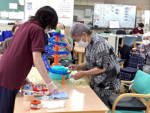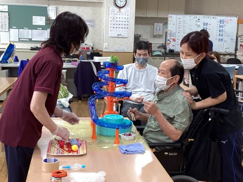 そうめん流しゲーム2025年9月11日 そうめん流しの器械を使って 毛糸やピンポンボールなど 色々なものを流して、 上手くつかめるかというゲームを行いました。 箸をうまく操作するという意味では手のリハビリにもなります。 皆さん上手につかめていらっしゃいました(^^)/ 施設情報愛媛県東温市にある老人保健施設希望の館身の回りのお世話から心のケアまで、トータルなサポートを心がけています。介護老人保健施設 希望の館〒791-0311 愛媛県東温市則之内甲2783-1TEL:089-960-6336 FAX:089-966-1239希望の館WEBサイト最近の記事2025年10月9日空室状況のお知らせ(10月9日)介護老人保健施設 希望の館2025年10月8日地方祭のご案内介護老人保健施設 希望の館2025年9月26日空室状況のお知らせ(9月26日)介護老人保健施設 希望の館2025年9月22日やかた祭り 第4弾介護老人保健施設 希望の館2025年9月20日やかた祭り 第3弾介護老人保健施設 希望の館2025年9月18日やかた祭り 第2弾介護老人保健施設 希望の館希望の館の記事一覧