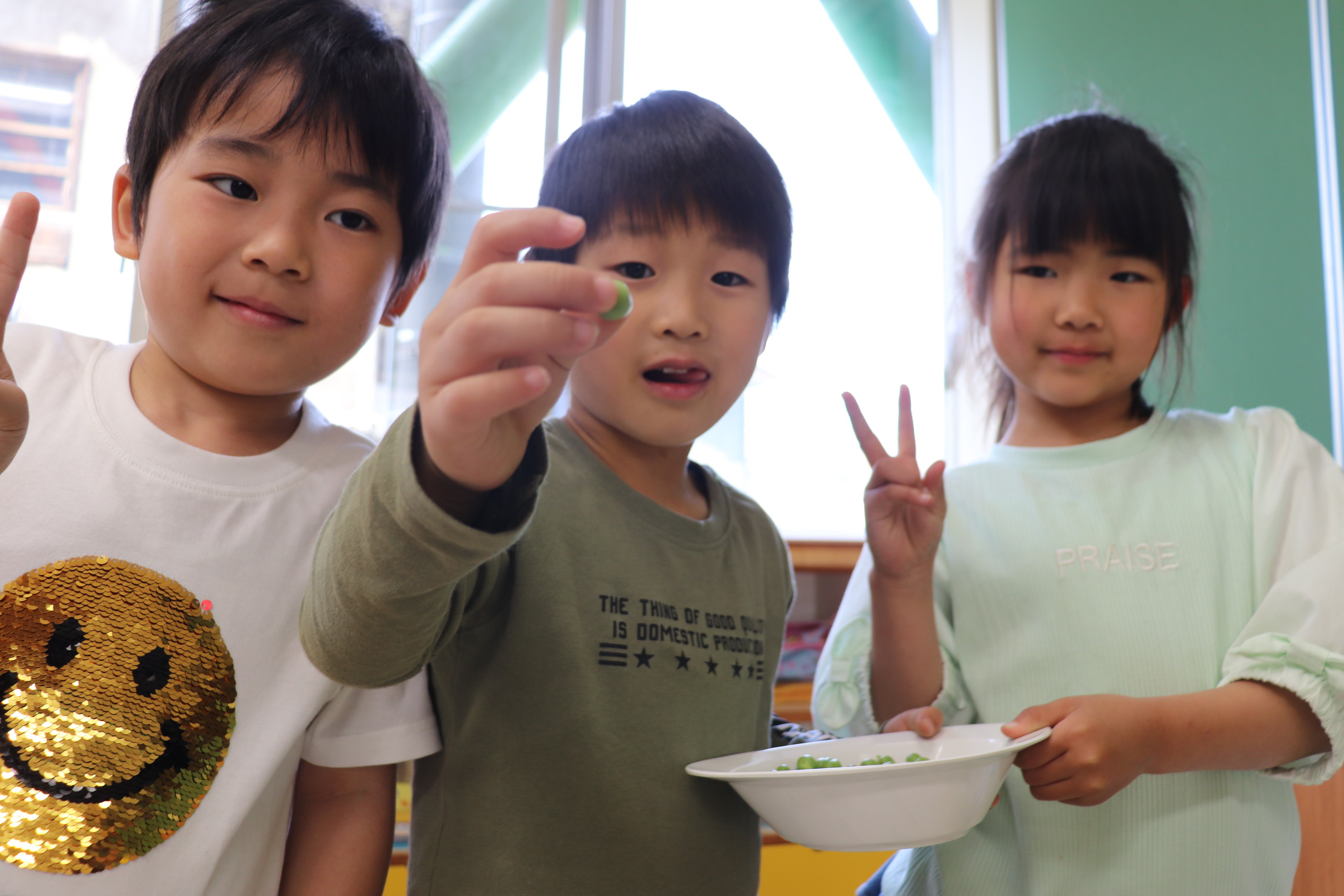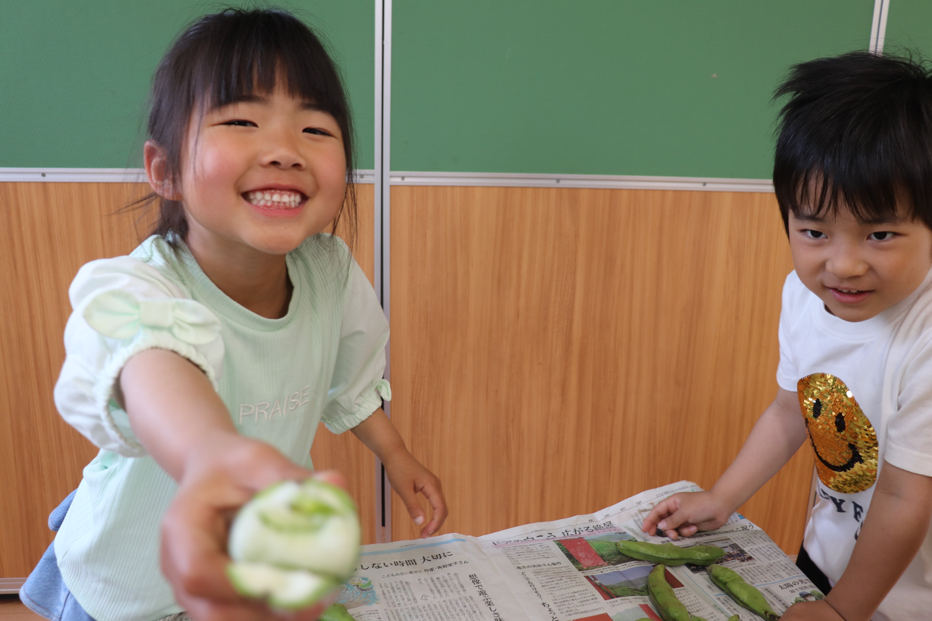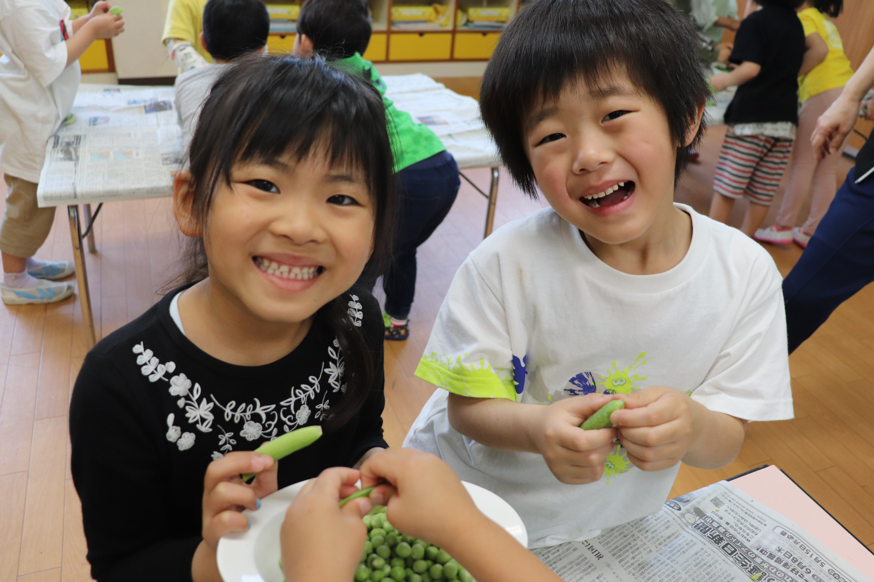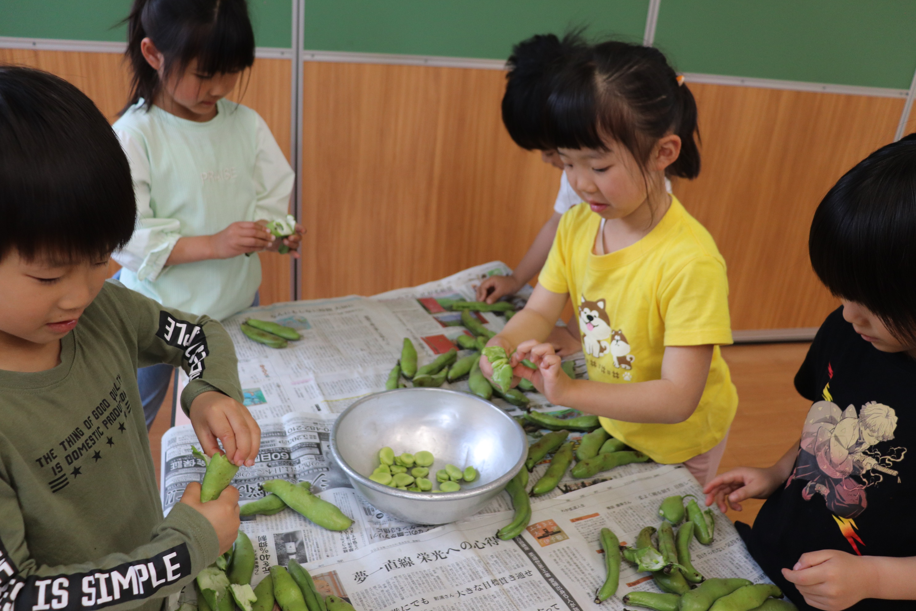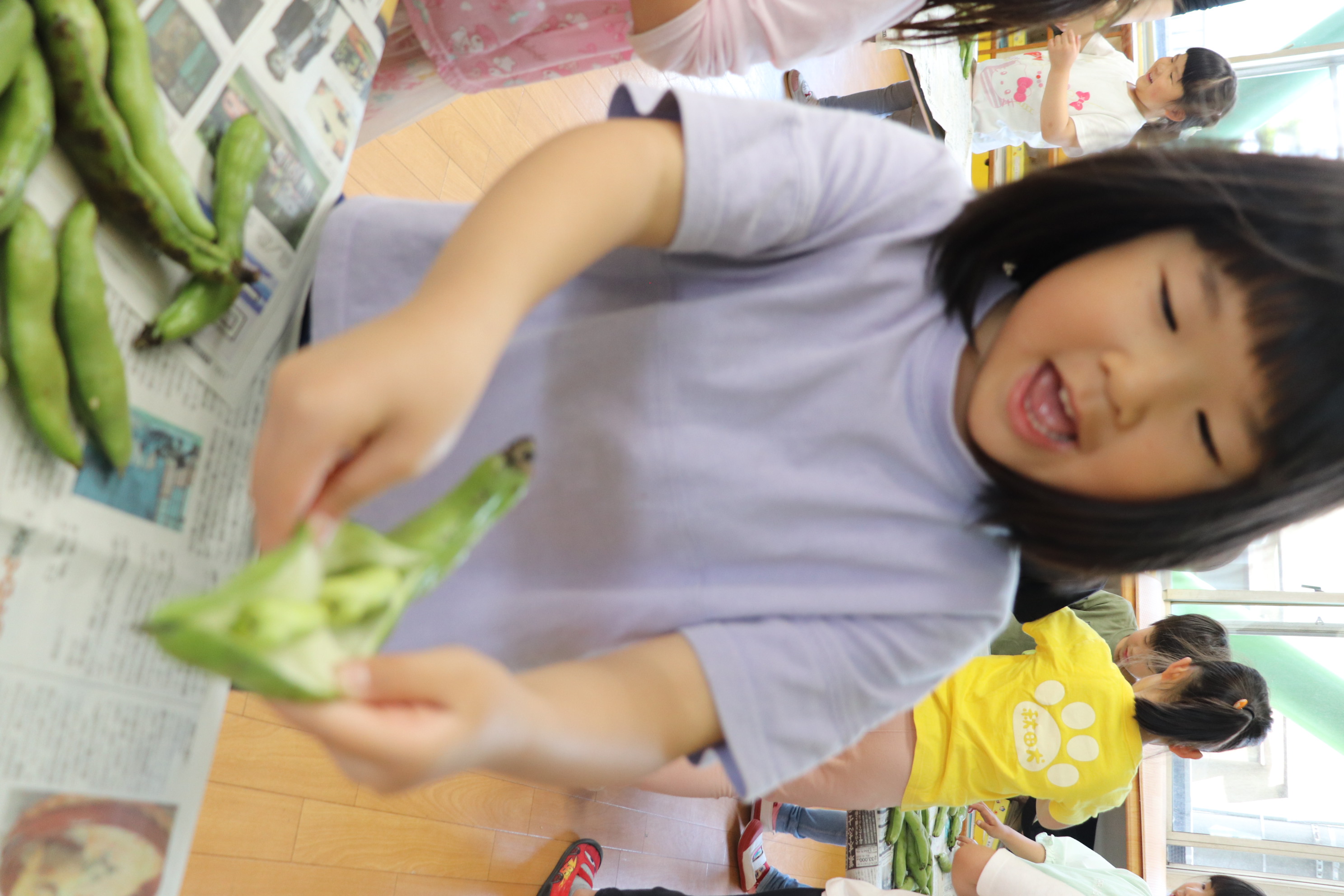 年長児さんたちにそら豆とグリーンピースの皮むきを手伝ってもらいました!!皮の中がどうなっているのか興味を示しながら、「大きい豆だ~!」「こっちはちっちゃい豆がでてきた~!」などと出てくる豆をみてはたくさんの反応を言葉にしていた子どもたちでした(*^_^*) 年長児クラスになって、いろいろな経験ができ毎日なんだか楽しそうなひまわり組さんです♪