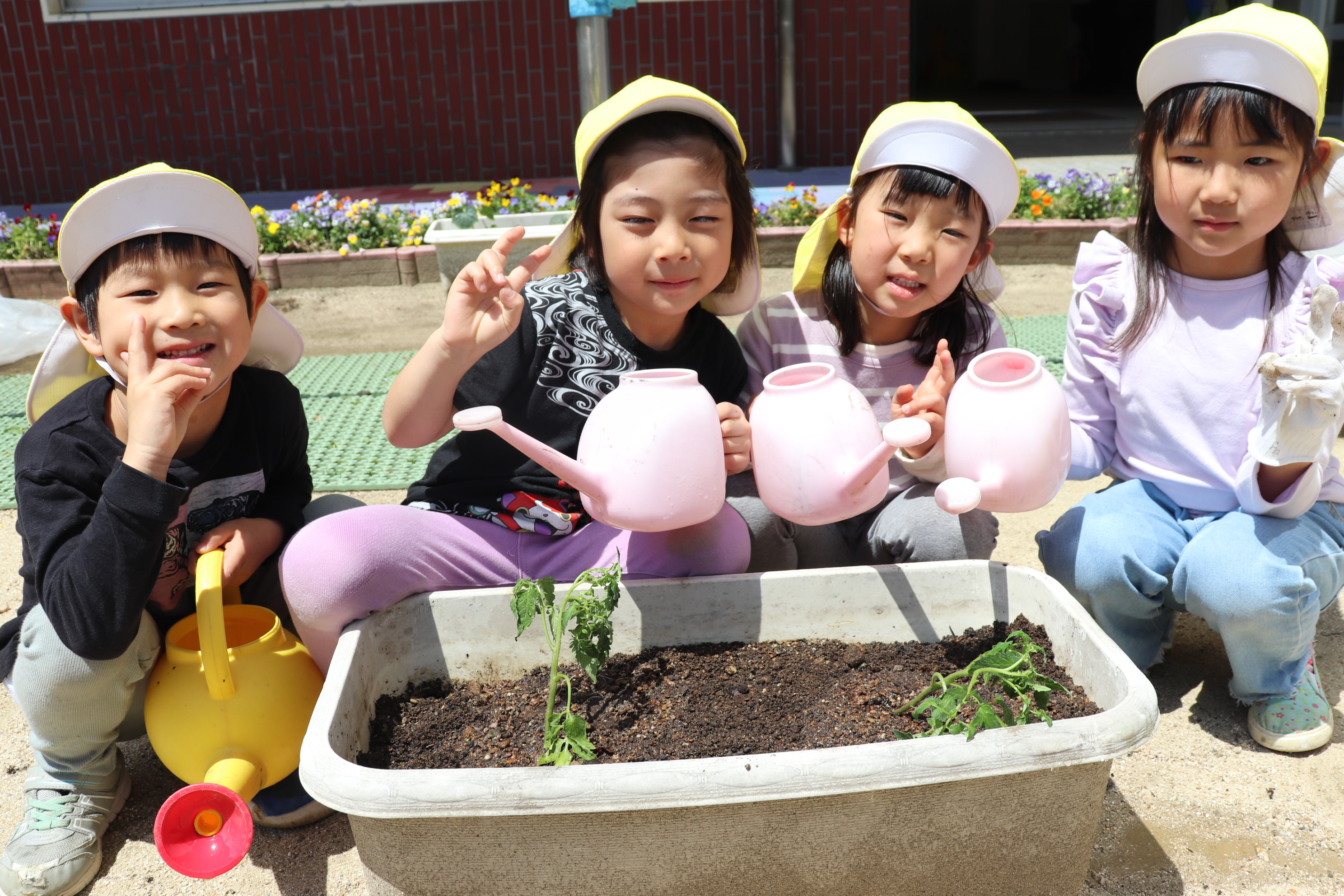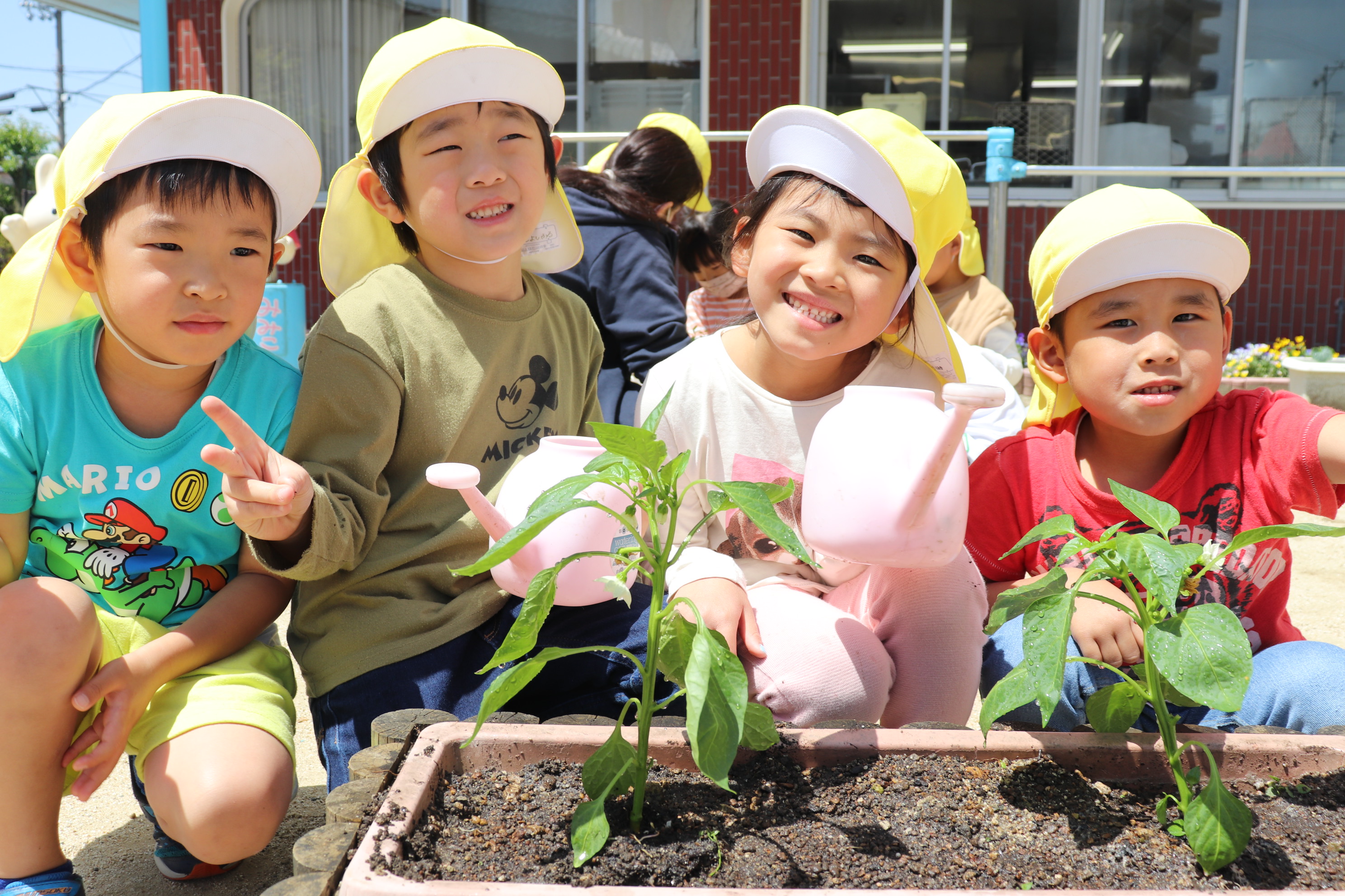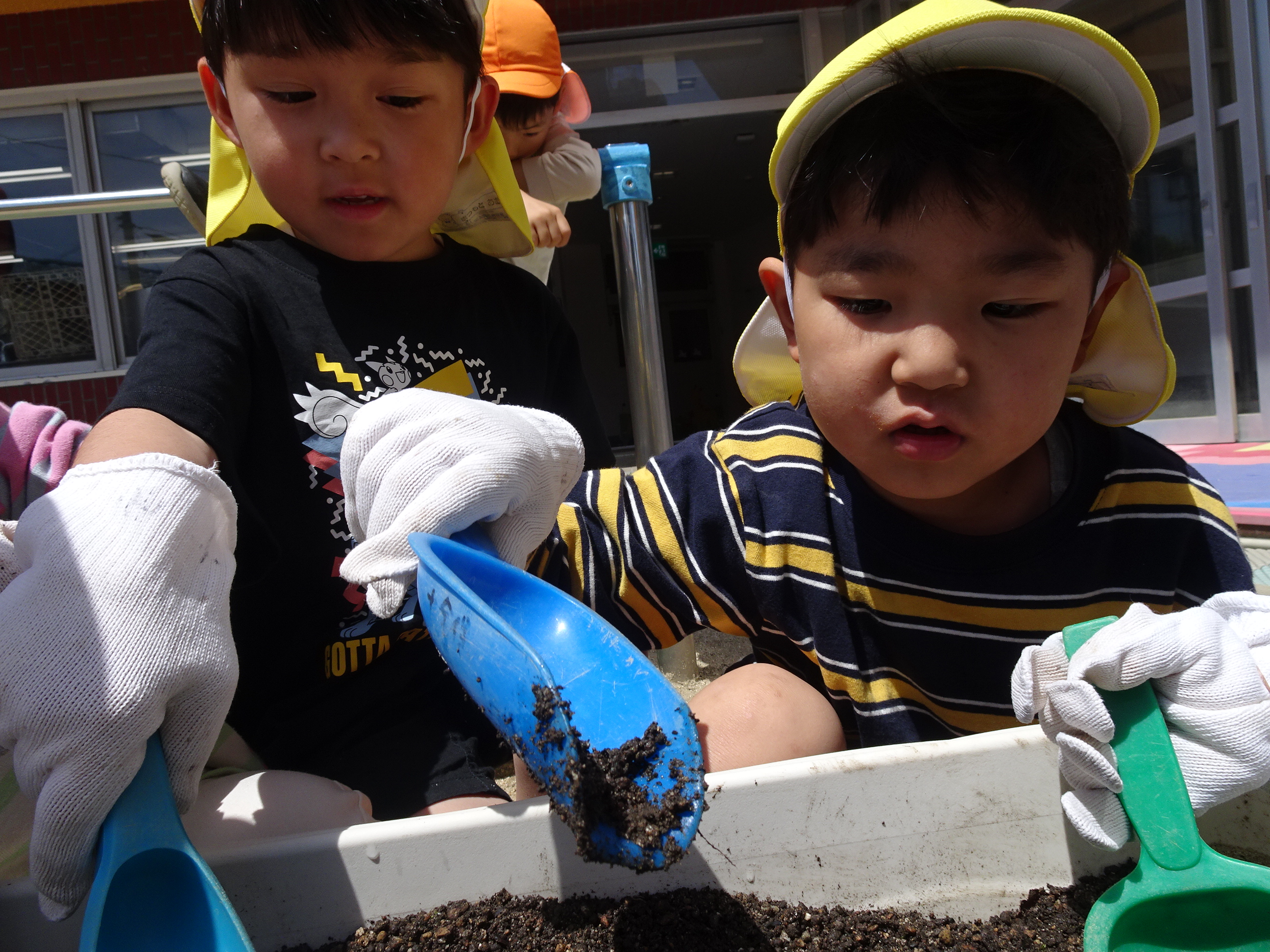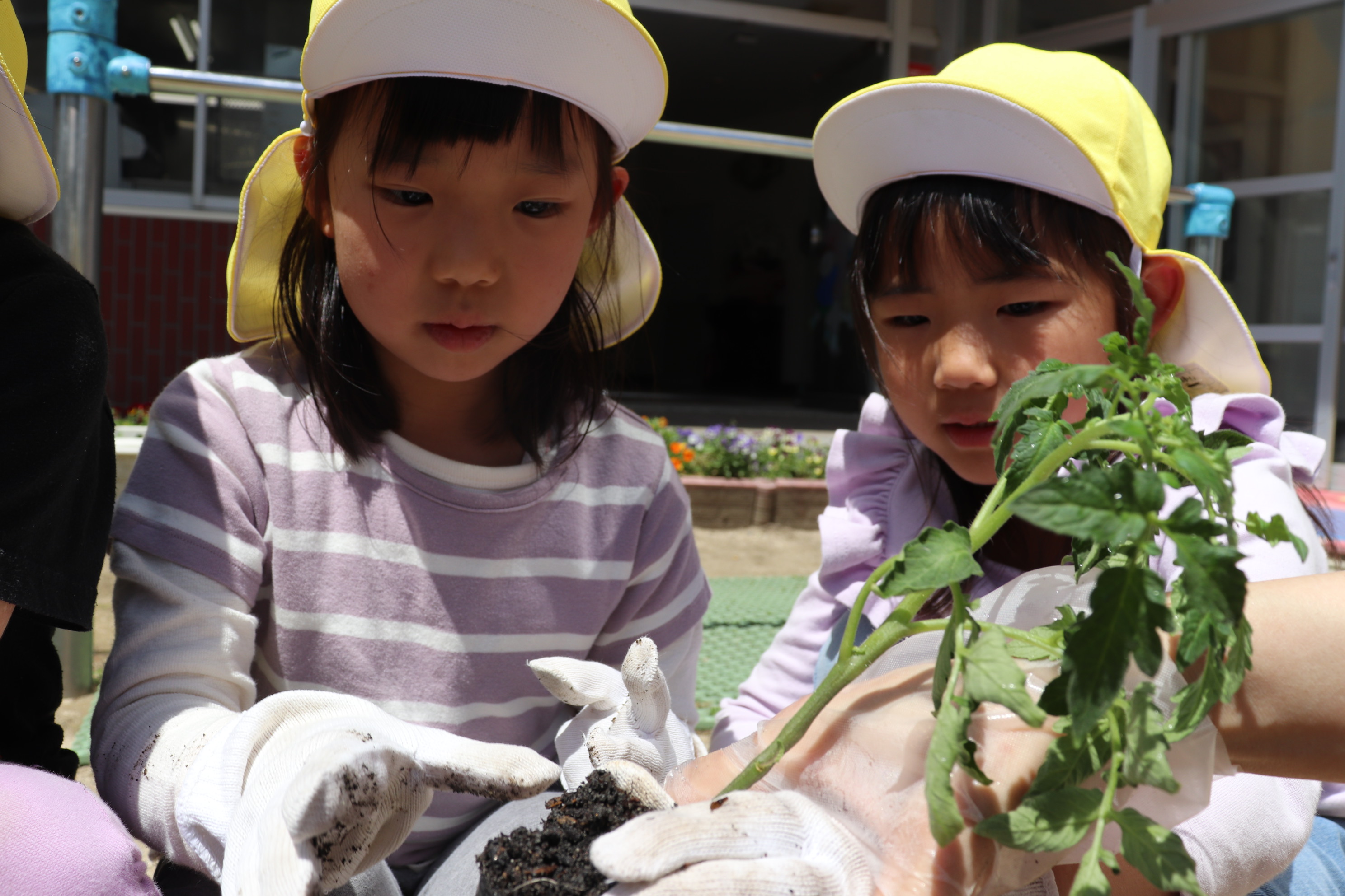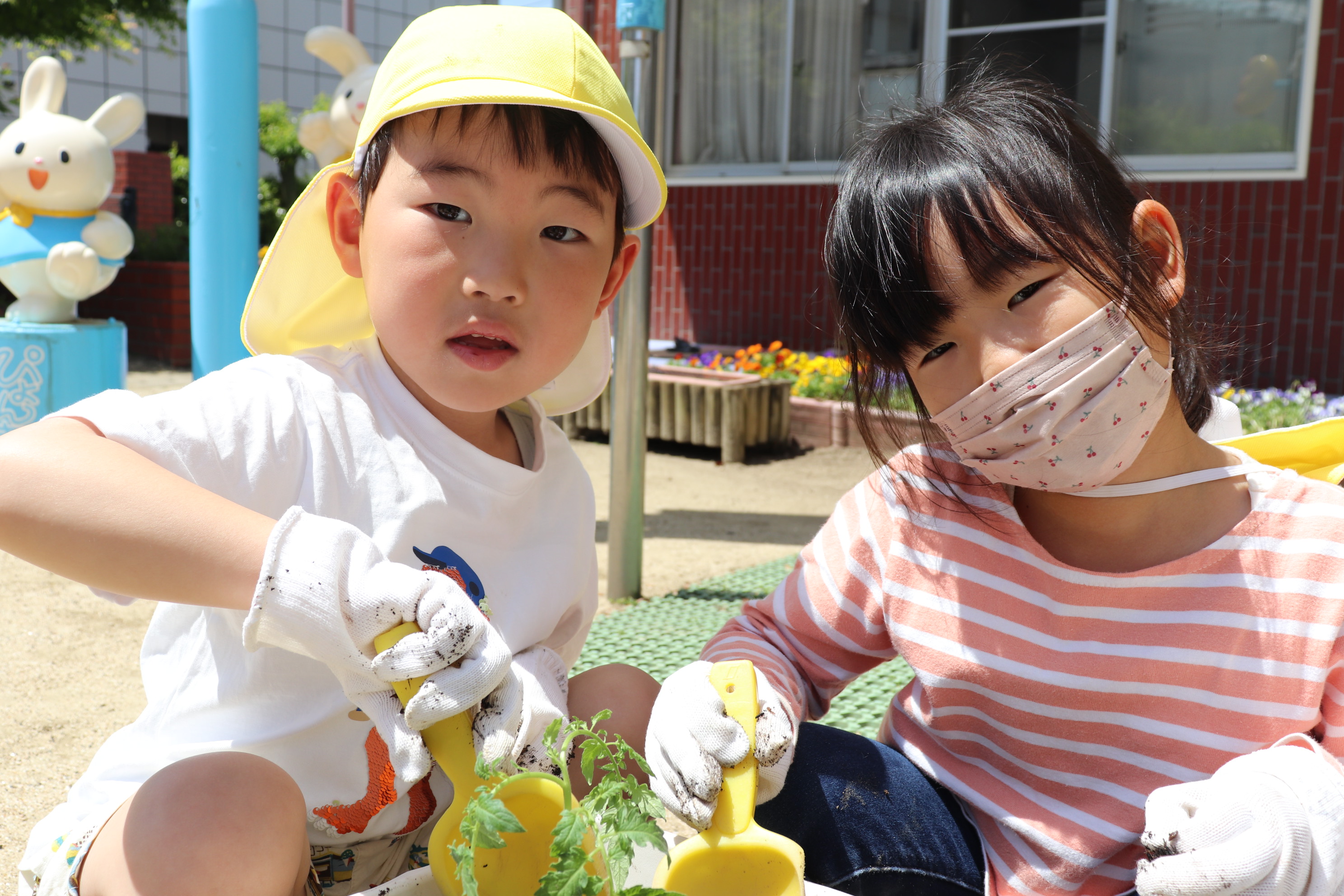 園庭に夏野菜の苗を植えました!「これは、ピーマン?」と苗をみて何の野菜の苗なのか考えてみたり、「これは、きゅうりの苗だよ。」と教えてもらうと、葉っぱを観察してみたりと子ども達なりに興味を持って保育士の話を聞いてくれていました。ひまわり組さん達には、これから水やり係を任せて、お世話も頑張ってもらいたいと思います!夏には、たくさんの収穫ができるといいね~♡