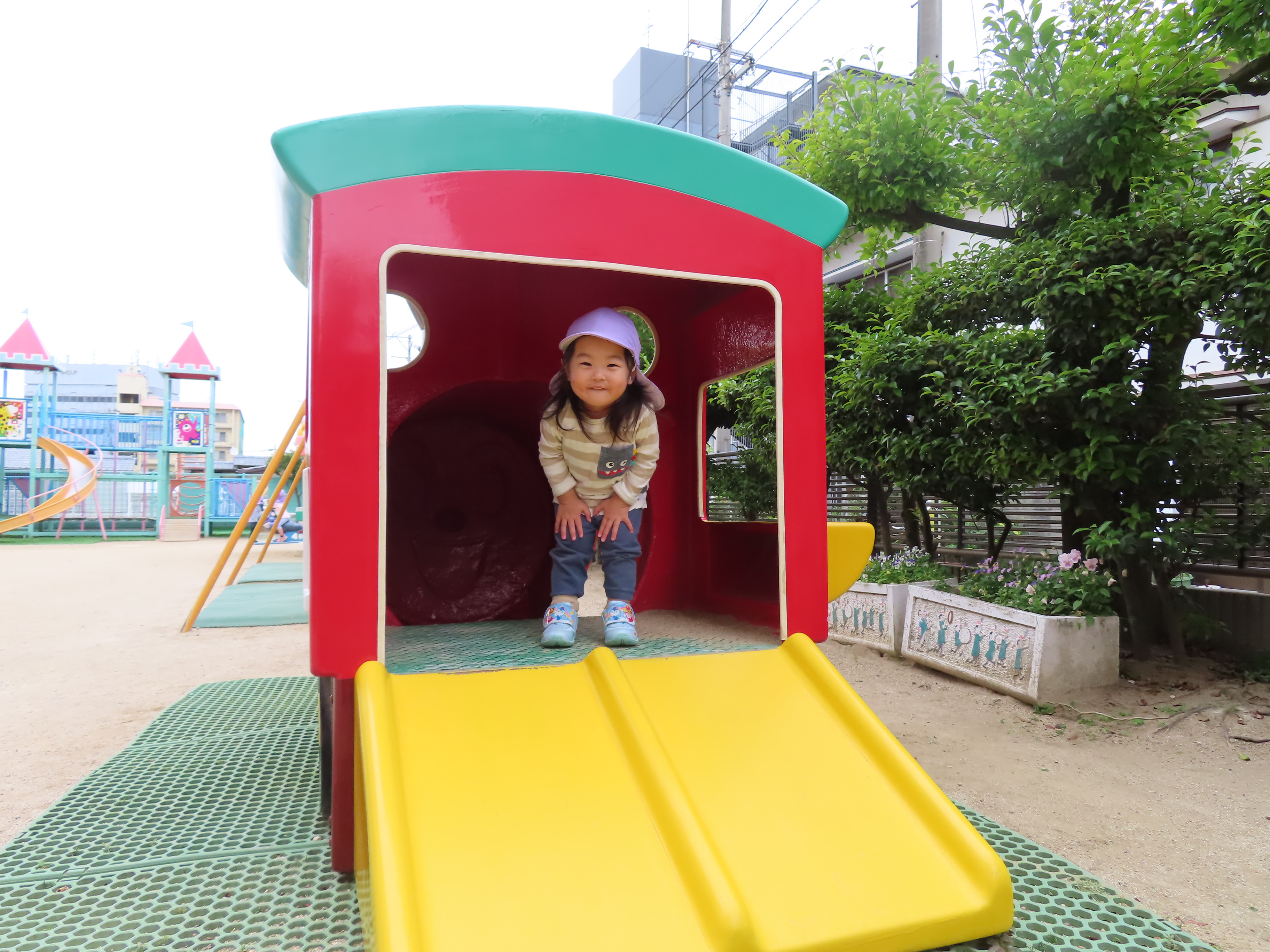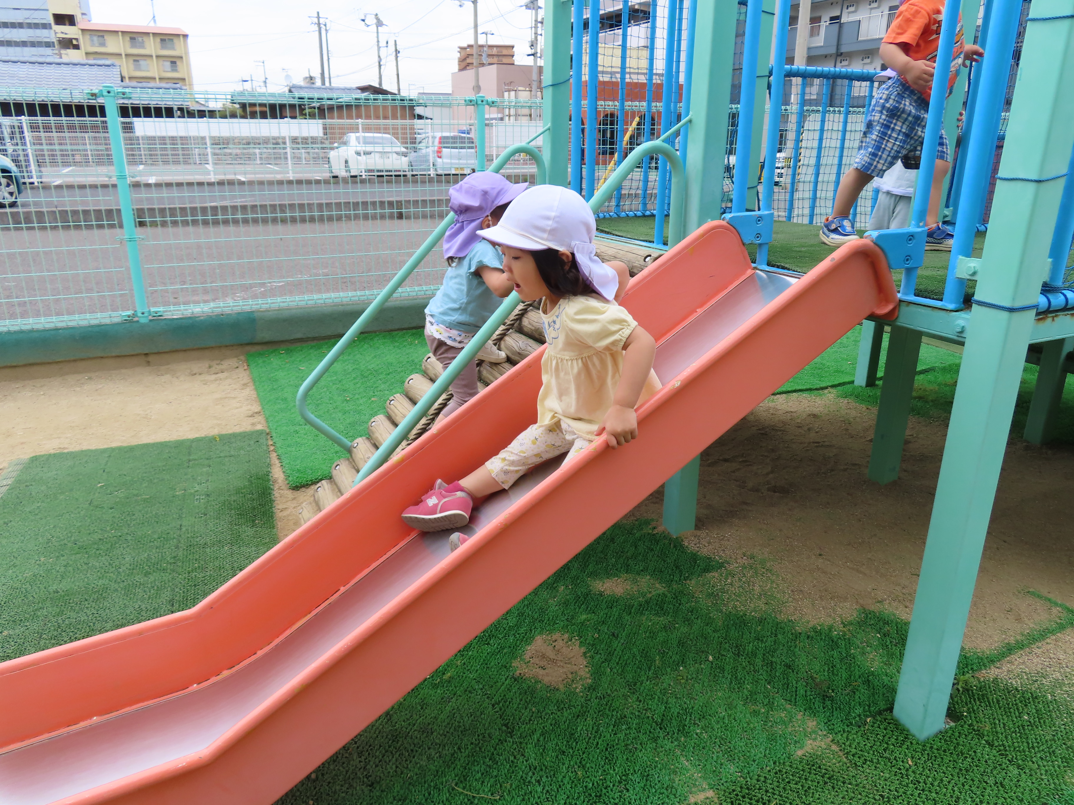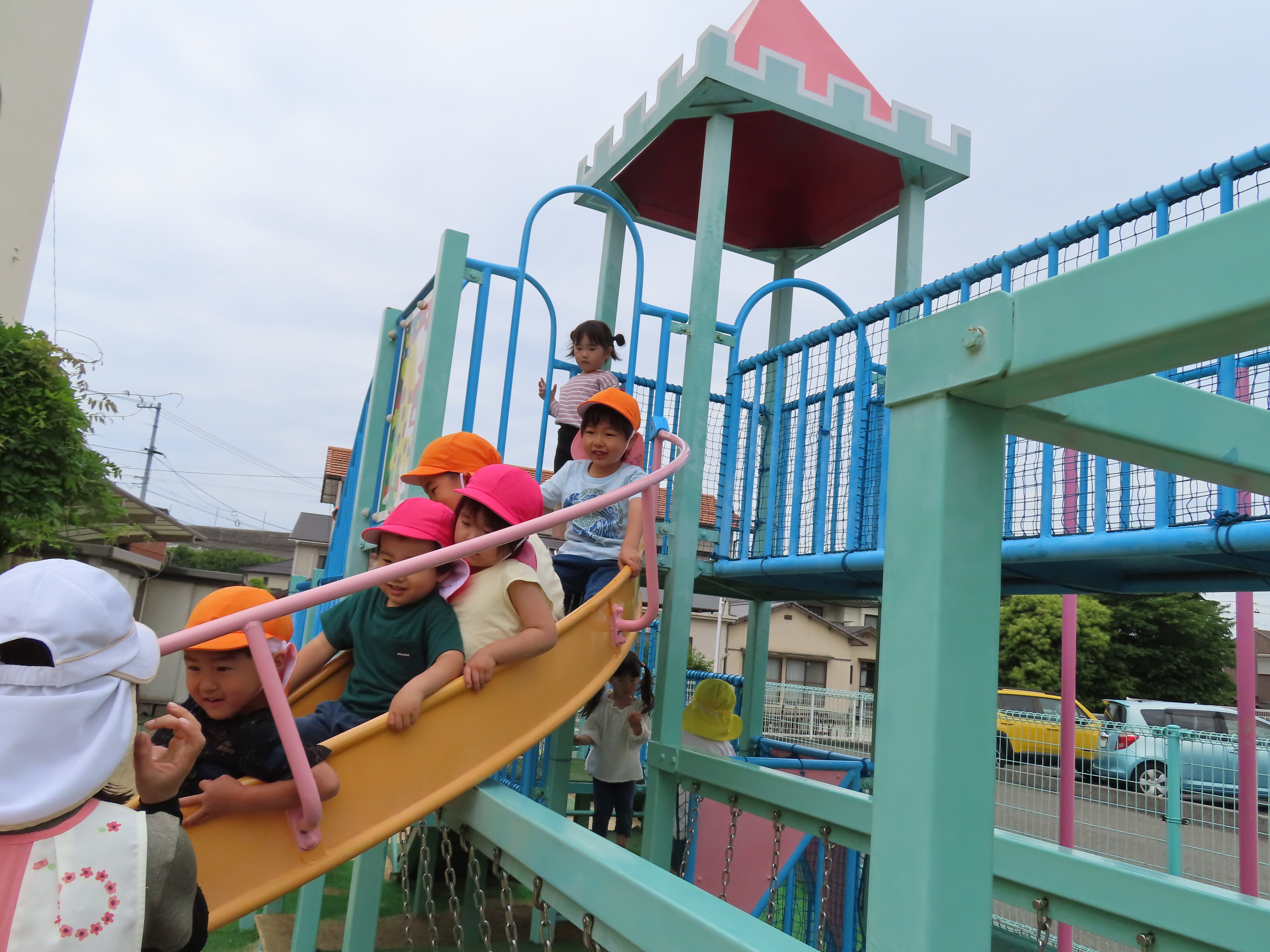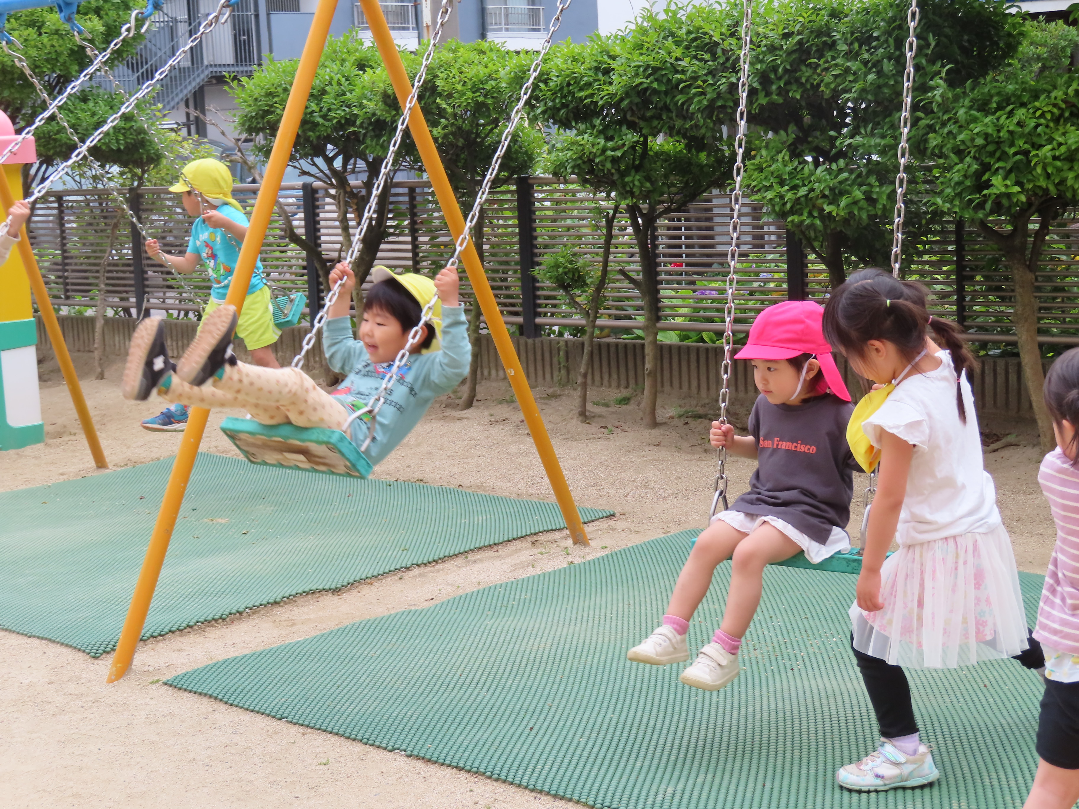 園庭での様子です(*^_^*) 色々な年齢の子どもたちが、園庭で遊んでいるので、幼児さんが小さい子のブランコを優しく押してあげたり、小さい子がいる間は、幼児さん達はブランコを我慢してくれて、小さい子の安全を確保してくれたりもしています。 ダンゴムシを探したり、かけっこをしたり遊具で遊んだりと元気に体を動かして外遊びを楽しんでいますよ(^^)/