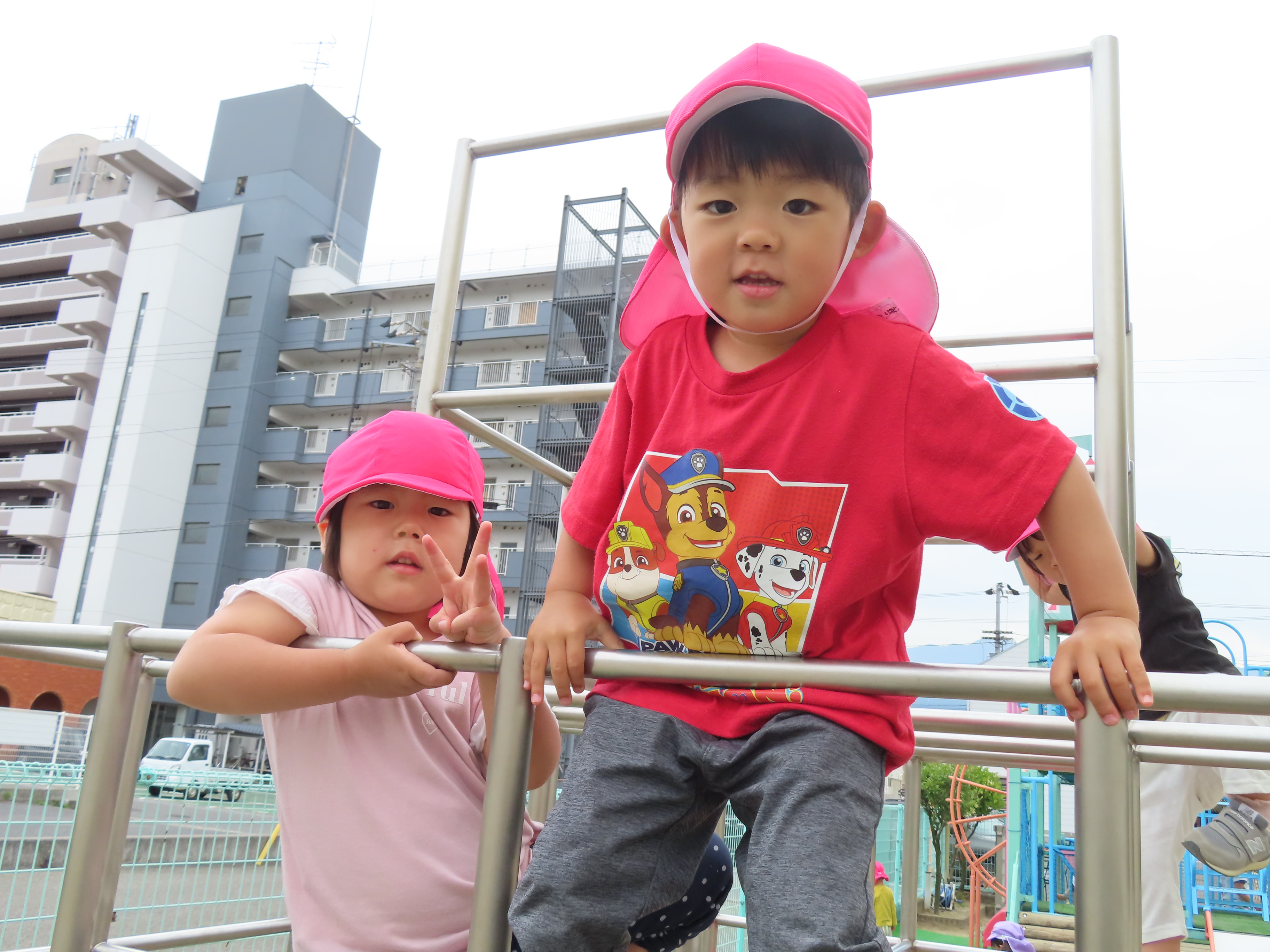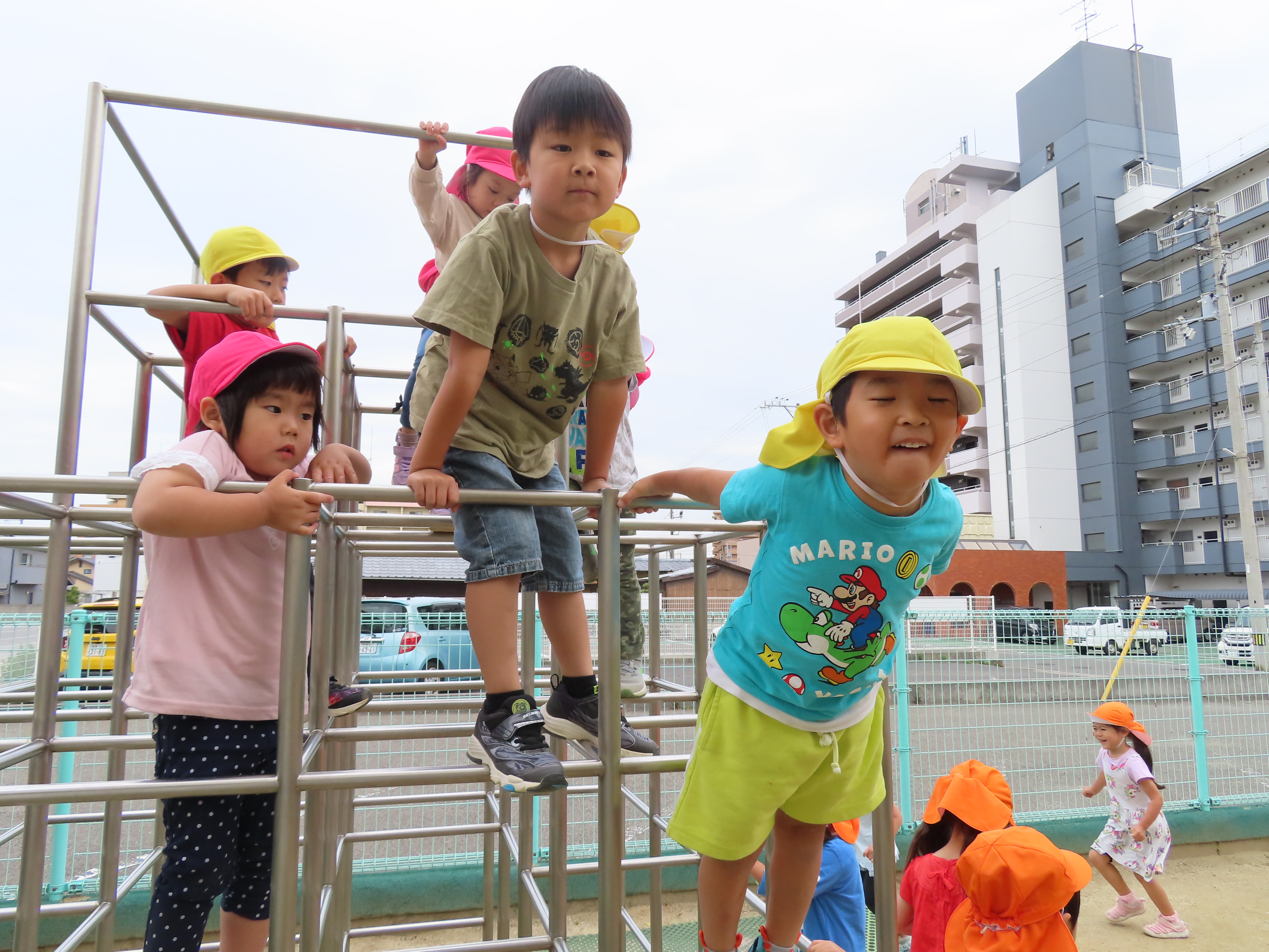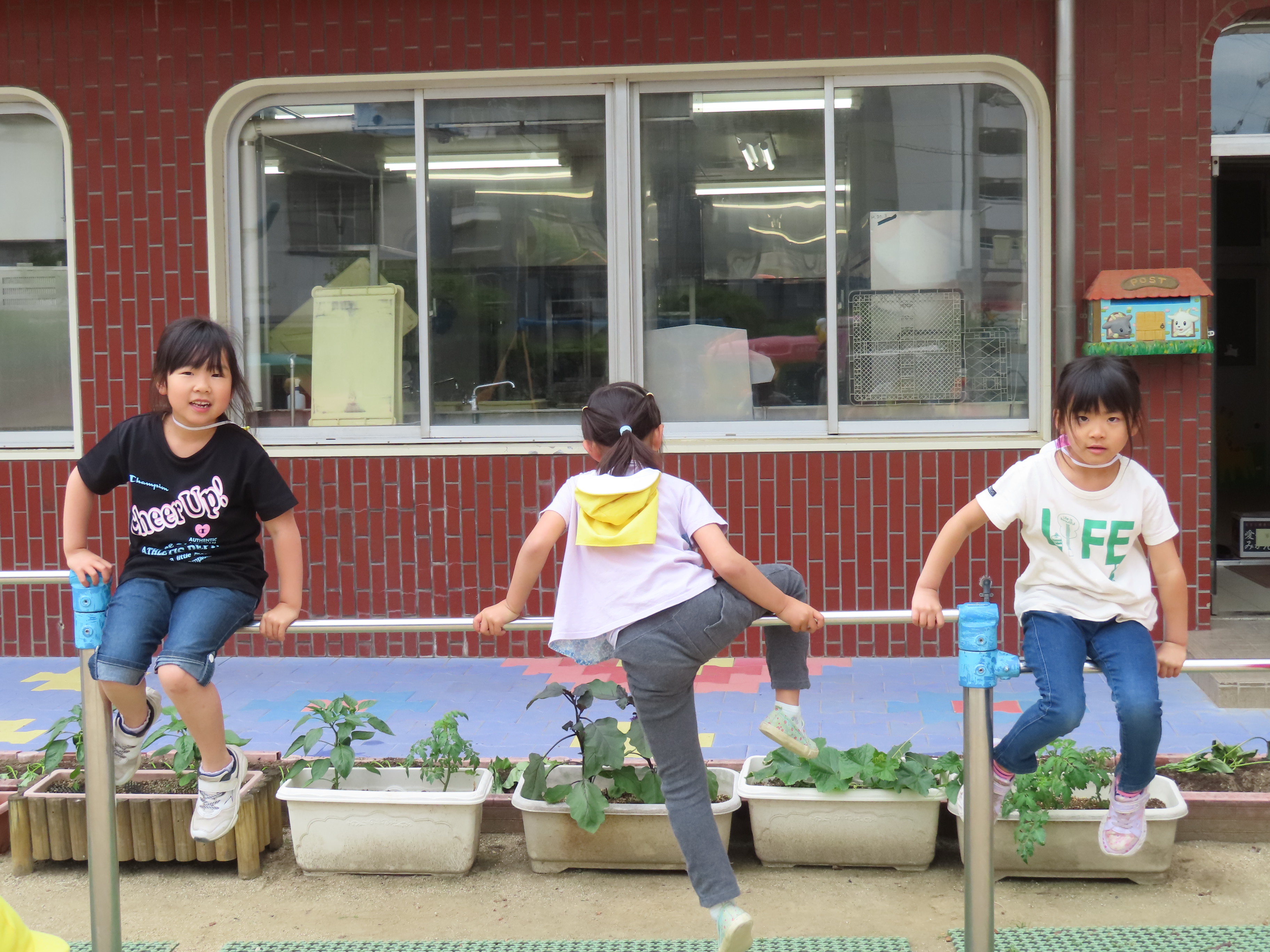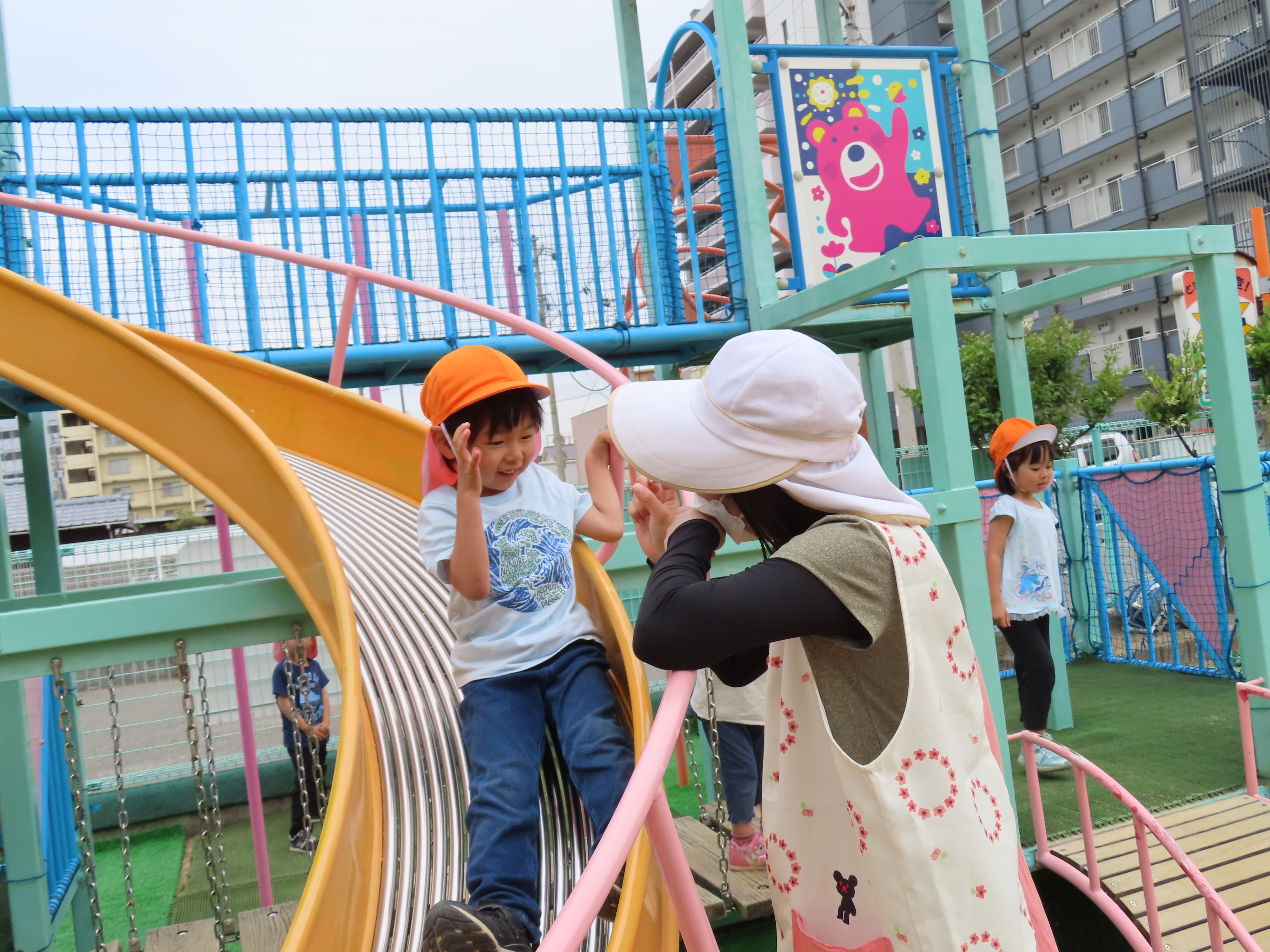 園庭での様子です(*^_^*) 色々な年齢の子どもたちが、園庭で遊んでいるので、幼児さんが小さい子のブランコを優しく押してあげたり、小さい子がいる間は、幼児さん達はブランコを我慢してくれて、小さい子の安全を確保してくれたりもしています。 ダンゴムシを探したり、かけっこをしたり遊具で遊んだりと元気に体を動かして外遊びを楽しんでいますよ(^^)/