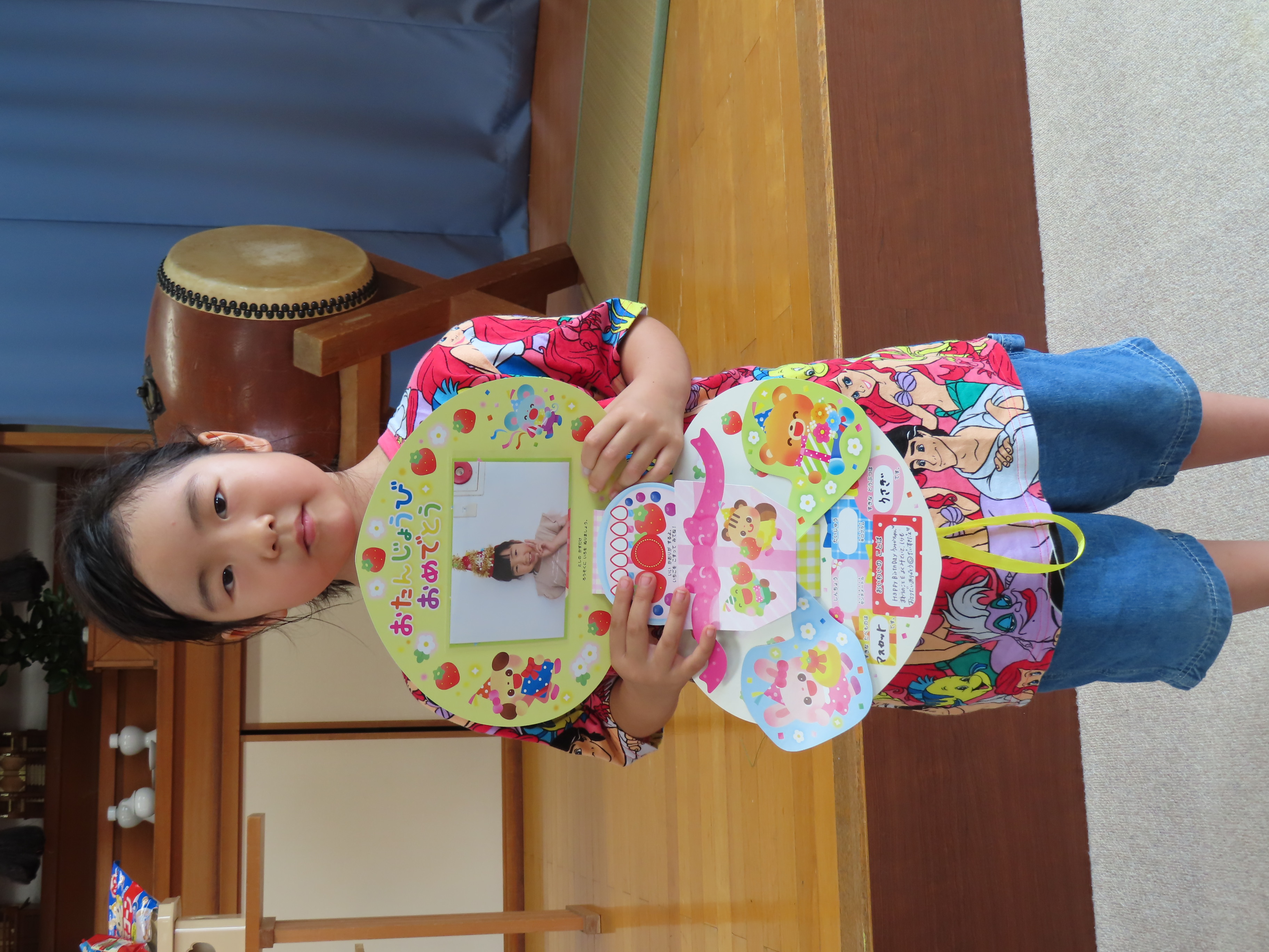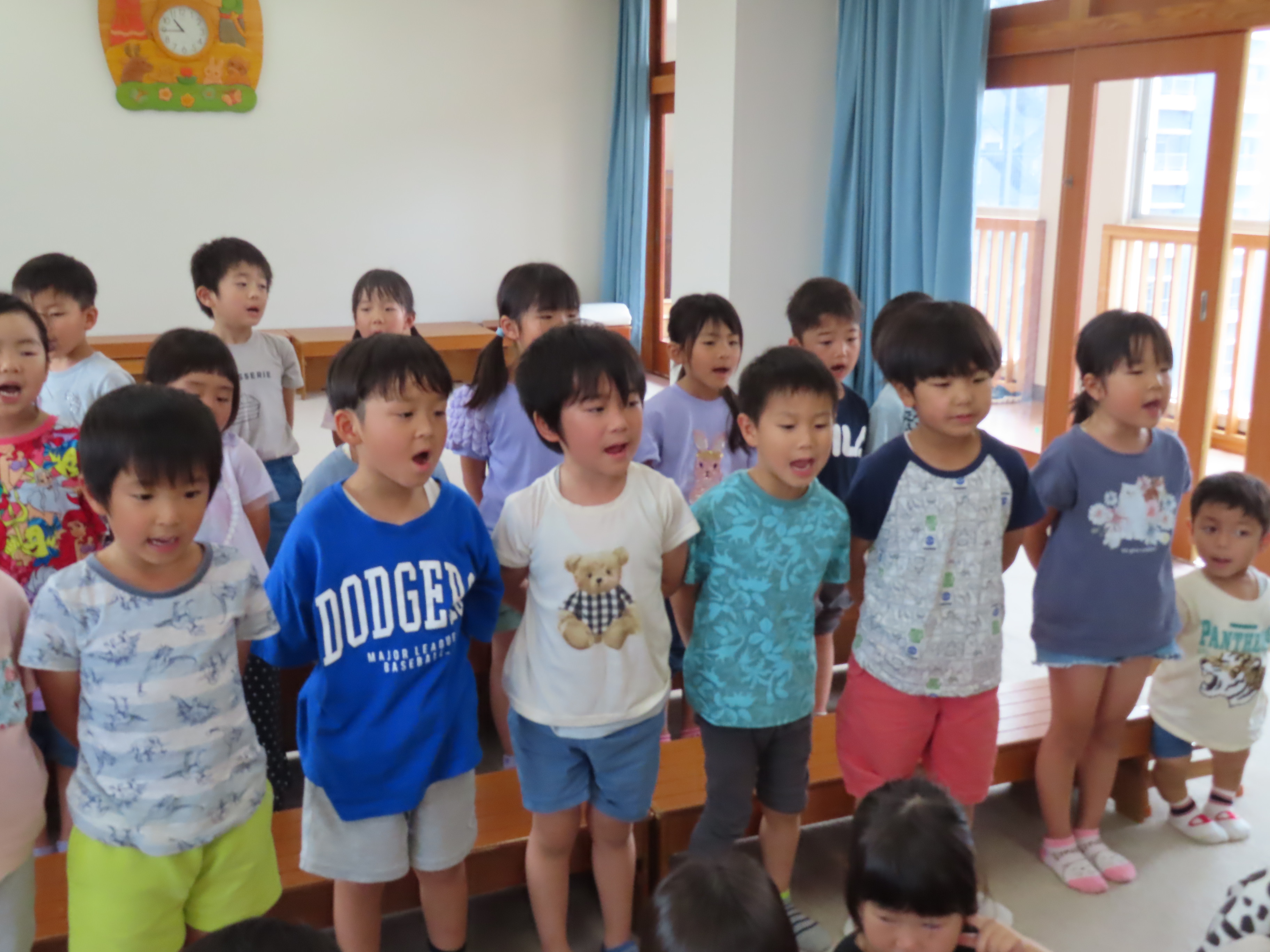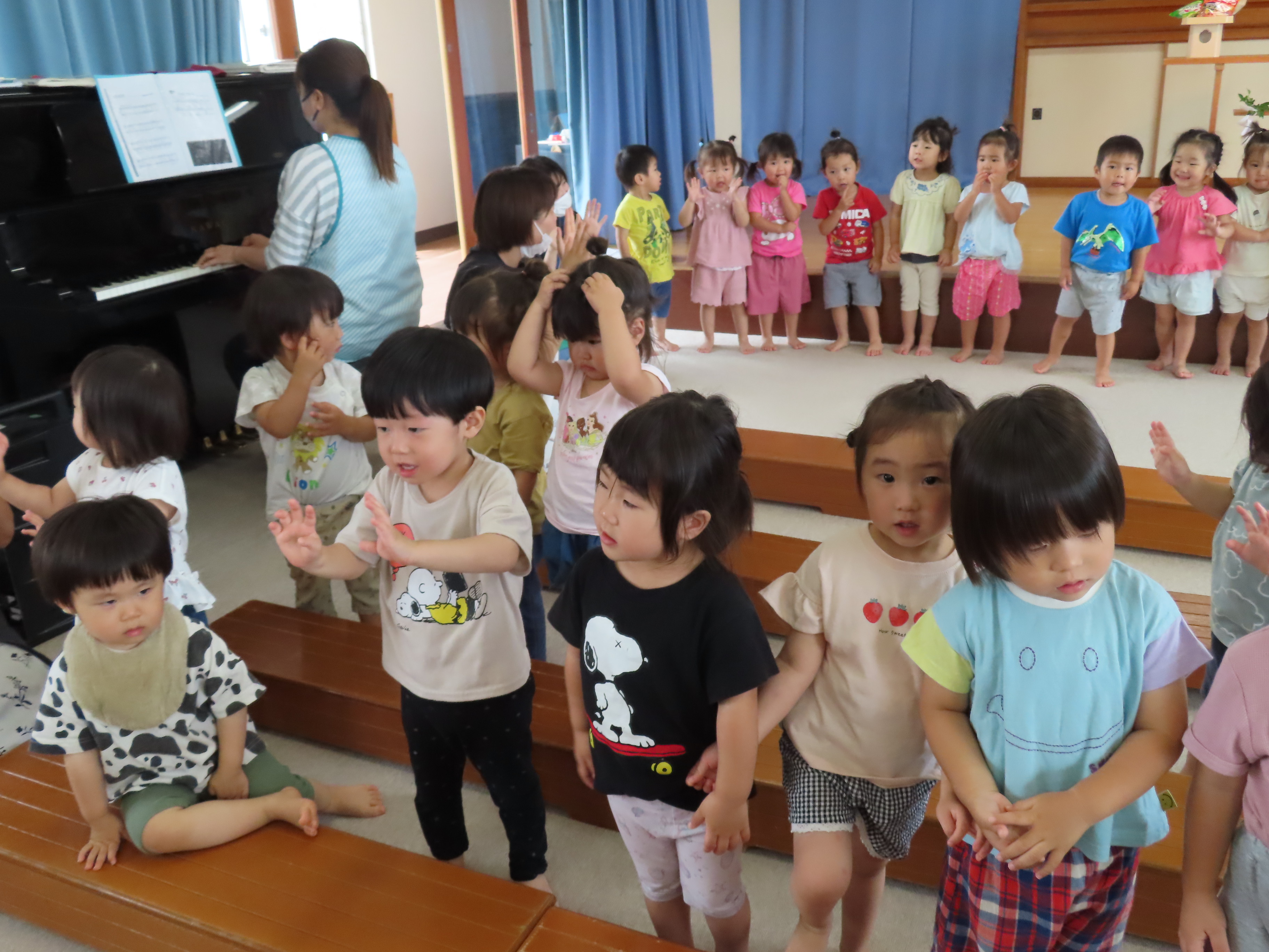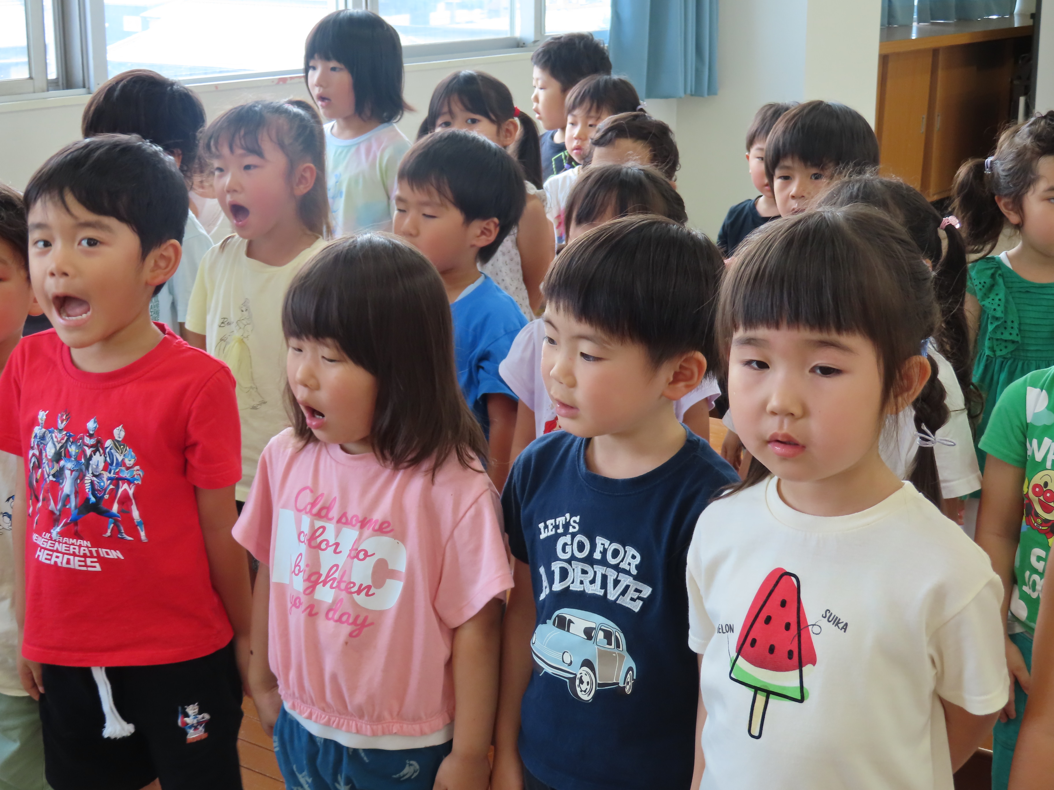 7月の誕生会の様子です(*^_^*)今月から、2歳児クラスのすみれ組とたんぽぽ組も幼児クラスと一緒に4階での誕生会に参加です♪ 今から何が始まるの~!??と興味いっぱいに静かに様子を見つめる2歳児さん達の表情がなんだかおかしいやら、かわいらしいやら(#^^#) 歌のプレゼントもしっかり前に出て‼歌ってくれました♪ これから、幼児クラスと同じ活動も増やしながら、色々な行事も楽しんでくれたらと思います♪ 7月生まれのお友だち‼!お誕生日おめでとうございます(^^♪