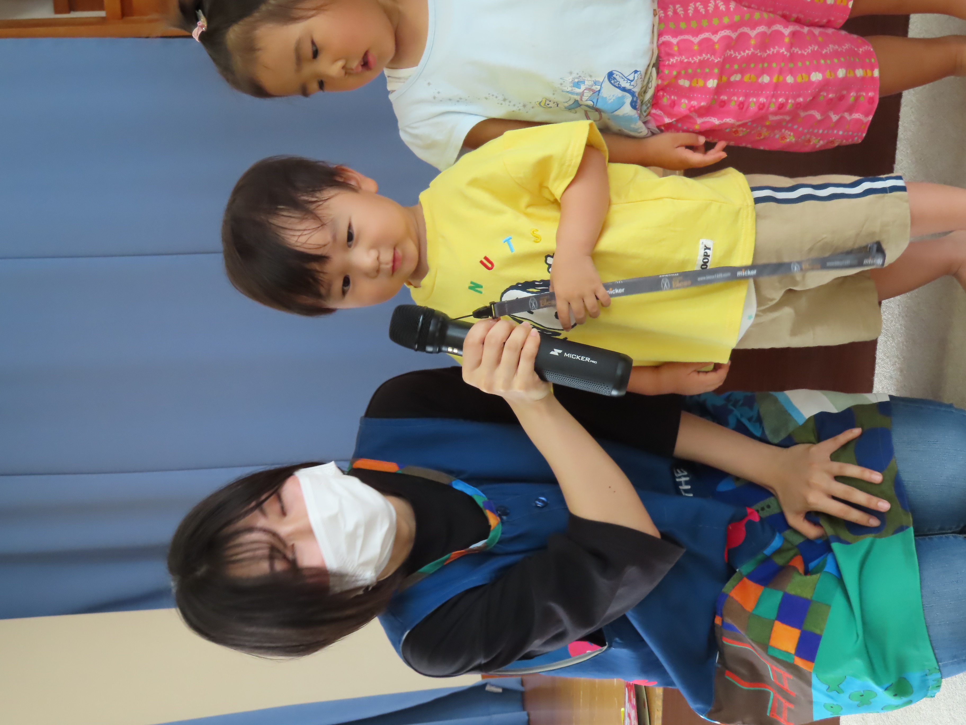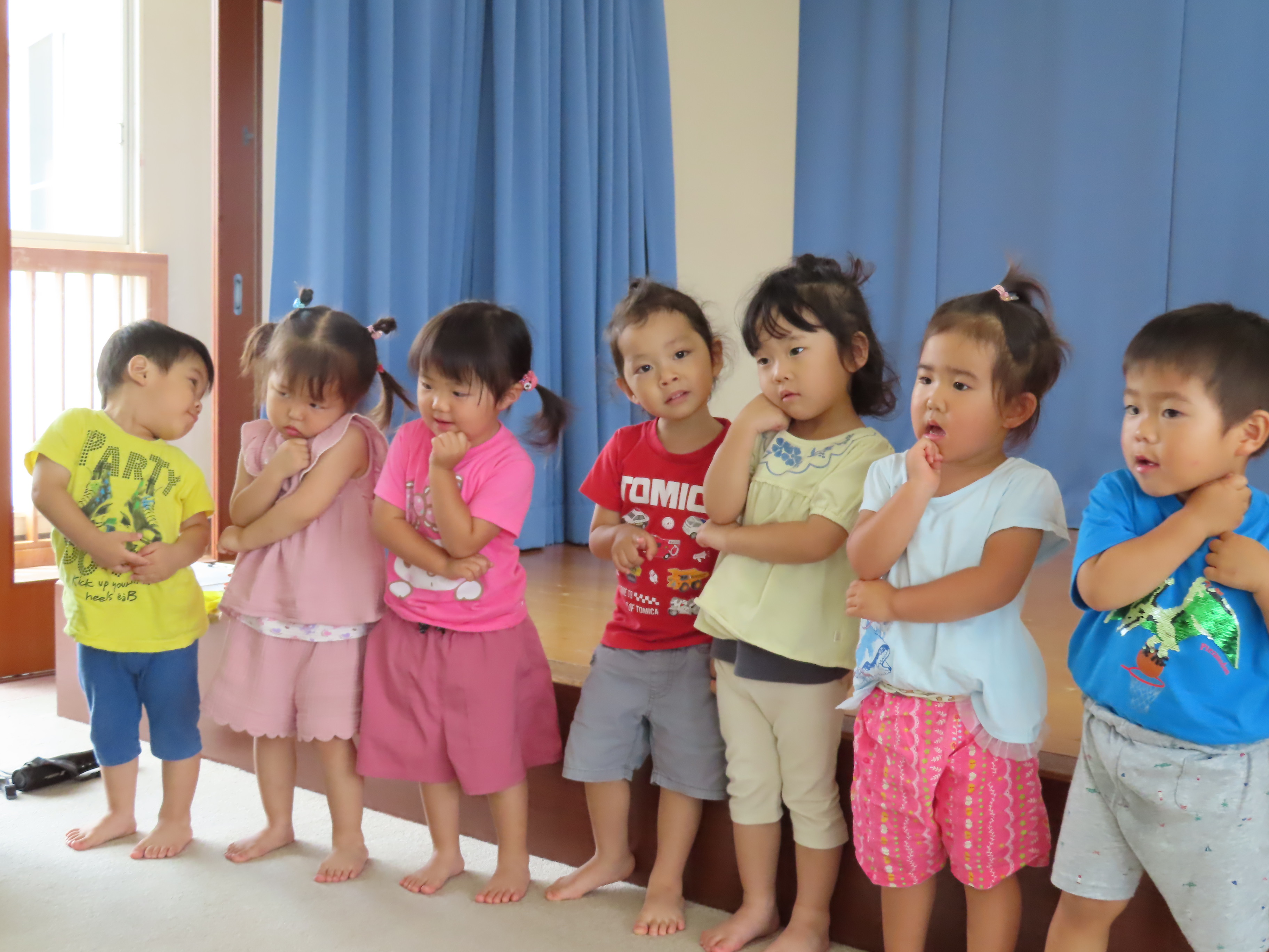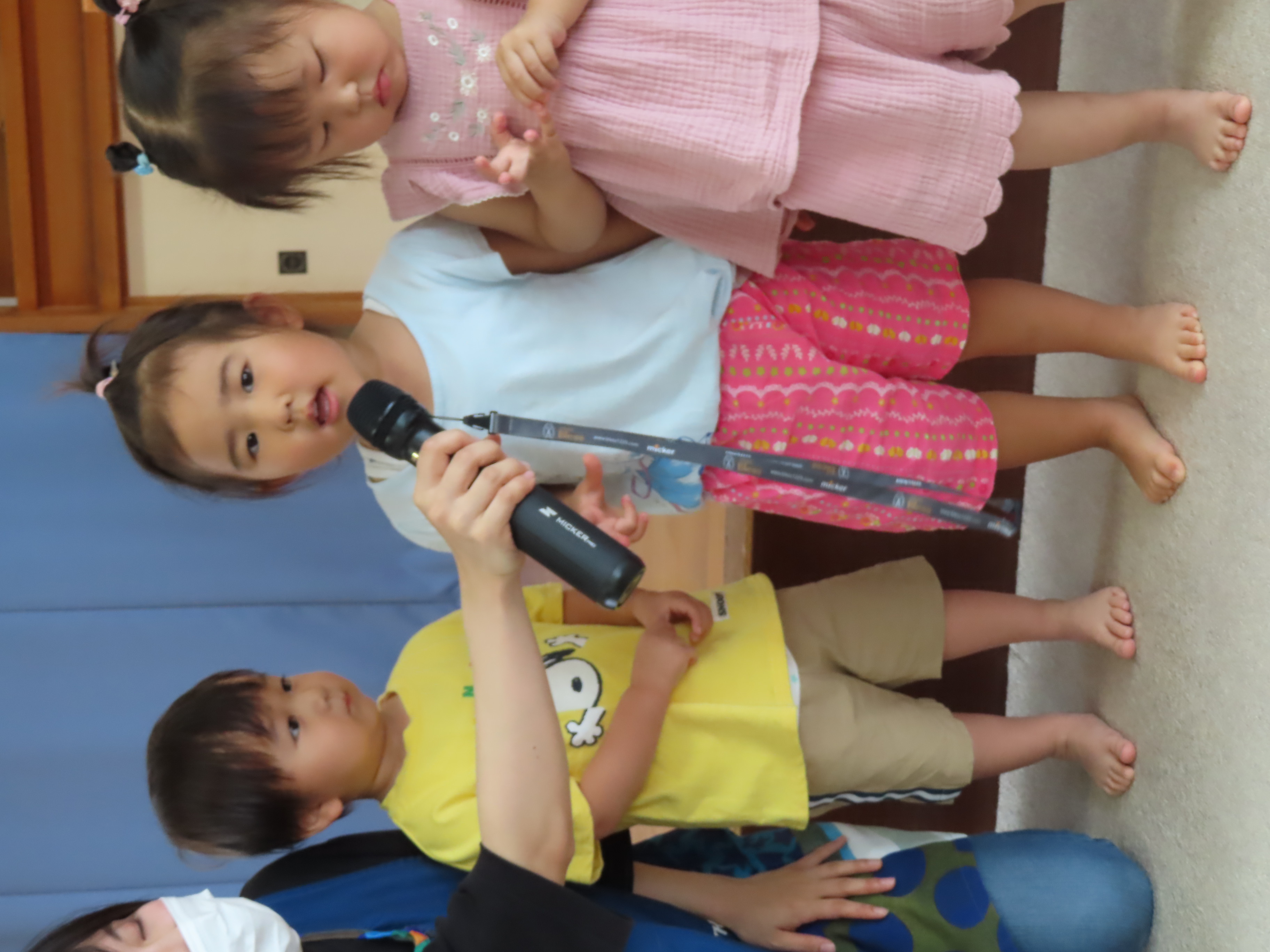 7月の誕生会の様子です(*^_^*)今月から、2歳児クラスのすみれ組とたんぽぽ組も幼児クラスと一緒に4階での誕生会に参加です♪ 今から何が始まるの~!??と興味いっぱいに静かに様子を見つめる2歳児さん達の表情がなんだかおかしいやら、かわいらしいやら(#^^#) 歌のプレゼントもしっかり前に出て‼歌ってくれました♪ これから、幼児クラスと同じ活動も増やしながら、色々な行事も楽しんでくれたらと思います♪ 7月生まれのお友だち‼!お誕生日おめでとうございます(^^♪
