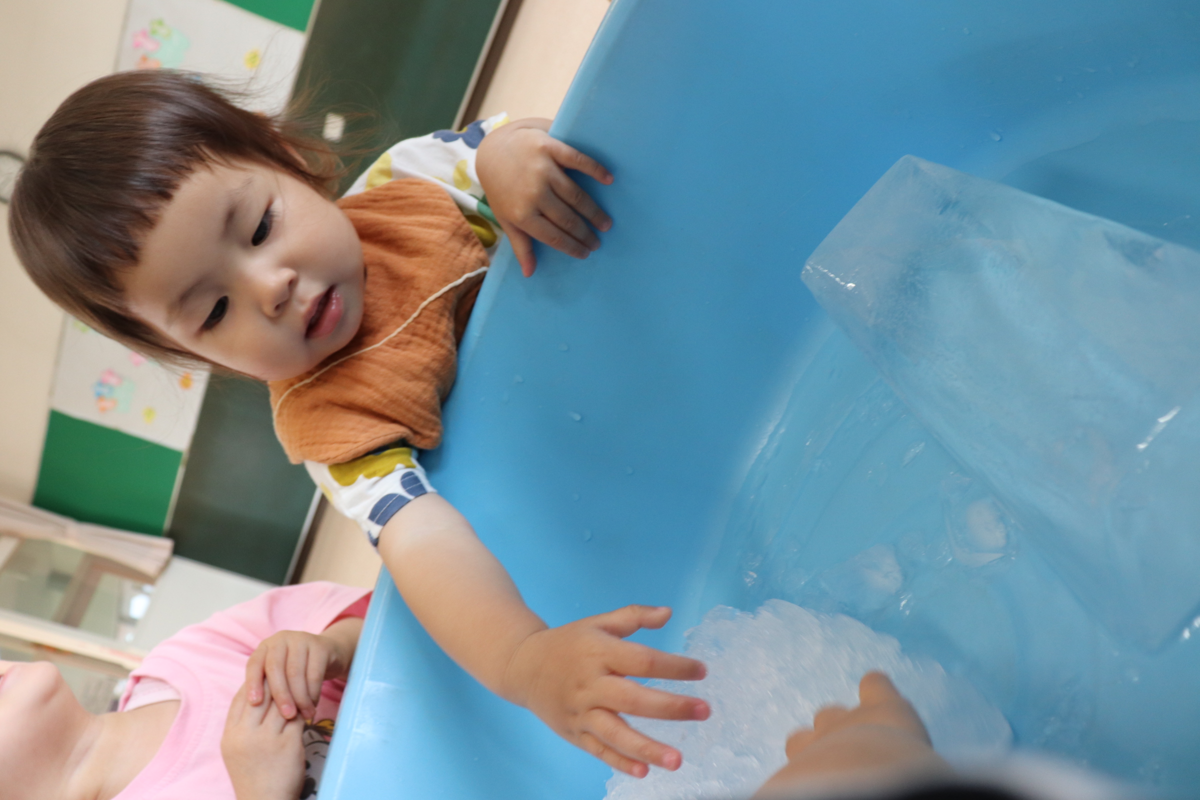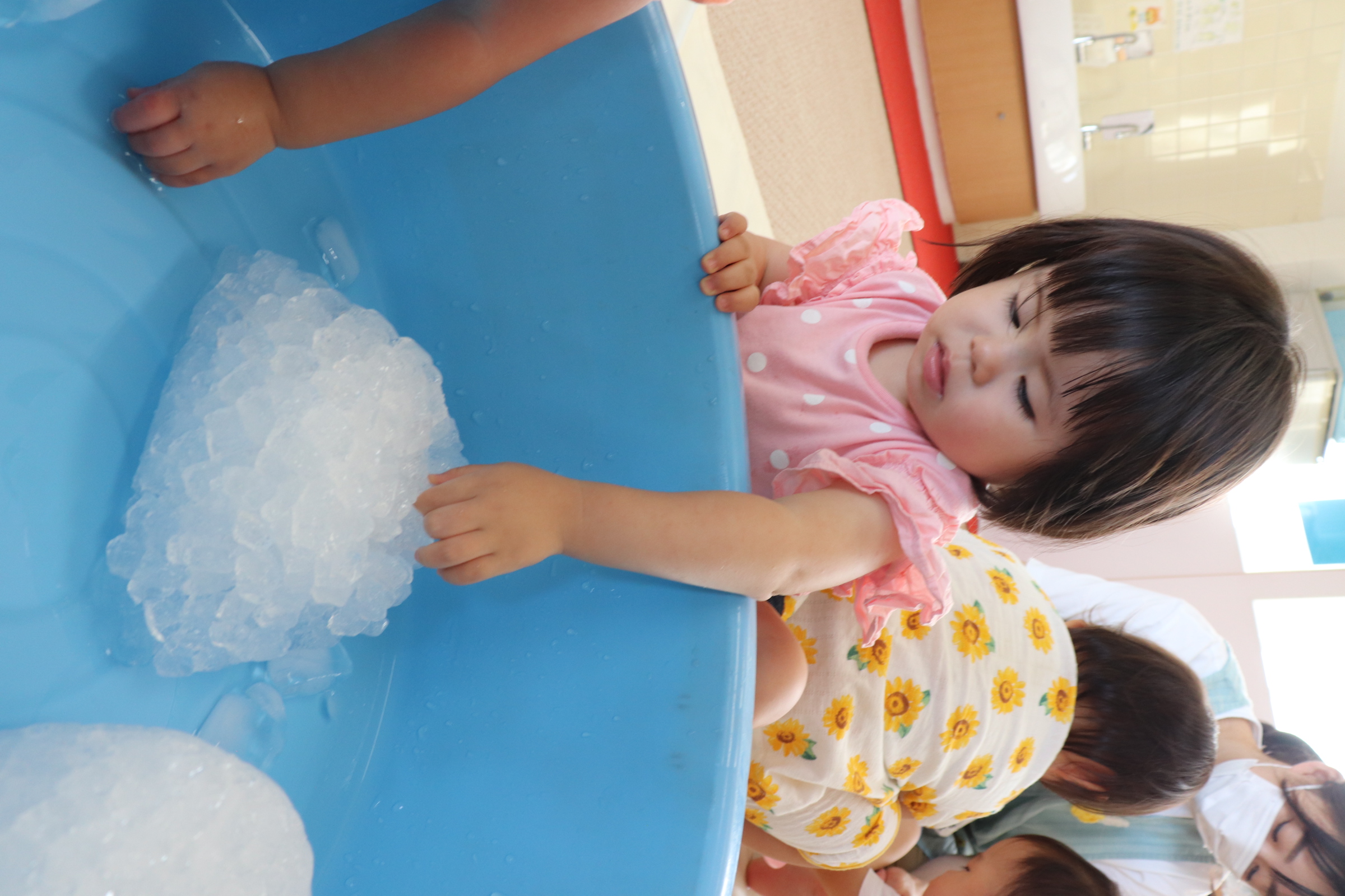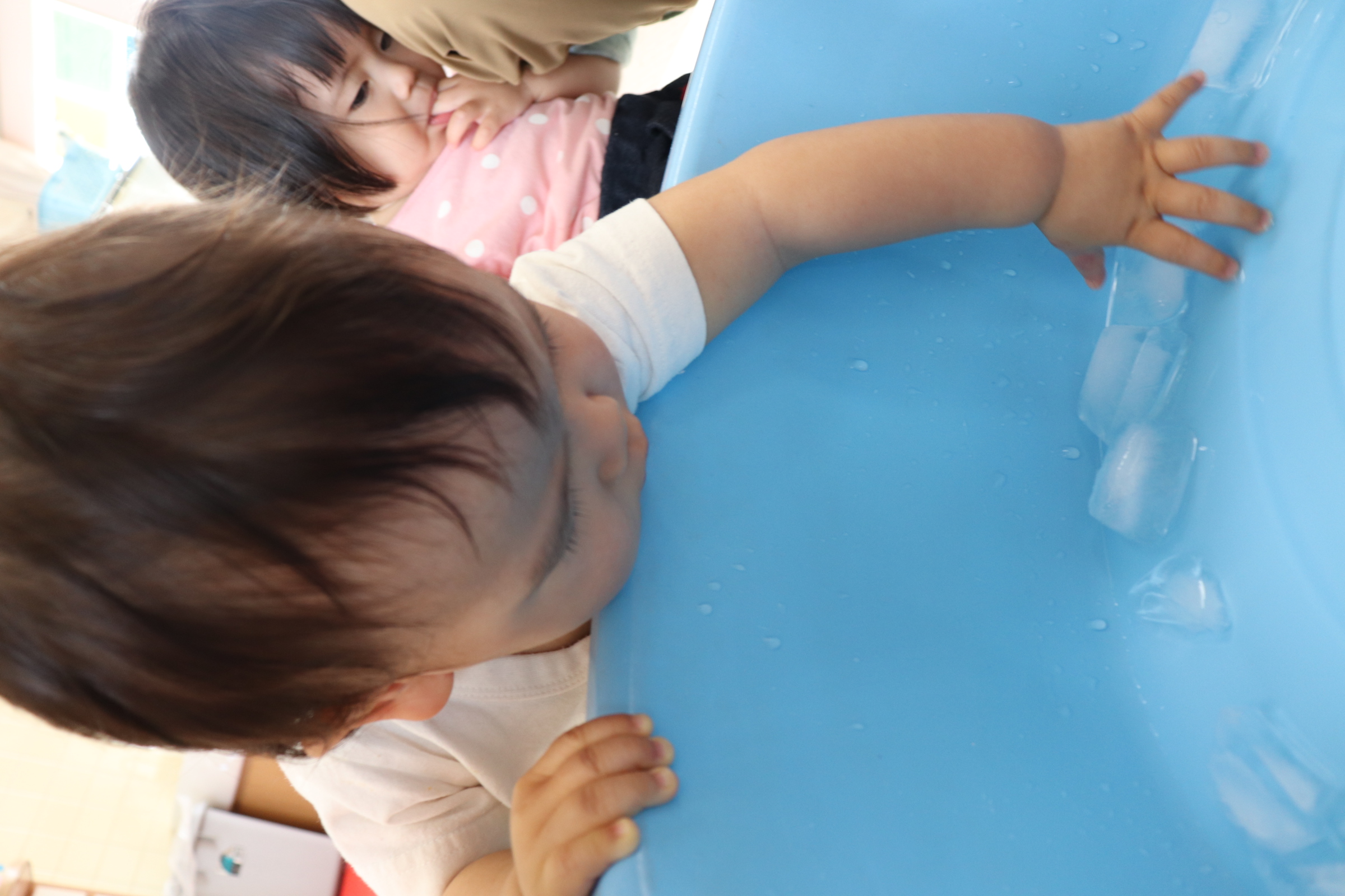 氷遊びをしました。最初は、触れることに恐る恐る…だった子どもたちでしたが、冷たくて気持ちがいい氷だと分かると、洋服がびしょぬれになるほど遊び方が大胆に(笑)氷を手で握って「つめたっ♡」と笑って見せたり、大きな氷には、ちょっと警戒しながら手を延ばしたりしながら、暑い時間を涼んで楽しんだ子どもたちでした(*^_^*)