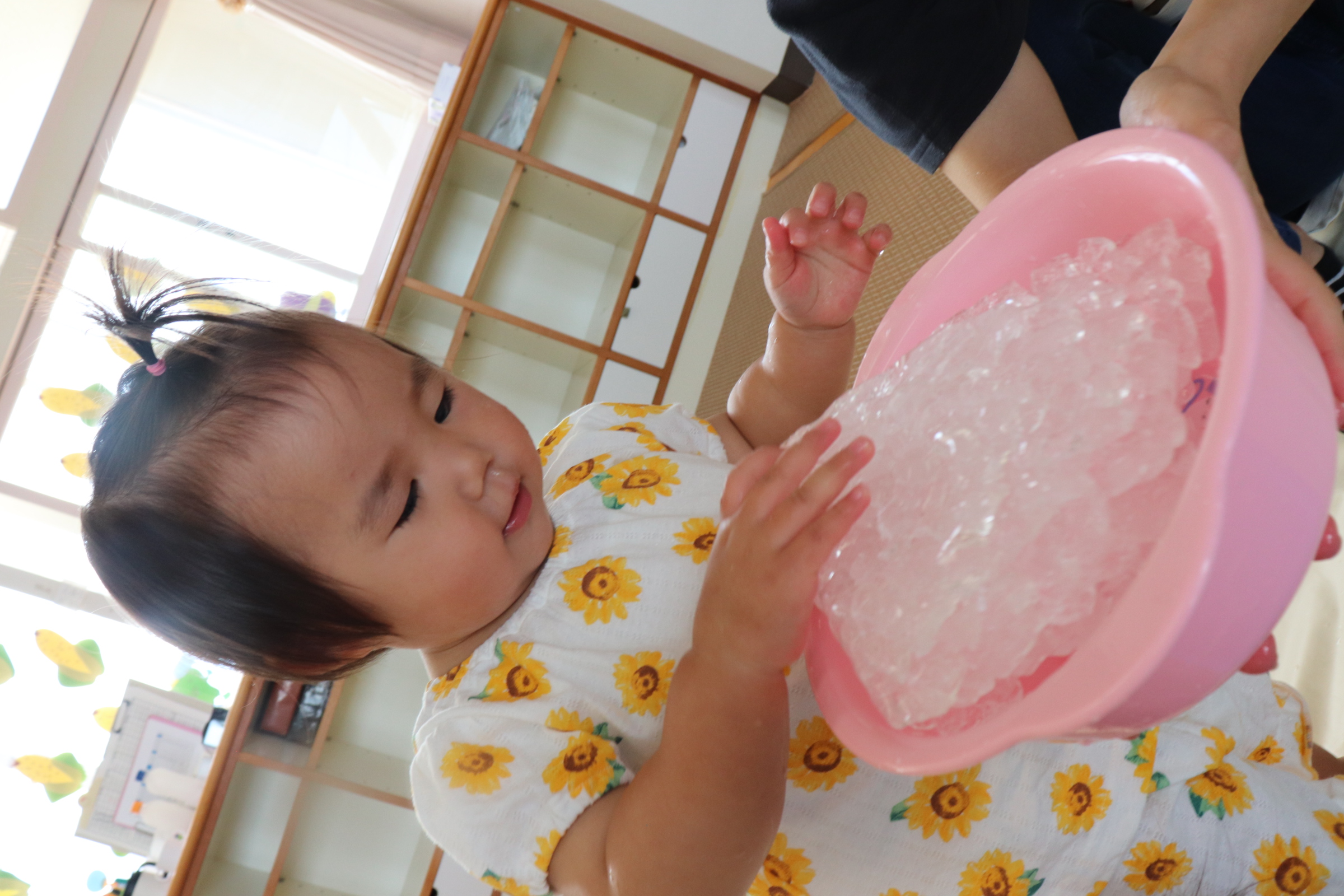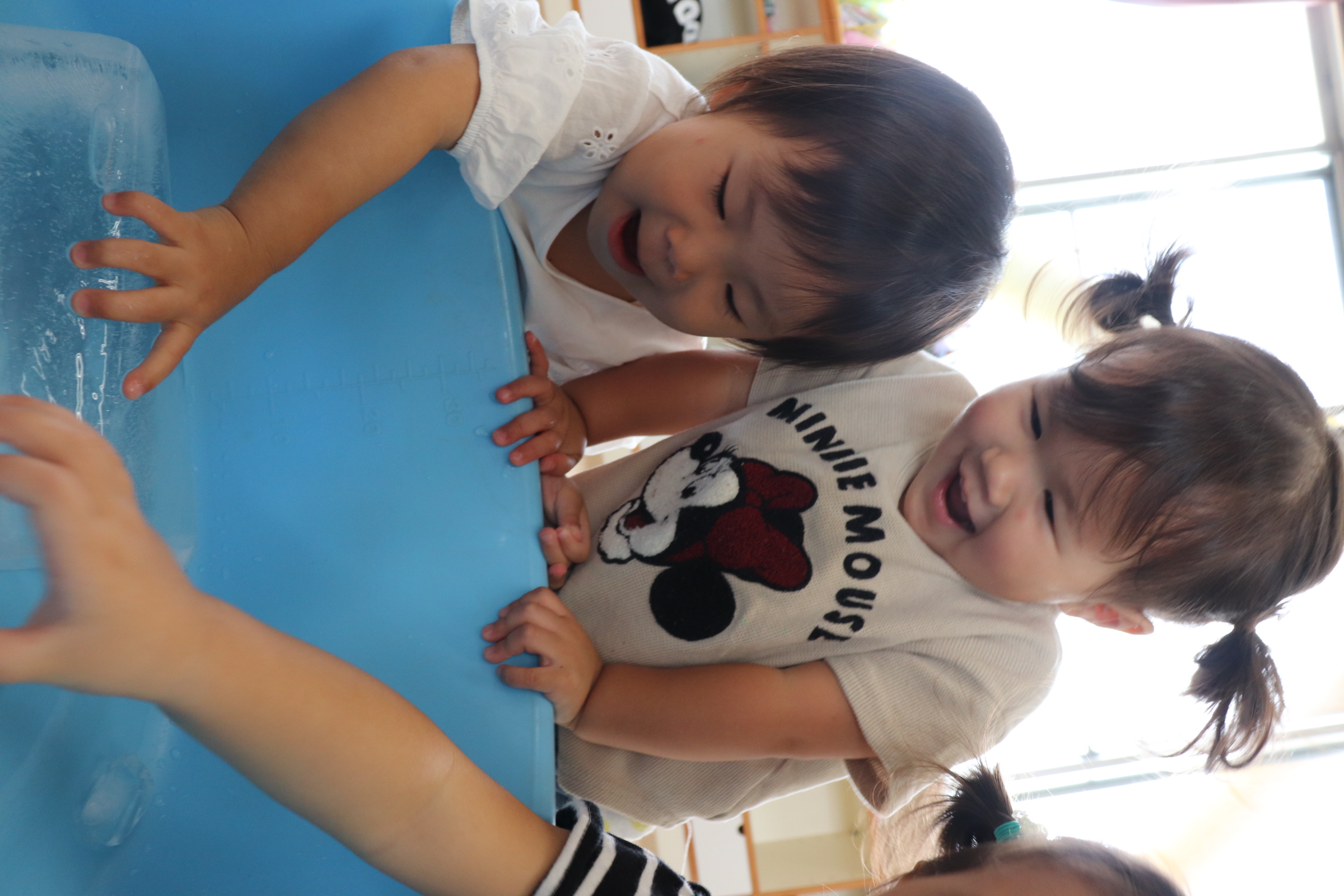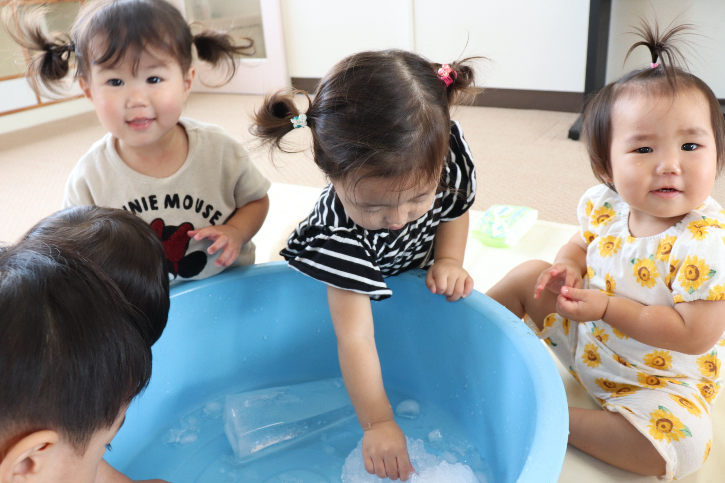 氷遊びをしました。最初は、触れることに恐る恐る…だった子どもたちでしたが、冷たくて気持ちがいい氷だと分かると、洋服がびしょぬれになるほど遊び方が大胆に(笑)氷を手で握って「つめたっ♡」と笑って見せたり、大きな氷には、ちょっと警戒しながら手を延ばしたりしながら、暑い時間を涼んで楽しんだ子どもたちでした(*^_^*)