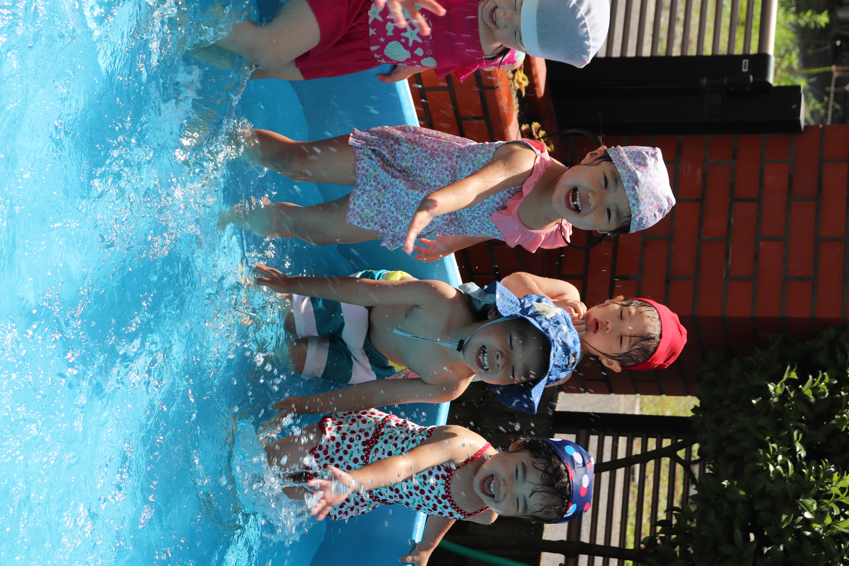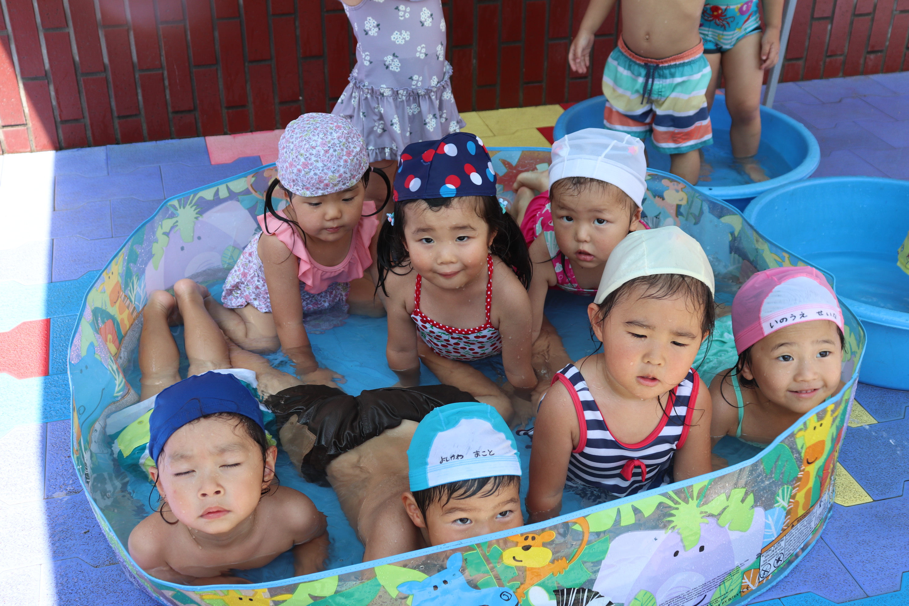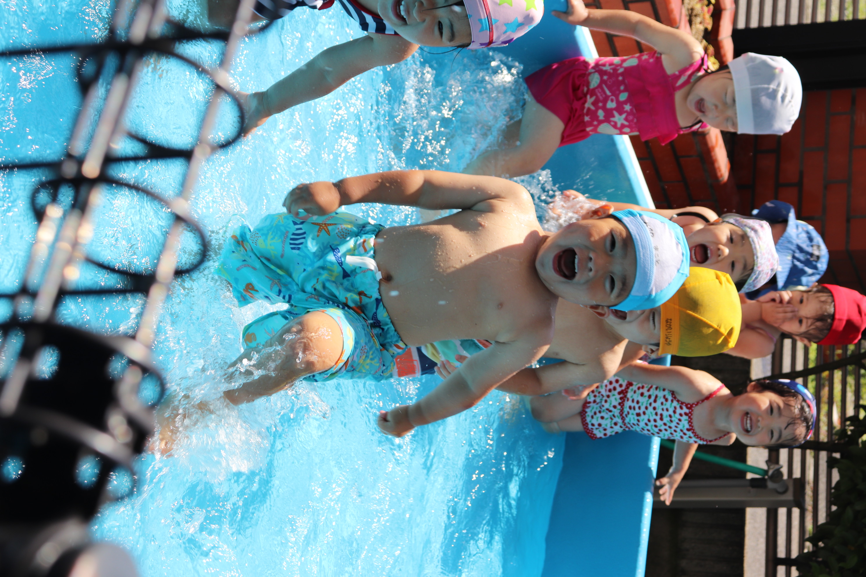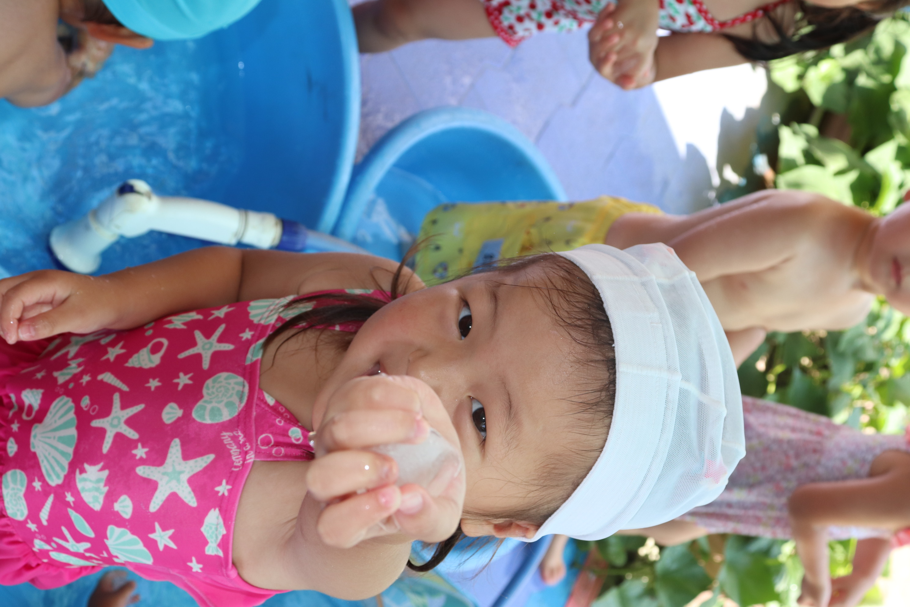 今年から、幼児クラスと同じ大きなプールでのプール遊びができるようになり、ご覧の通り最っ高に楽しんでいるすみれ組です(*^_^*) 隙あらば、保育士に向かって水をかけてくれるヤンチャな子どもたちです(^^)/ 氷遊びや色水遊びなど、色々な夏の遊びを設定しながら毎日元気に‼楽しんでいます!!