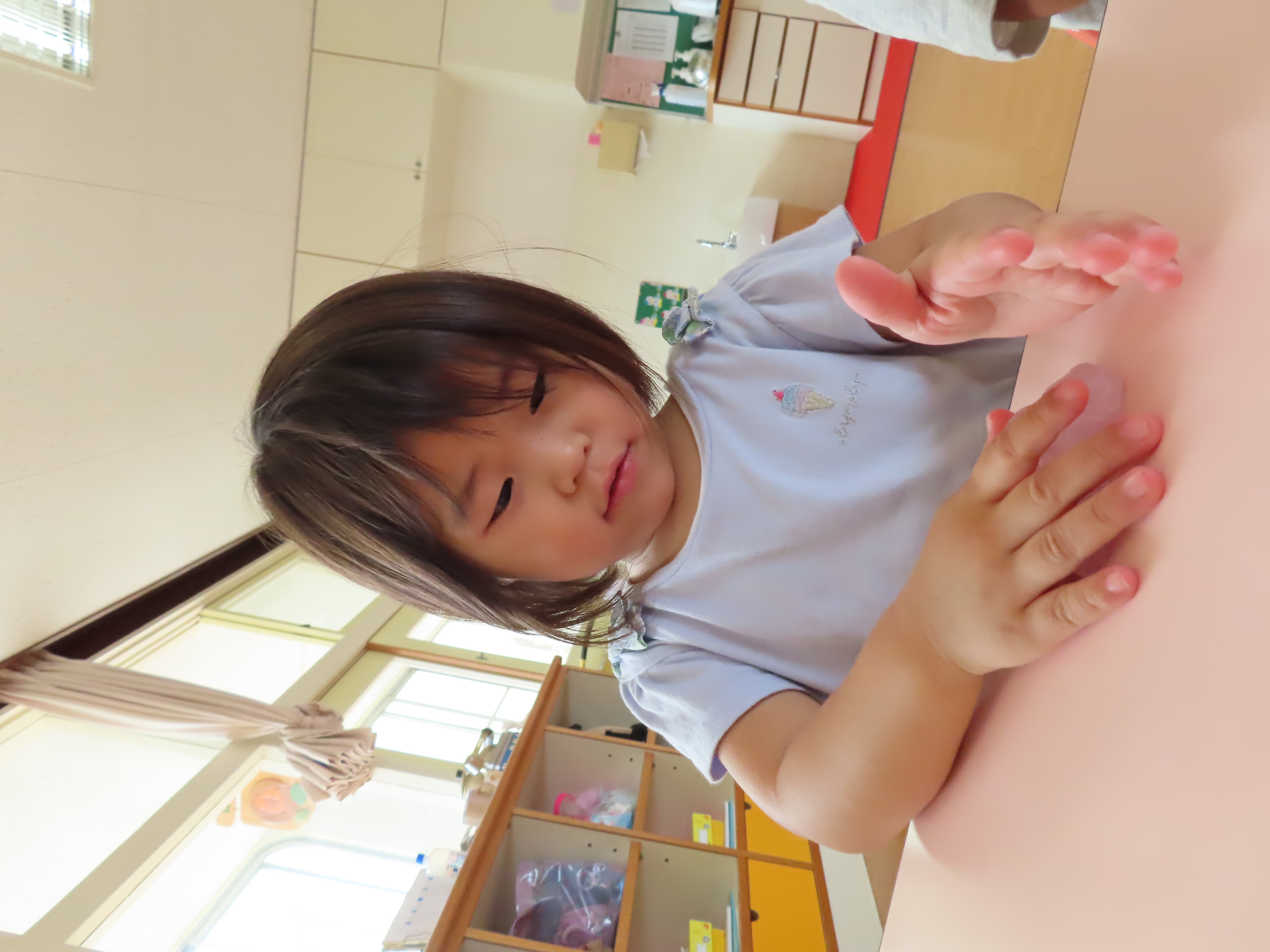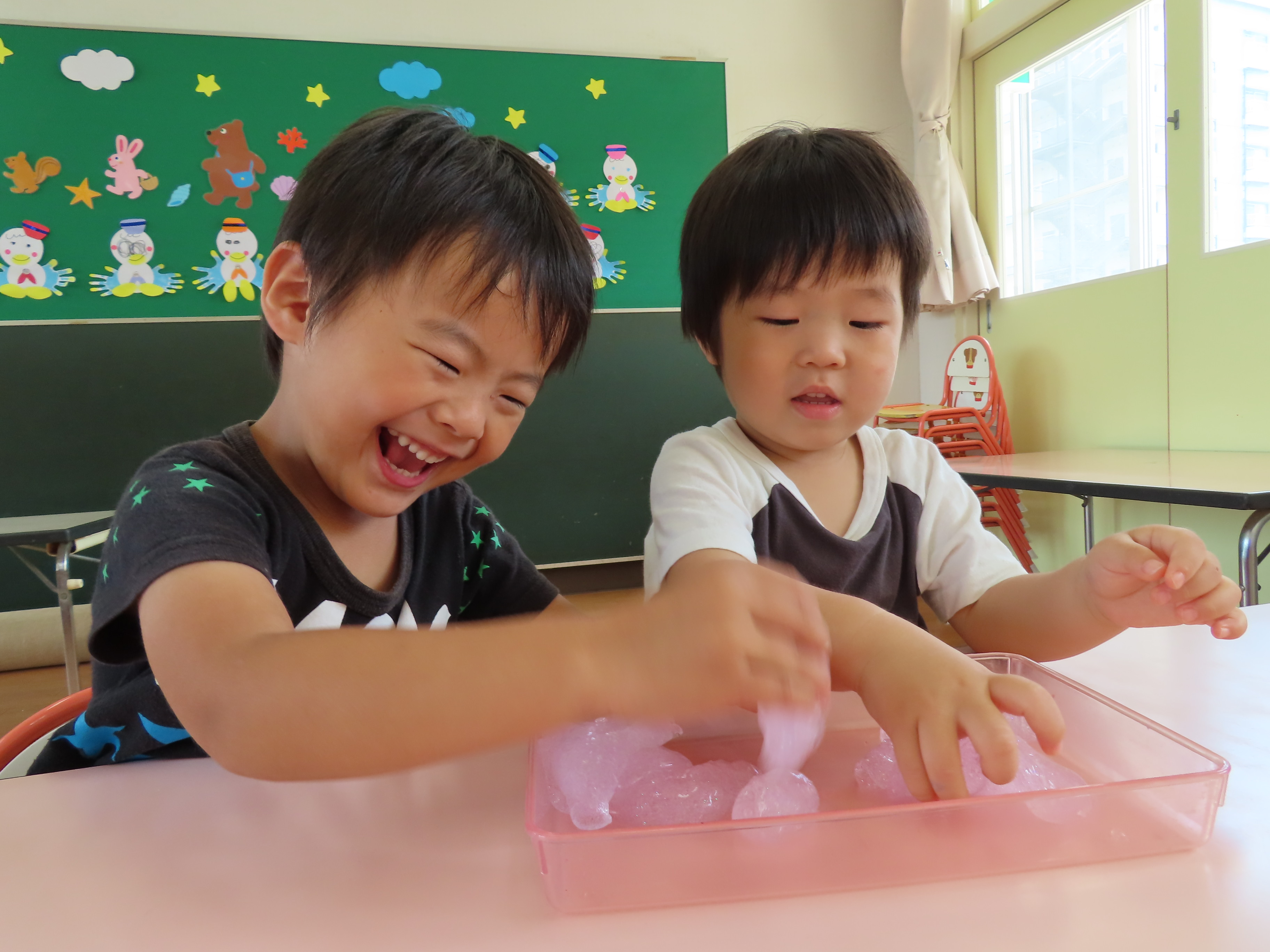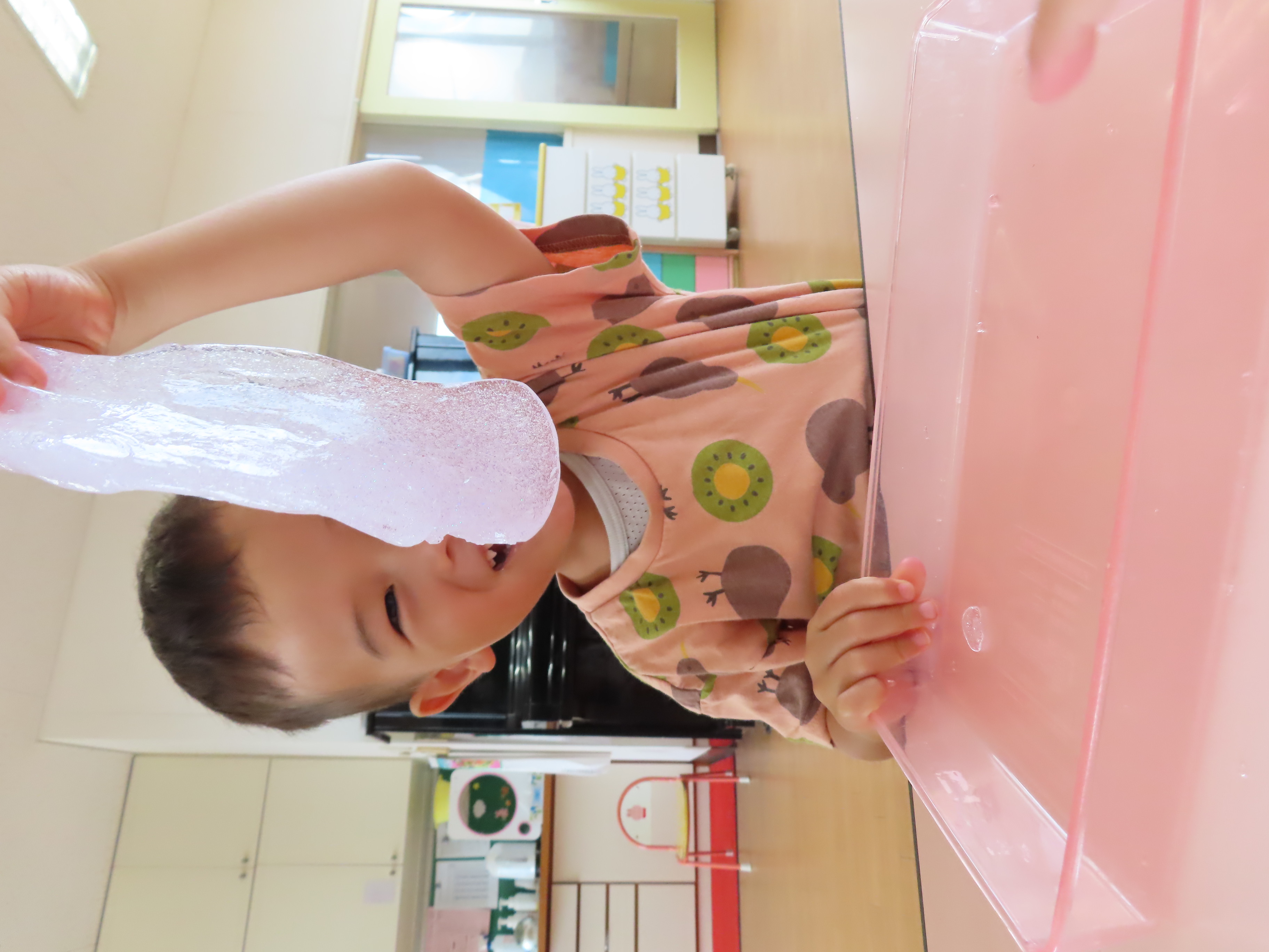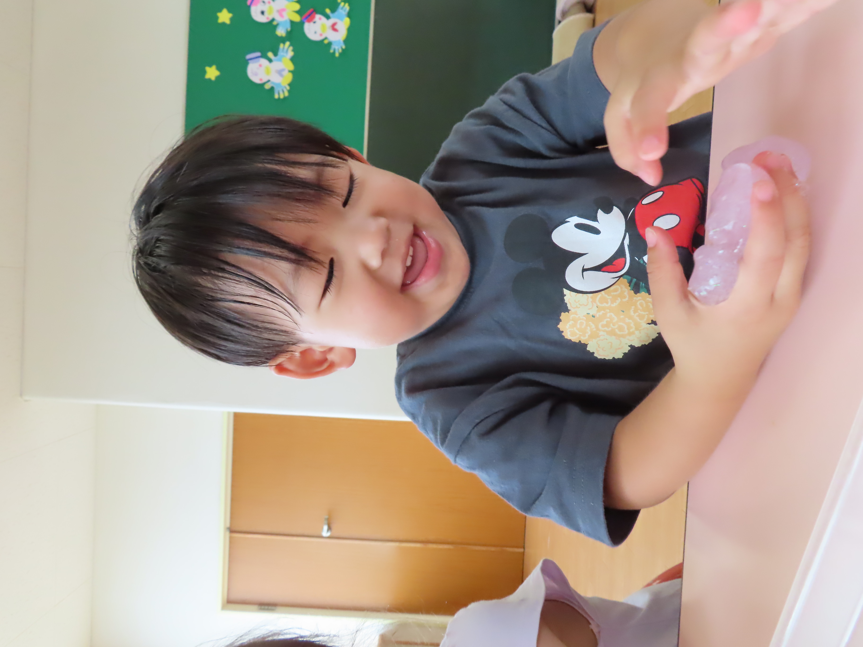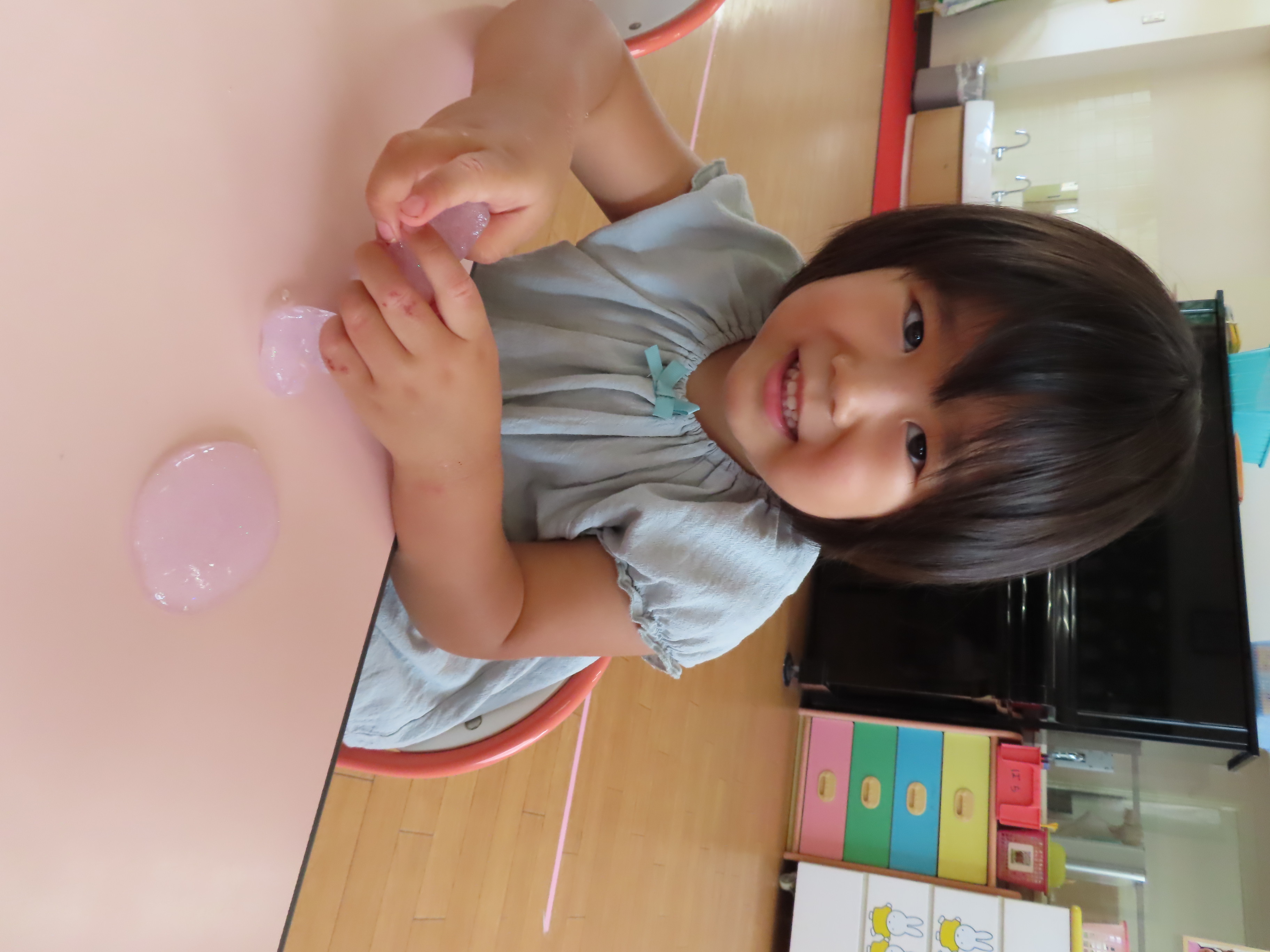 ばら組の様子です(*^_^*) スライムで遊びました♪ 見た目で最初は触れることに少々抵抗あり…な表情の子もいましたが、一度さわると…やみつきになるなんとも言えない感触に、子どもたちもこの表情です(*^_^*) ぷにぷにしながら、丸めたりのばしたりしながらとってもよく遊びました~!!
