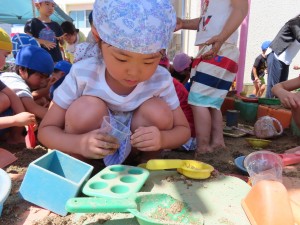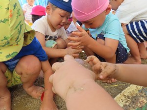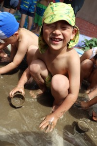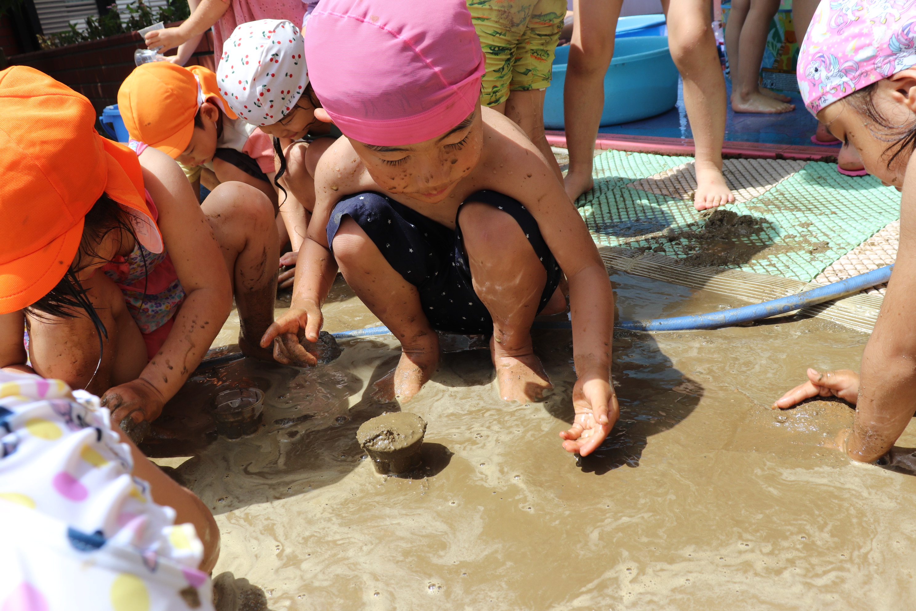 ゆり組ともなると、泥んこ遊びもより大胆になってきて、顔に少々かかろうが、ヘッチャラ~♪「せんせい~!もっと水出して~!」ととにかく水を欲しがる子どもたちなんです(笑)