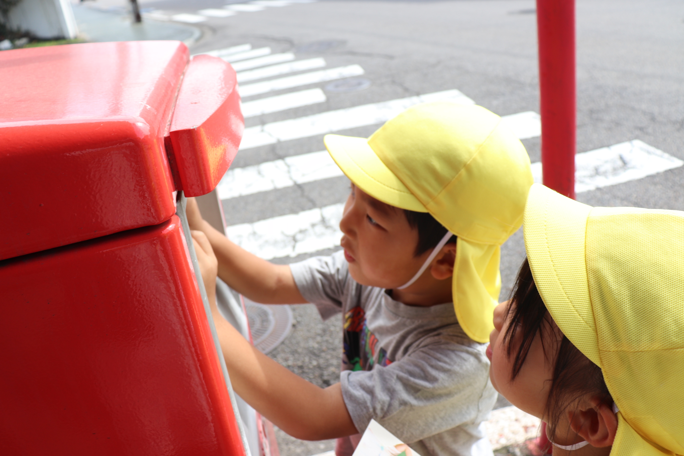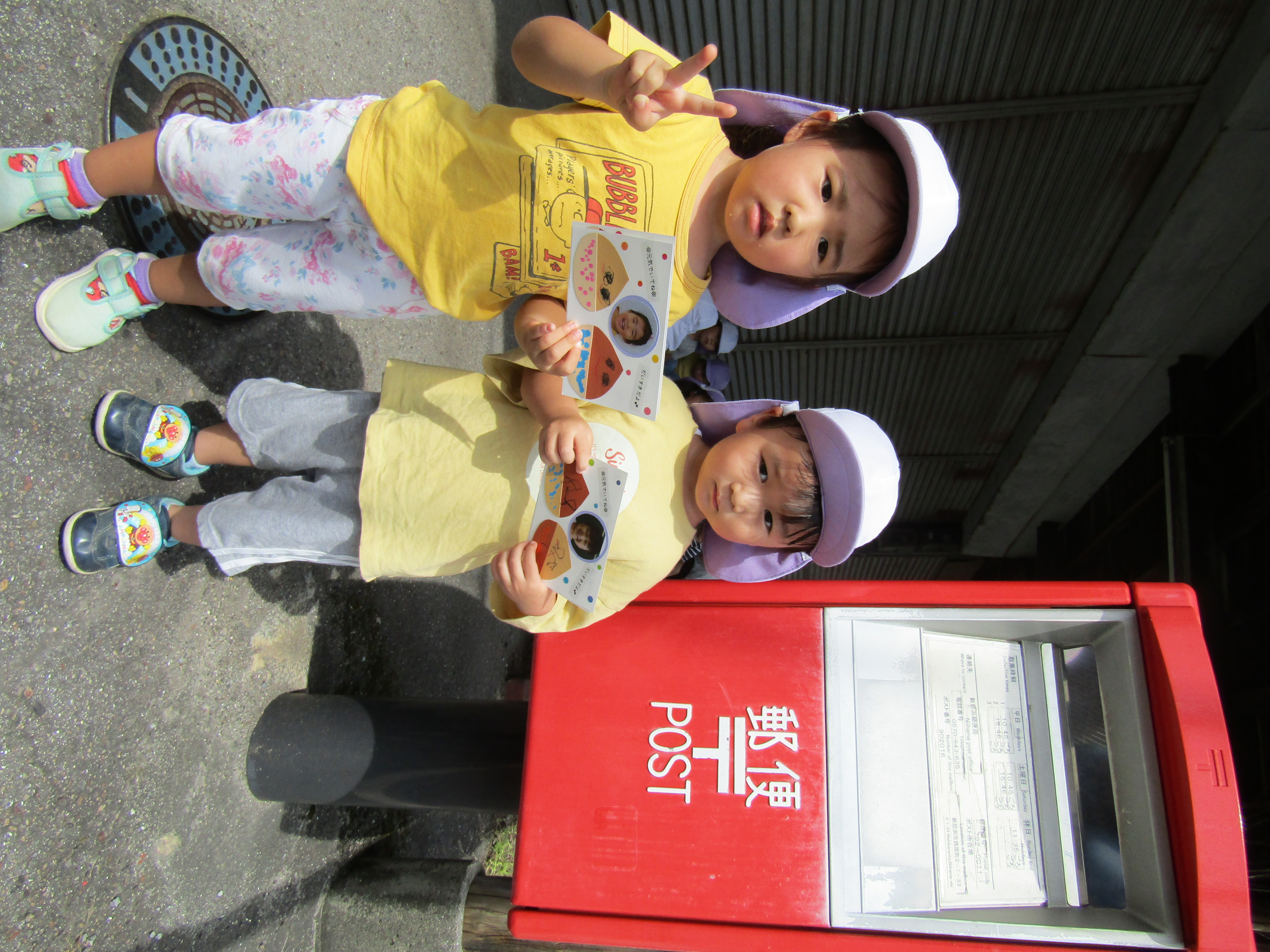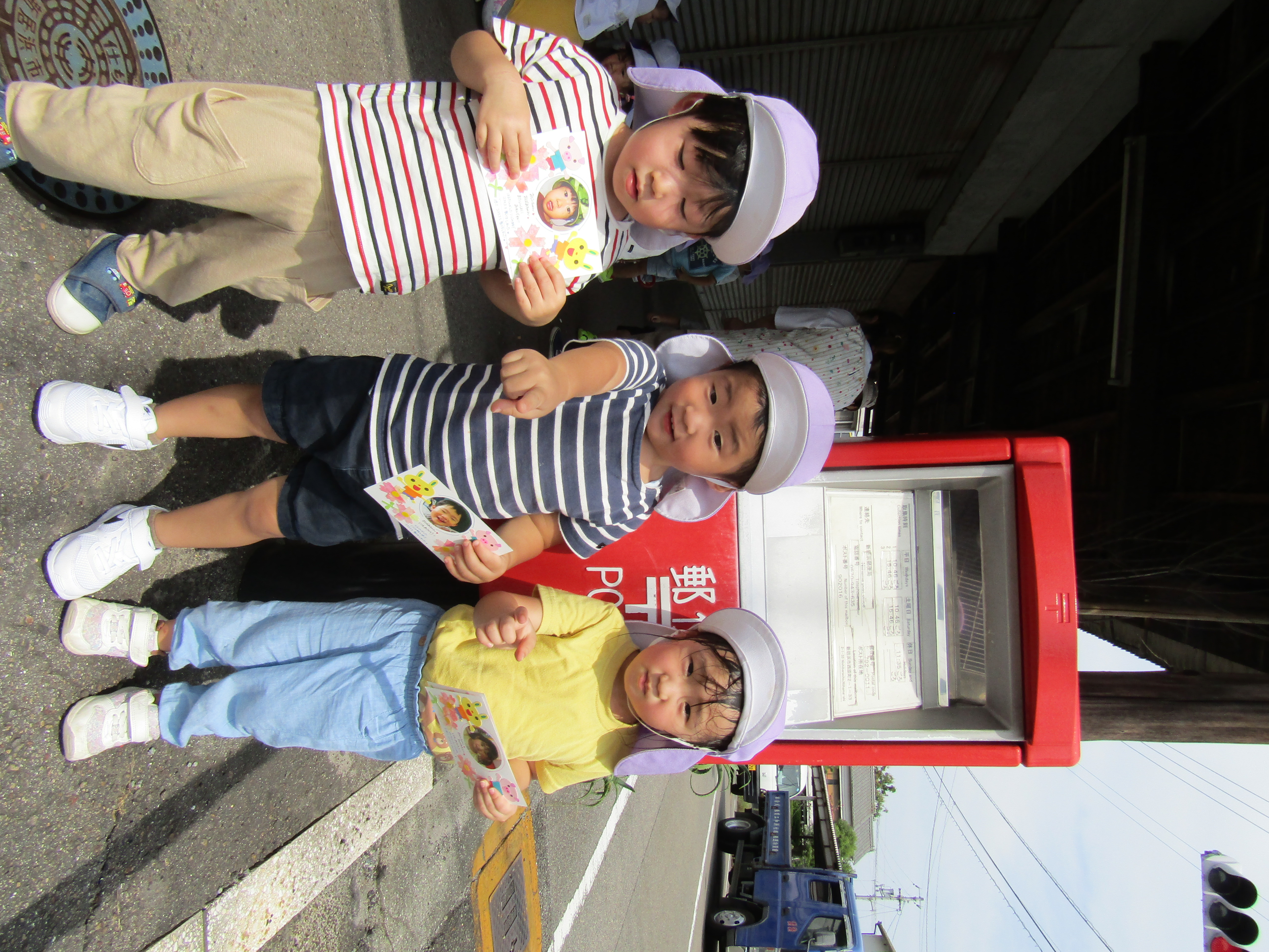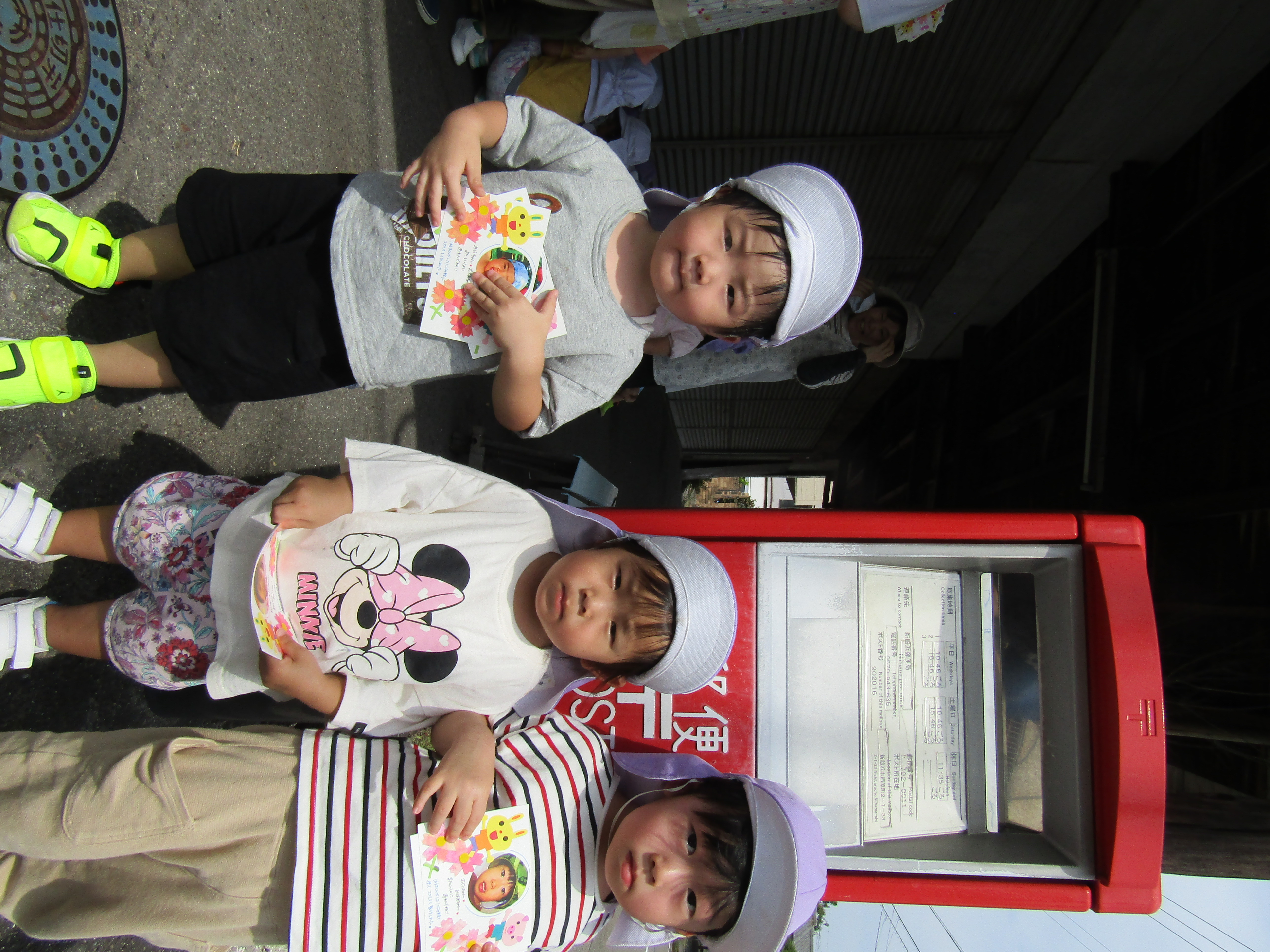 しばらく、ブログをあげられず・・・。申し訳ありません。運動会、お祭りも終わって、子どもたちは毎日園庭へ出ては、のびのびと体を動かし、秋の心地よい季節も感じながら元気に過ごしています(*^_^*) 時期が前後しますが・・・。今回はおじいちゃん、おばあちゃんたちへ送ったハガキ投函の様子です(*^_^*) 「無事に届きますように~」と願いながらポストへ入れた子どもたちです♪無事に、おじいちゃんたちの元へ届き喜んで頂いたようで、良かったです♪