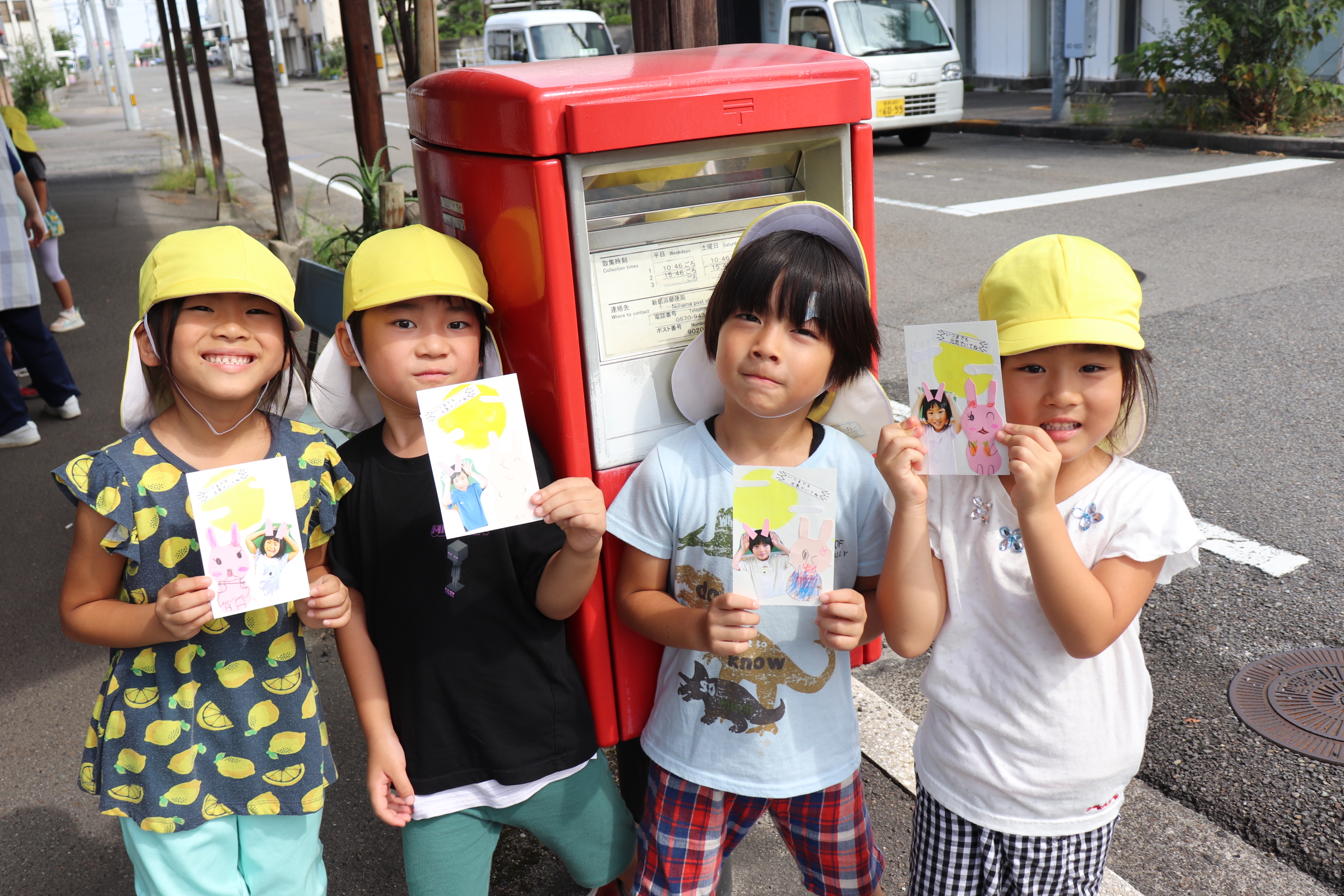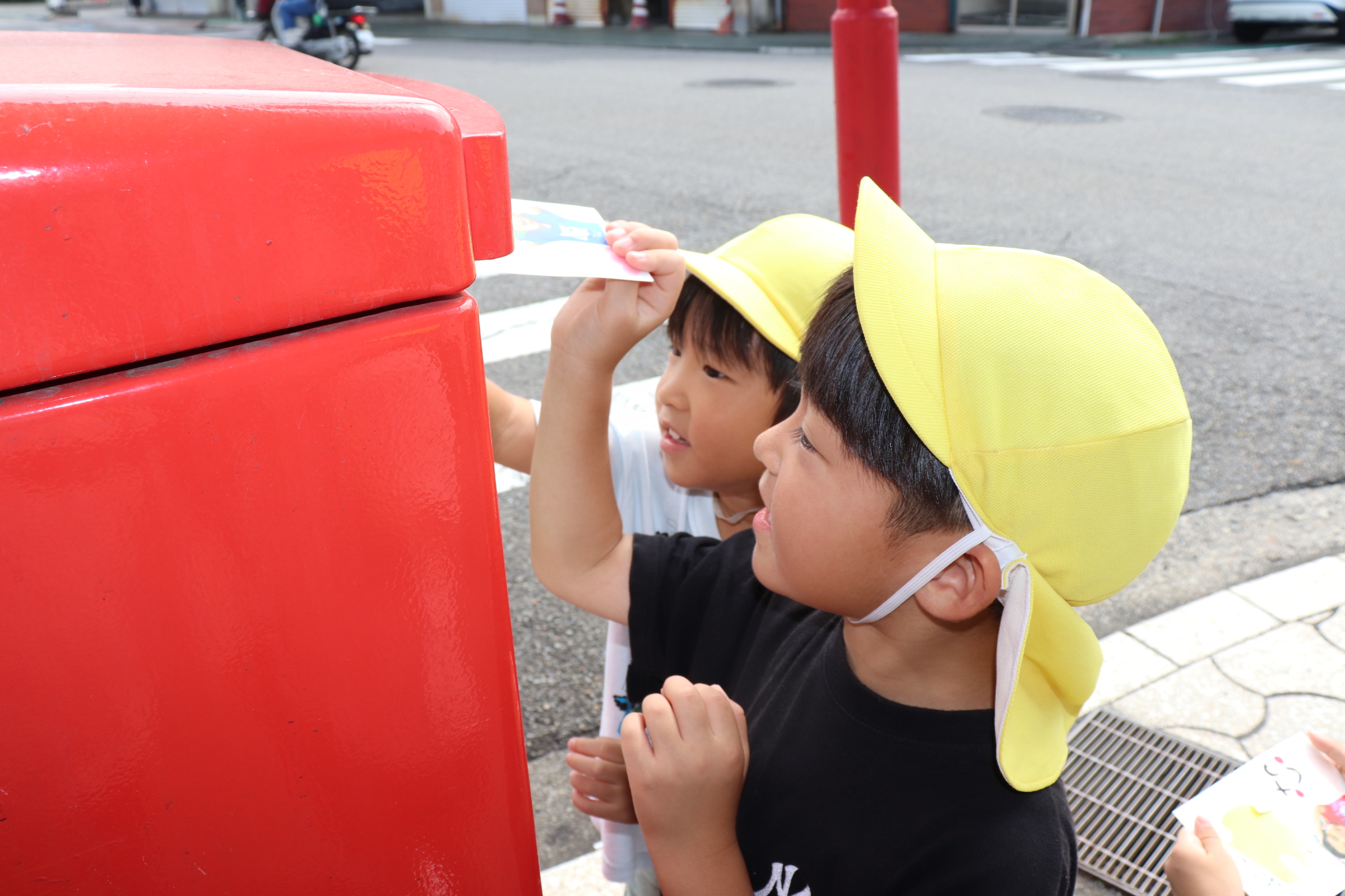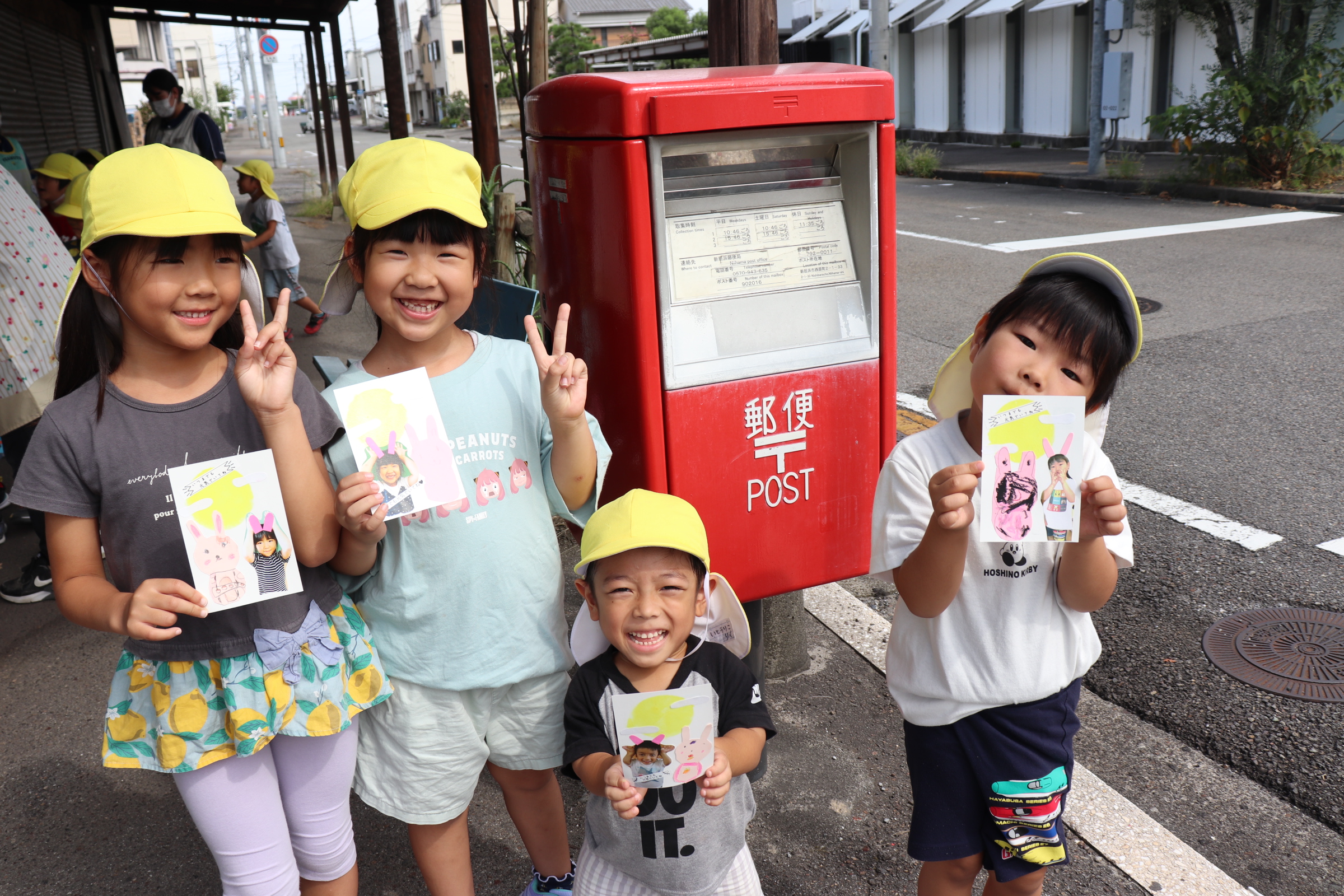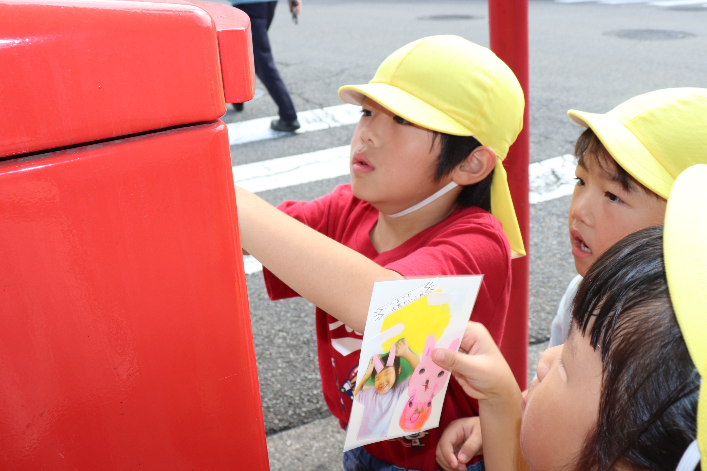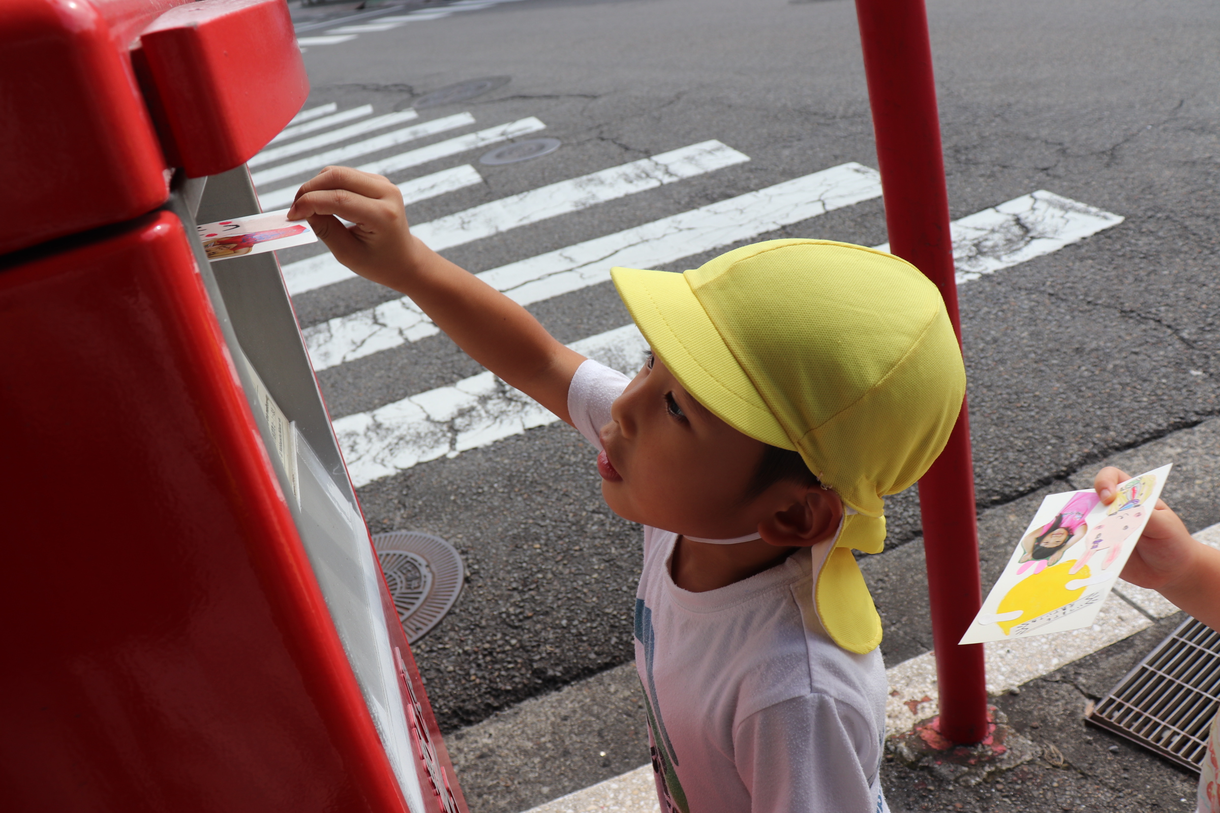 しばらく、ブログをあげられず・・・。申し訳ありません。運動会、お祭りも終わって、子どもたちは毎日園庭へ出ては、のびのびと体を動かし、秋の心地よい季節も感じながら元気に過ごしています(*^_^*) 時期が前後しますが・・・。今回はおじいちゃん、おばあちゃんたちへ送ったハガキ投函の様子です(*^_^*) 「無事に届きますように~」と願いながらポストへ入れた子どもたちです♪無事に、おじいちゃんたちの元へ届き喜んで頂いたようで、良かったです♪