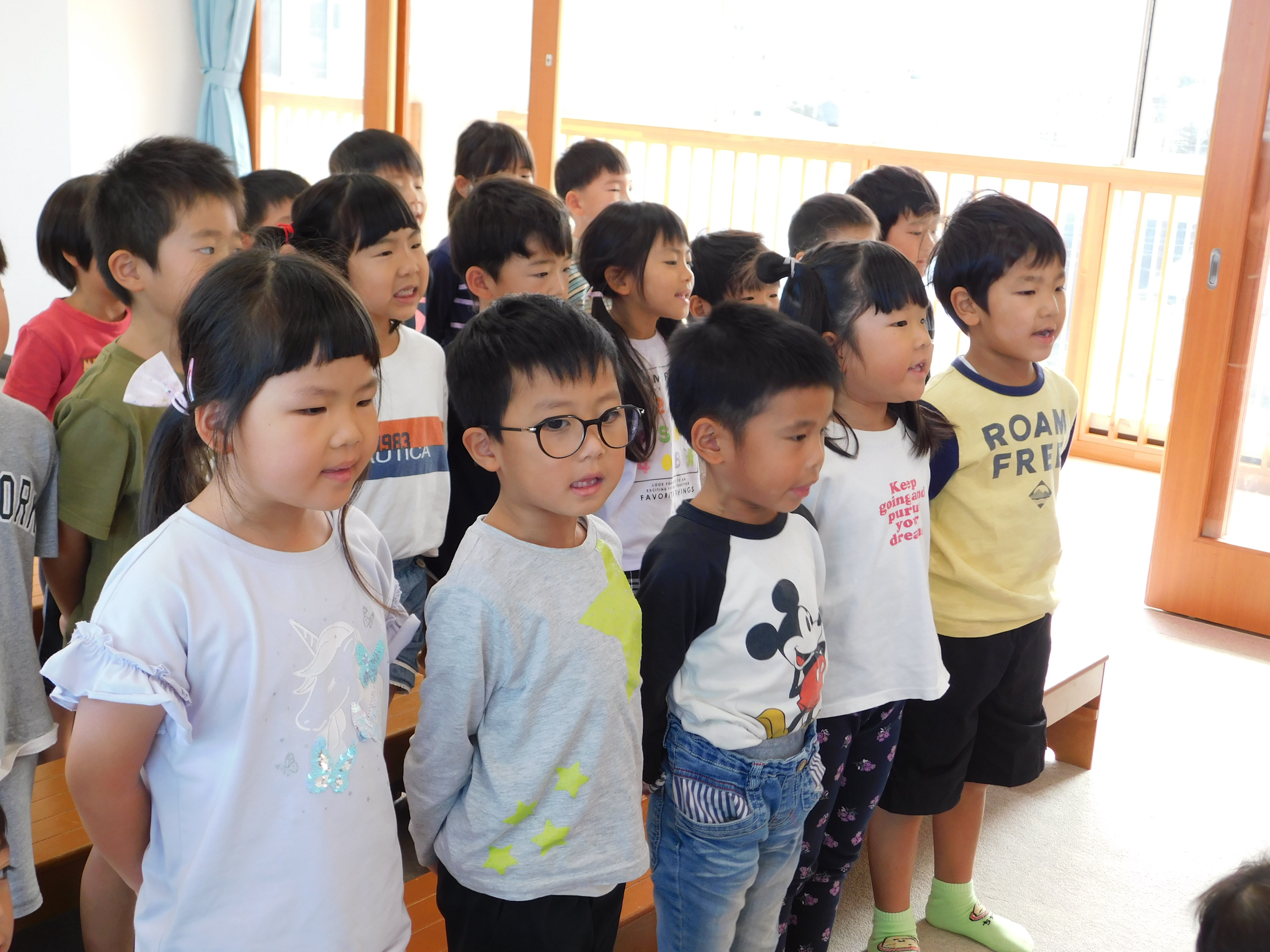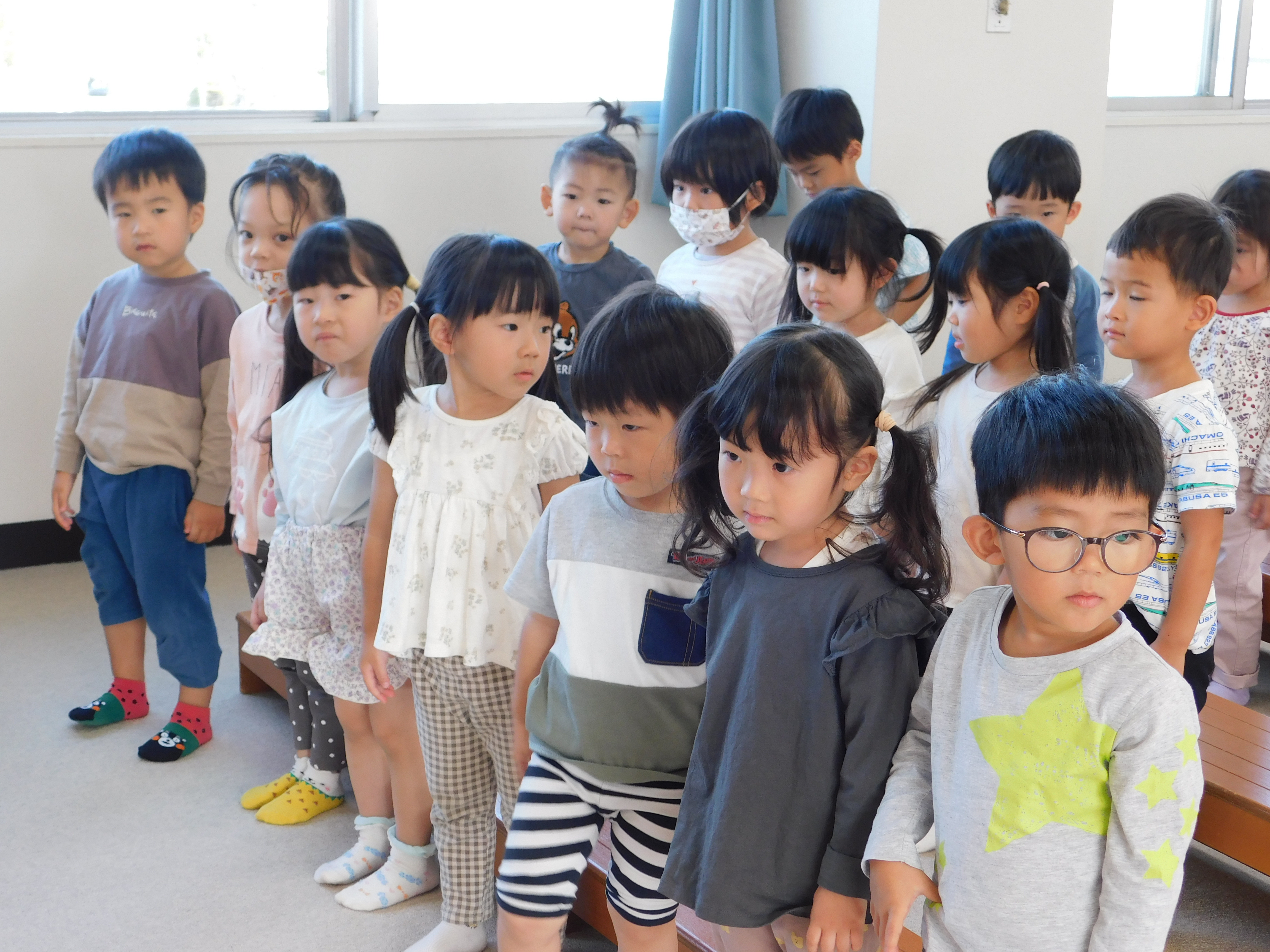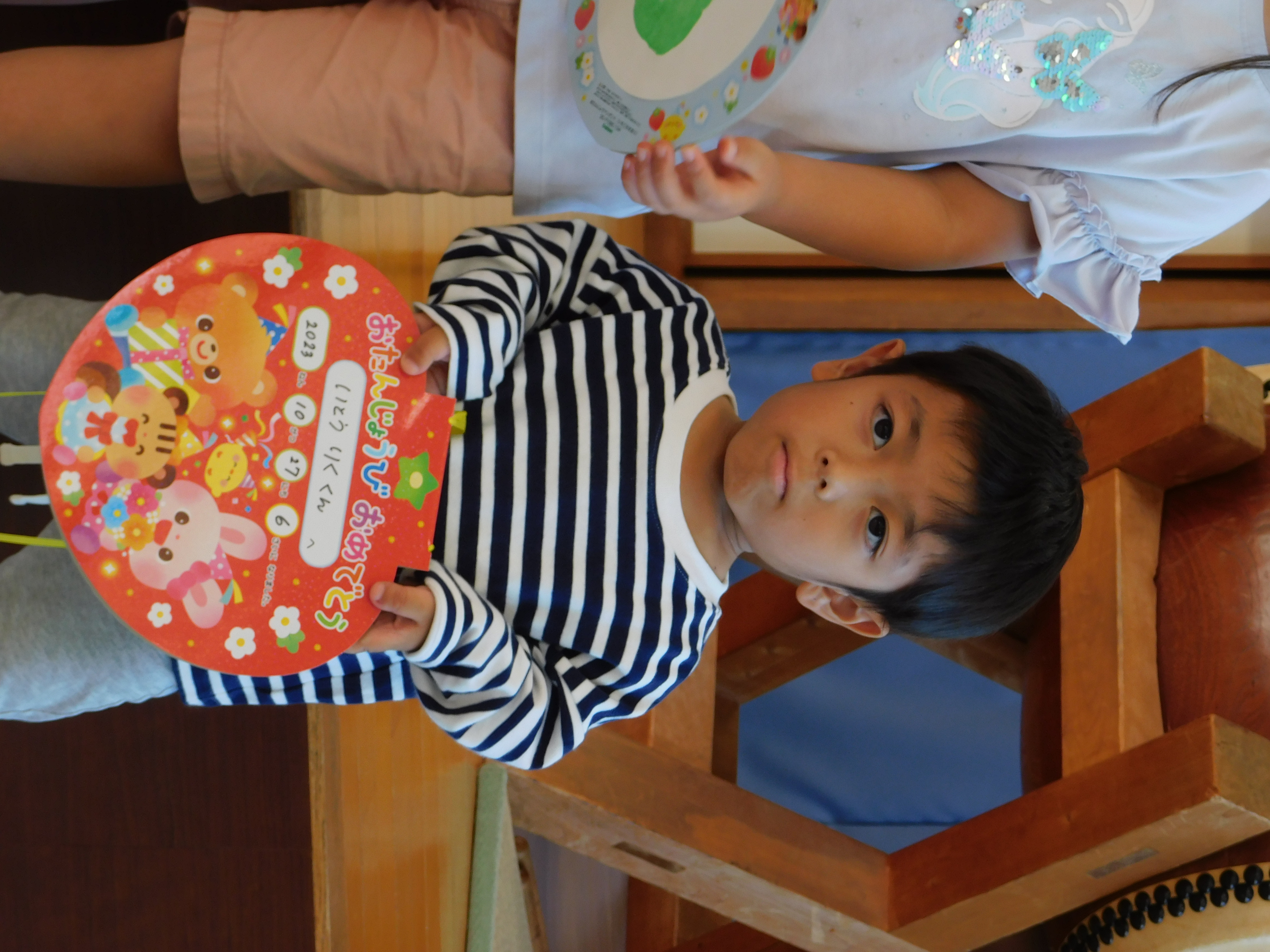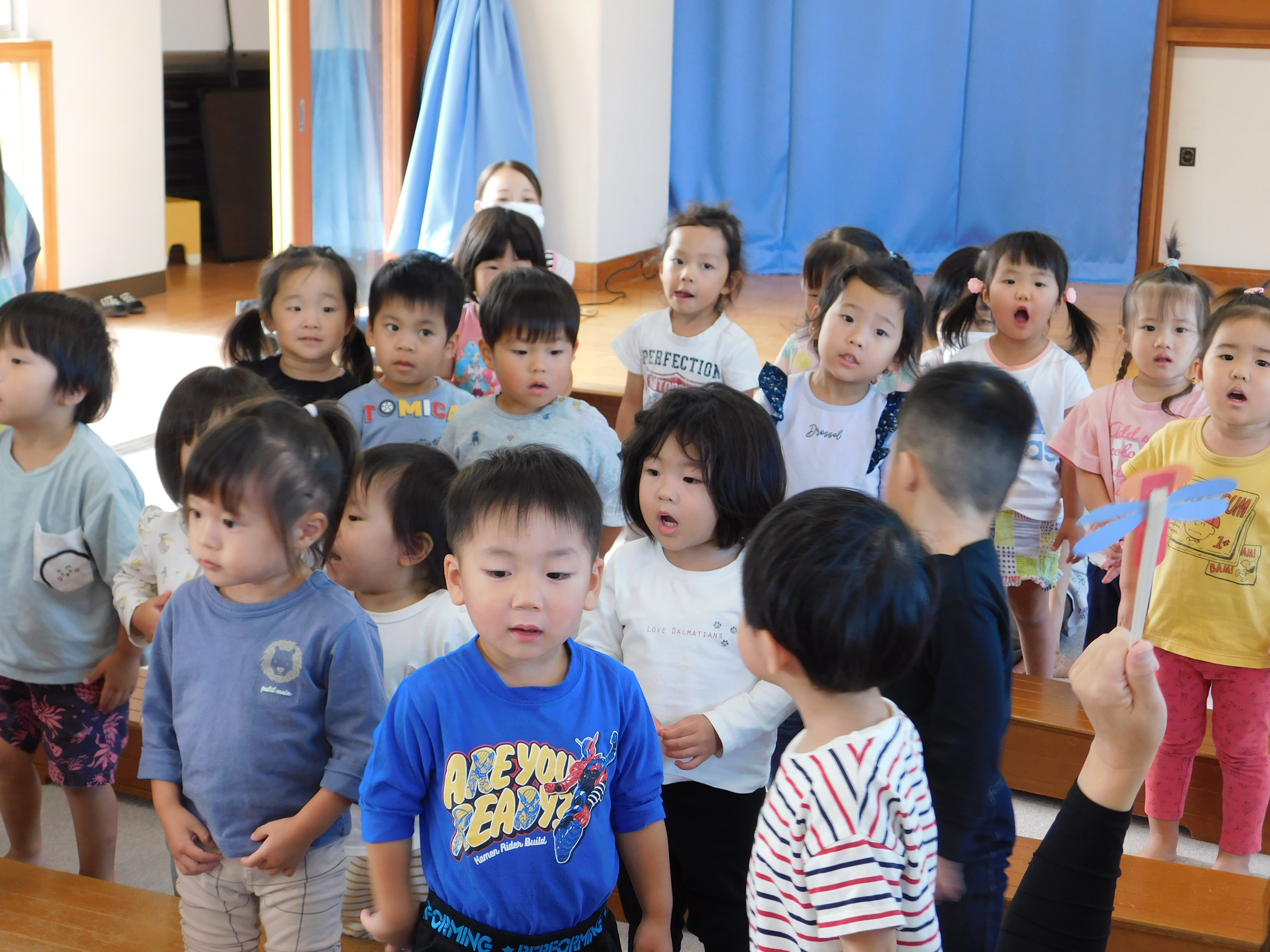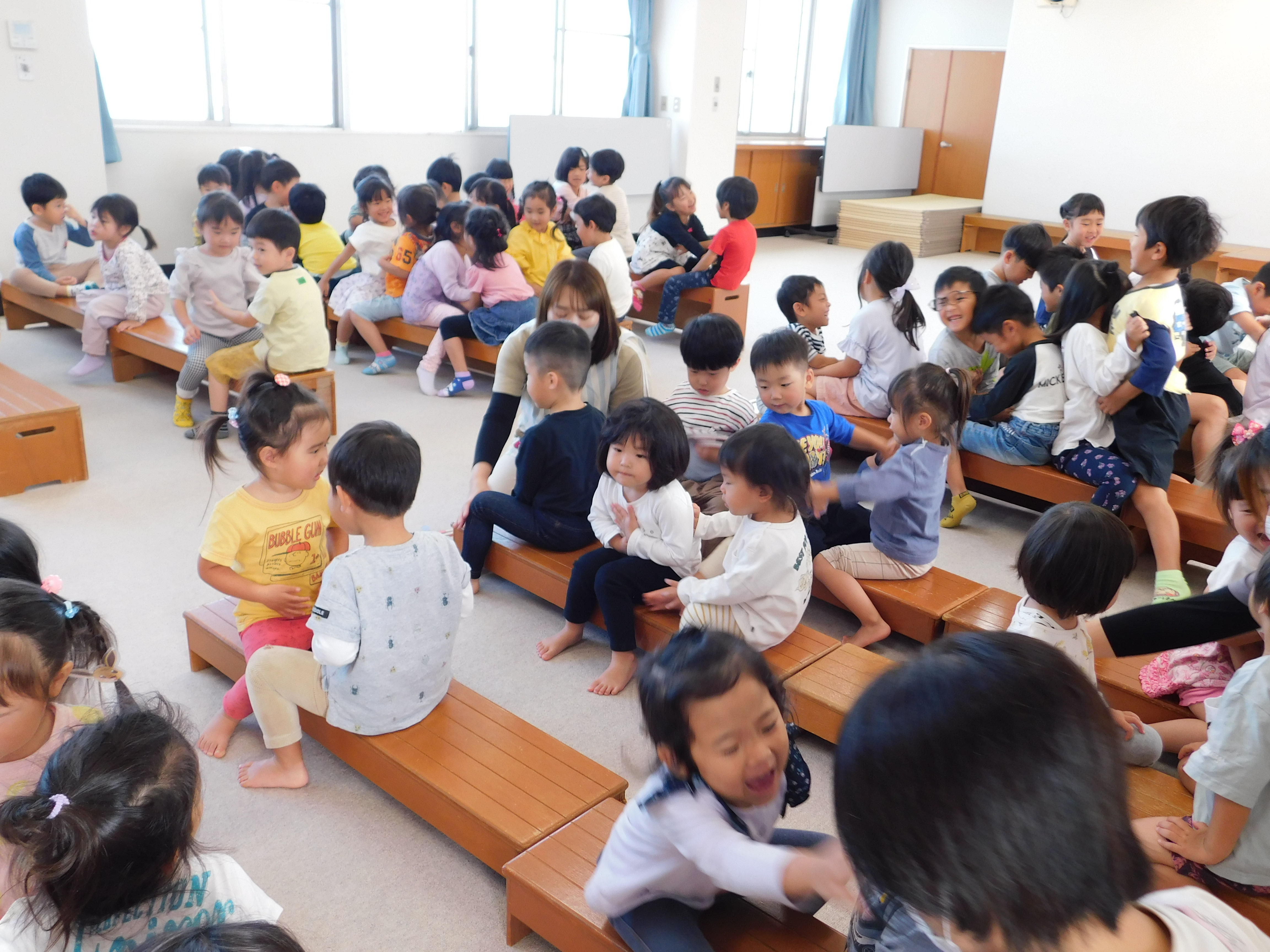 10月のお誕生会の様子です。誕生児のお友だちには、みんなの前で名前と年齢、そして、「好きな食べ物は?」などの保育士の質問に答えてもらっています♪ ドキドキと緊張しながらも、みんな上手に言うことができました(*^_^*) お誕生日のお友だち!!おめでとうございます♡