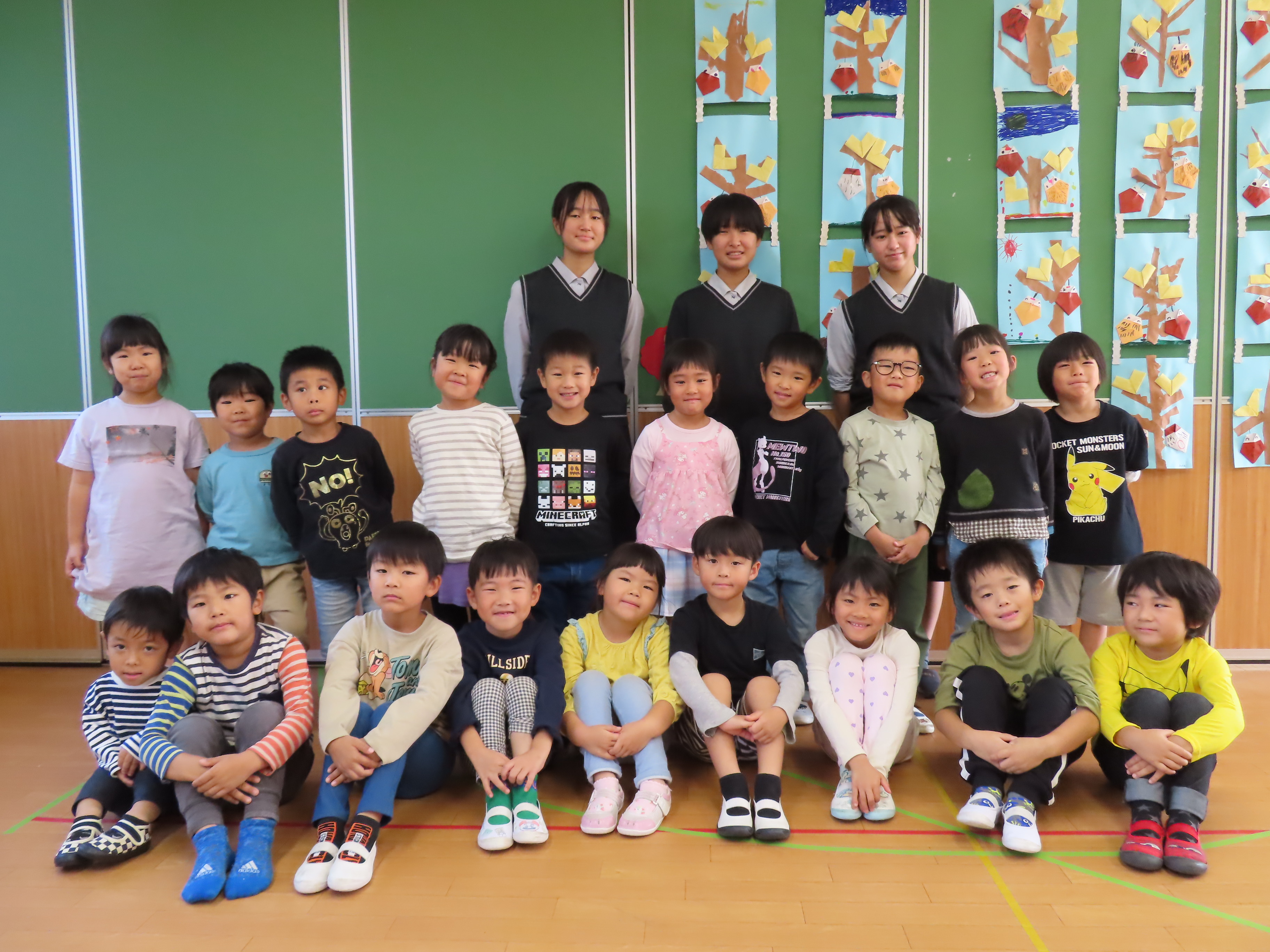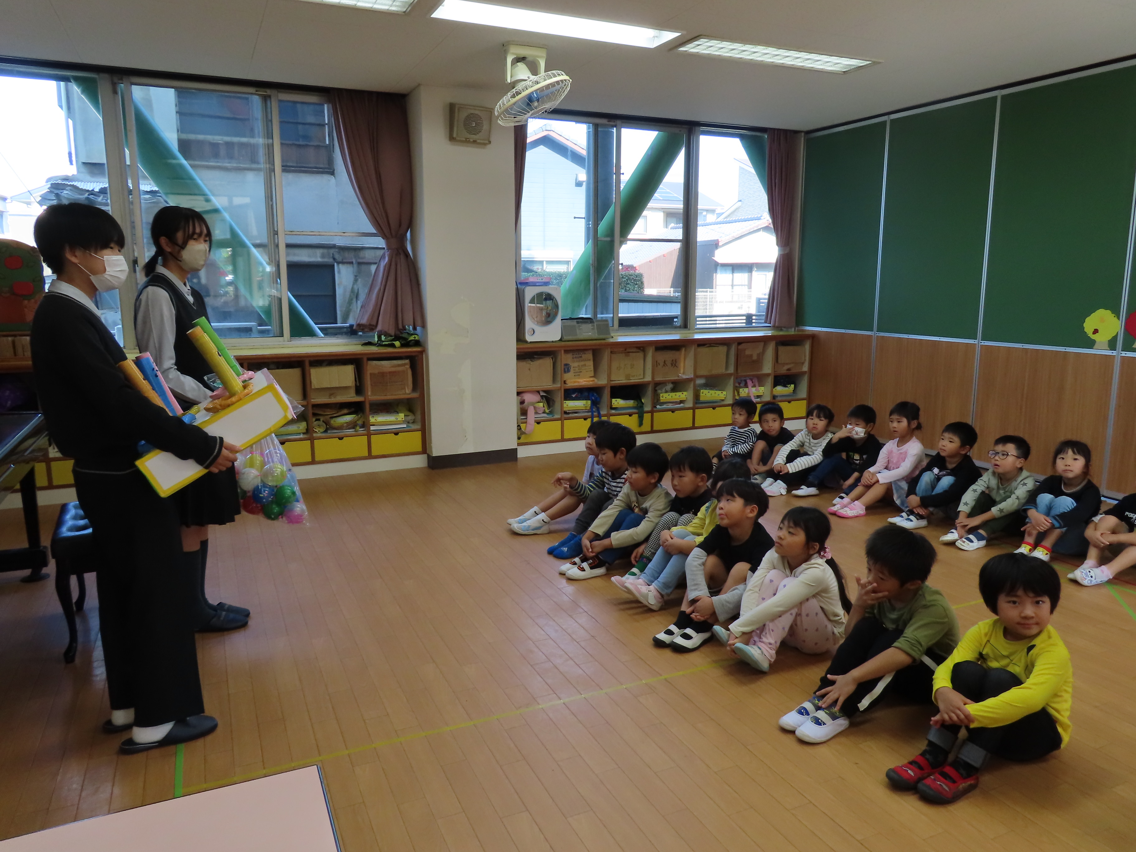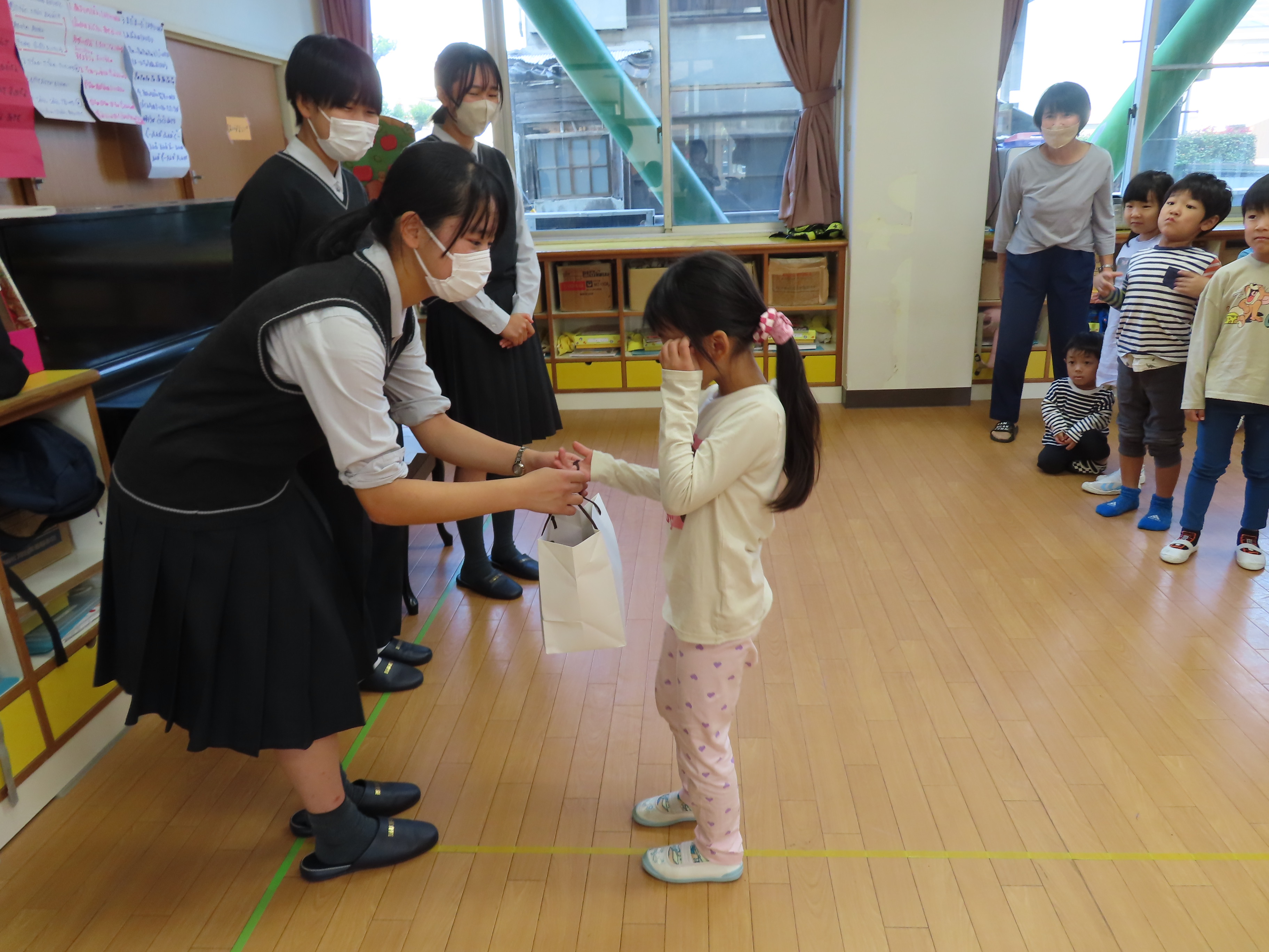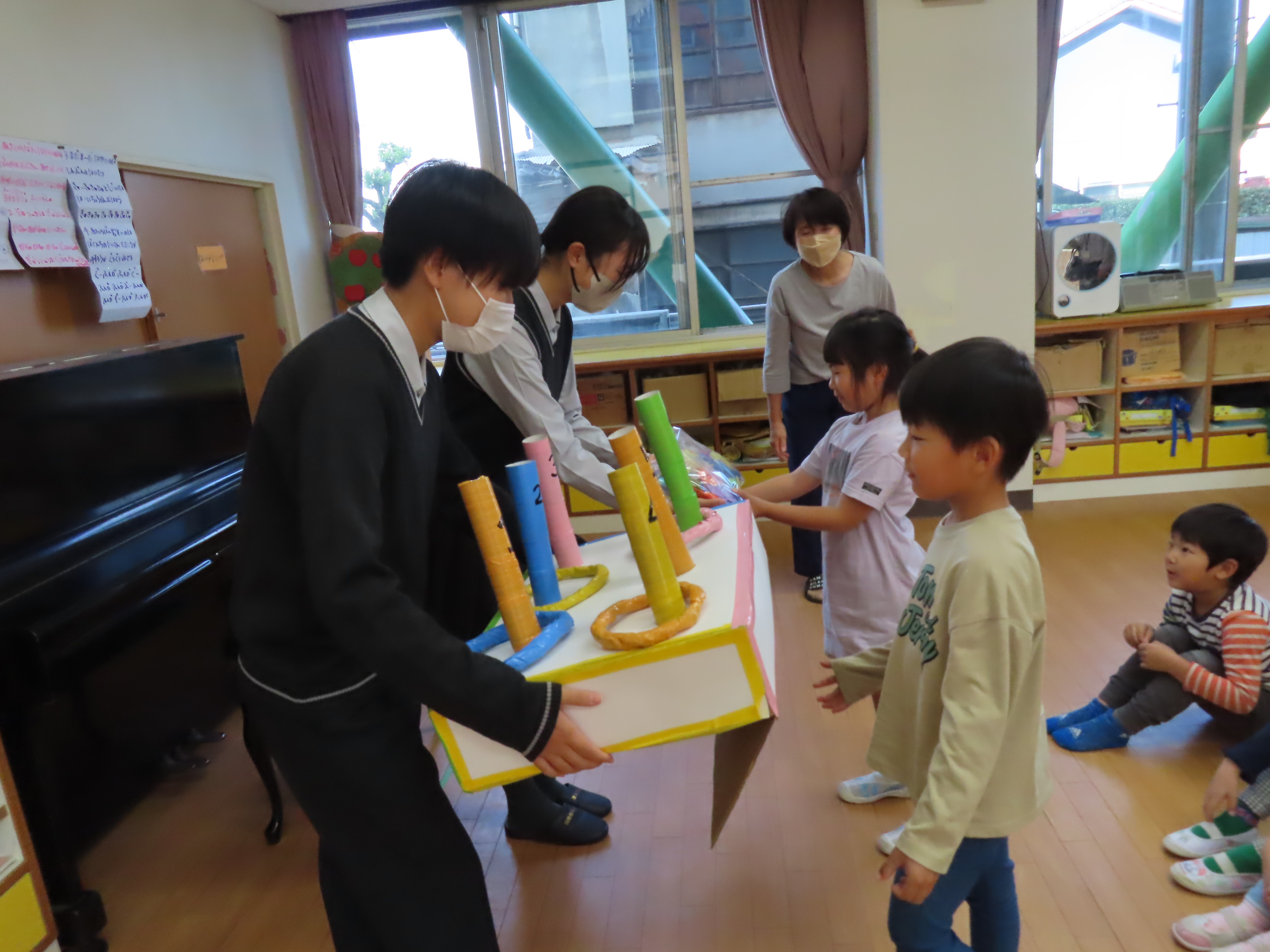 西校生の1年生が、子どもたちと交流するために来園してくれました。本来なら、大勢の学生さんたちが来てくれて、子どもたちと一緒に遊んだりと楽しい時間を持つ予定だったのですが、インフルエンザの感染回避のため代表の4名が園にきてくれ、学生さんたちが作ってくれた手作りおもちゃを子どもたちにプレゼントしてくれました。一緒に遊べなかったのは残念でしたが、クイズゲームをしたり、子どもたちからの歌のプレゼントを聞いてもらったりと少しの時間ではありましたが、一緒に楽しい時間を過ごしました(*^_^*) 頂いた手作りおもちゃで、楽しく遊びたいと思います♪ 学生さんたち!ありがとうございました。