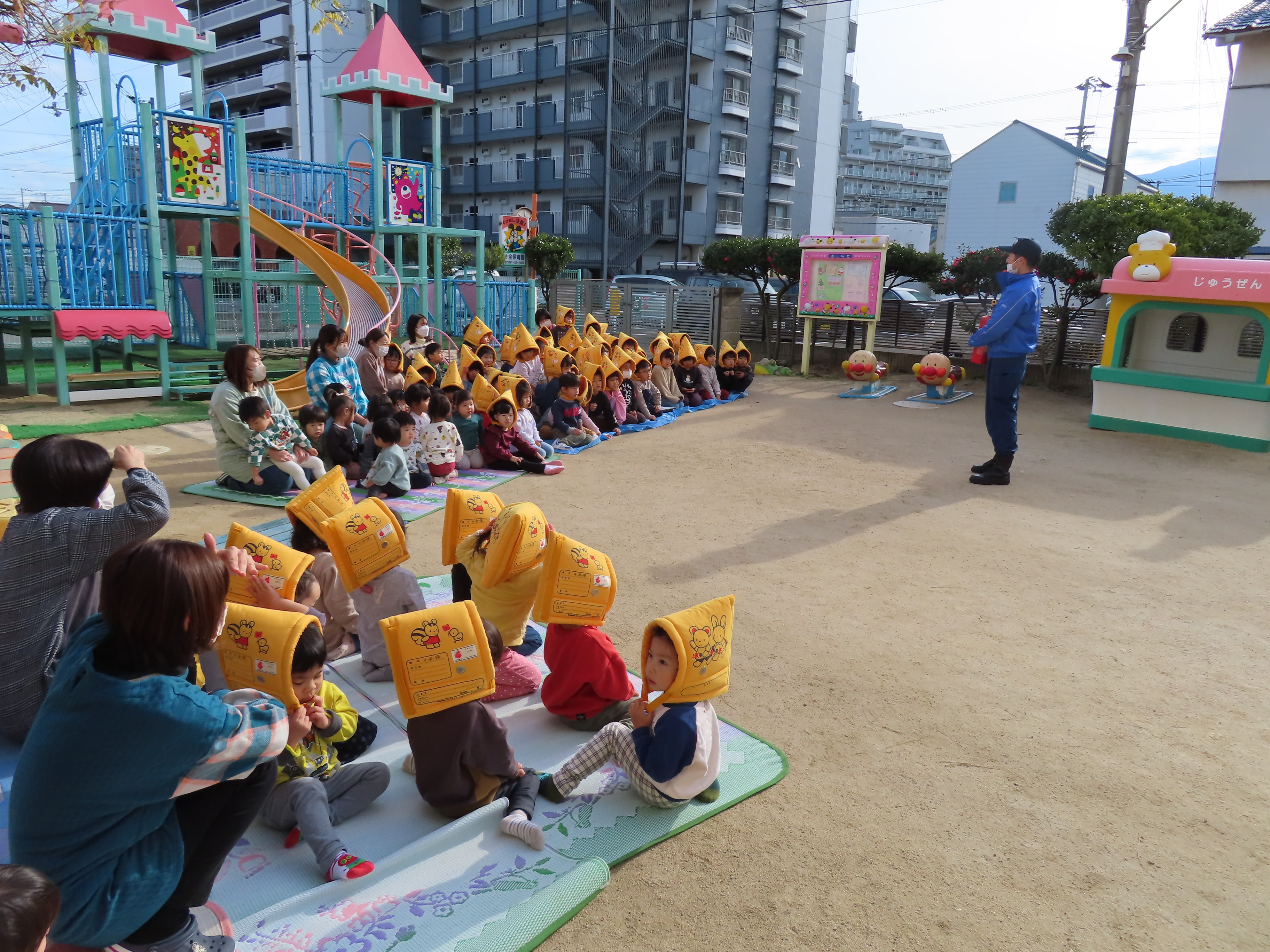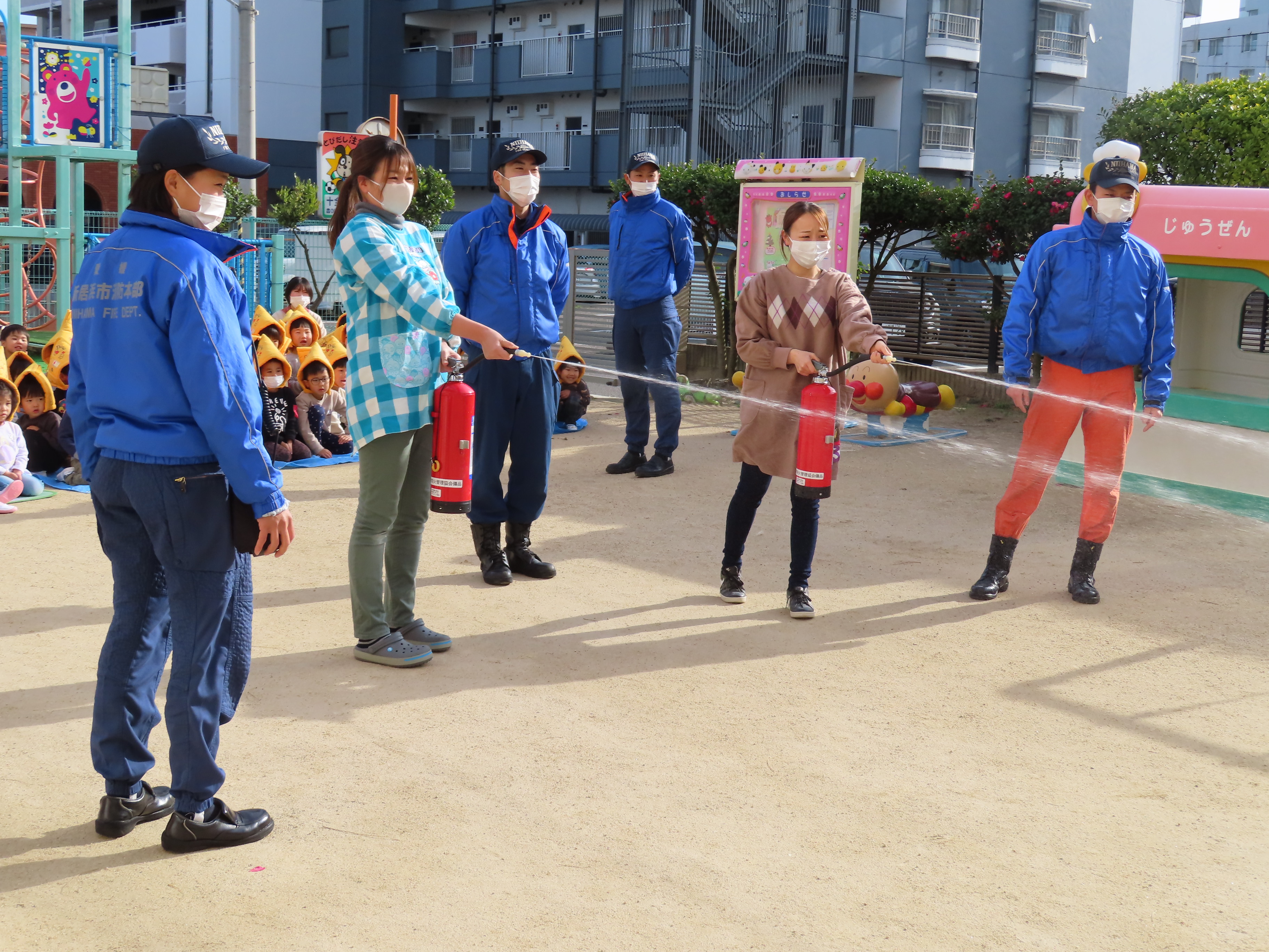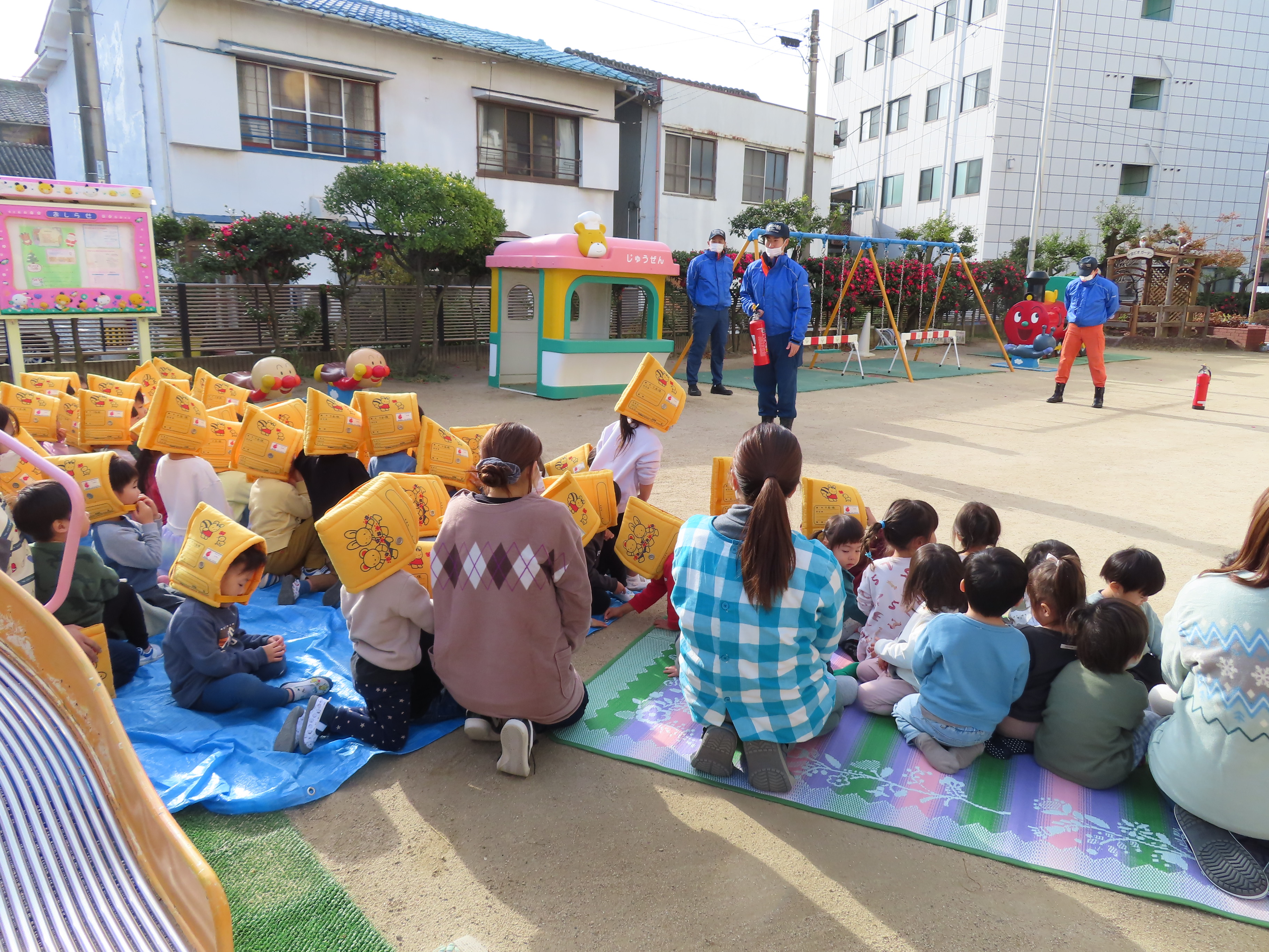火遊び防止教室がありました。消防署の方々が来てくれ、避難訓練をしている様子も見て頂きました。また、保育士は、もしもの時に備えて消火器の使い方を再度確認しながらの訓練も行いました。消防署の方と火遊びは絶対にしないこと。火事をみつけた時は、すぐに逃げる。大人に知らせる。をお約束しました!