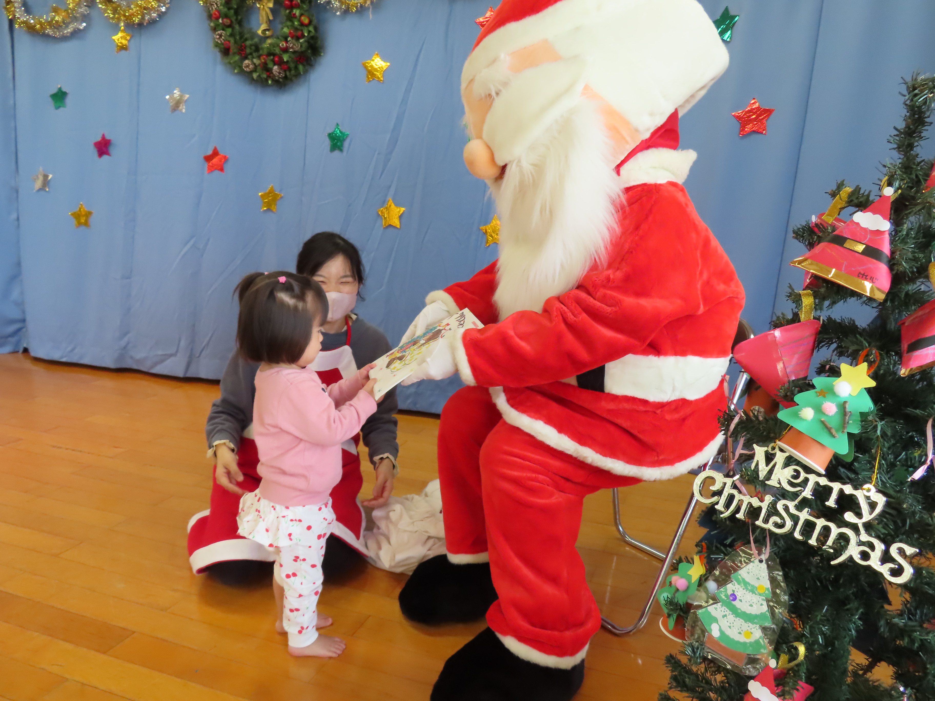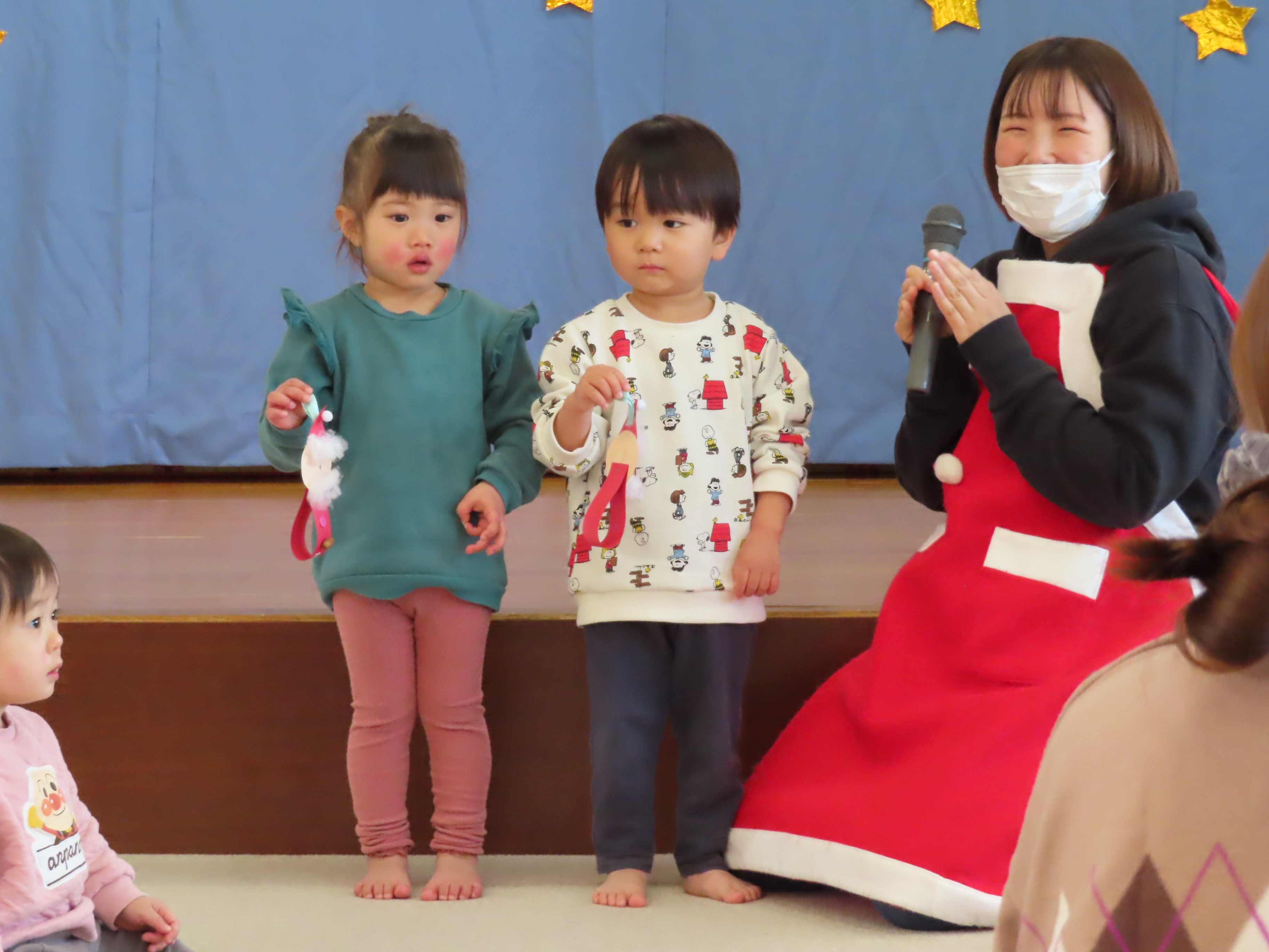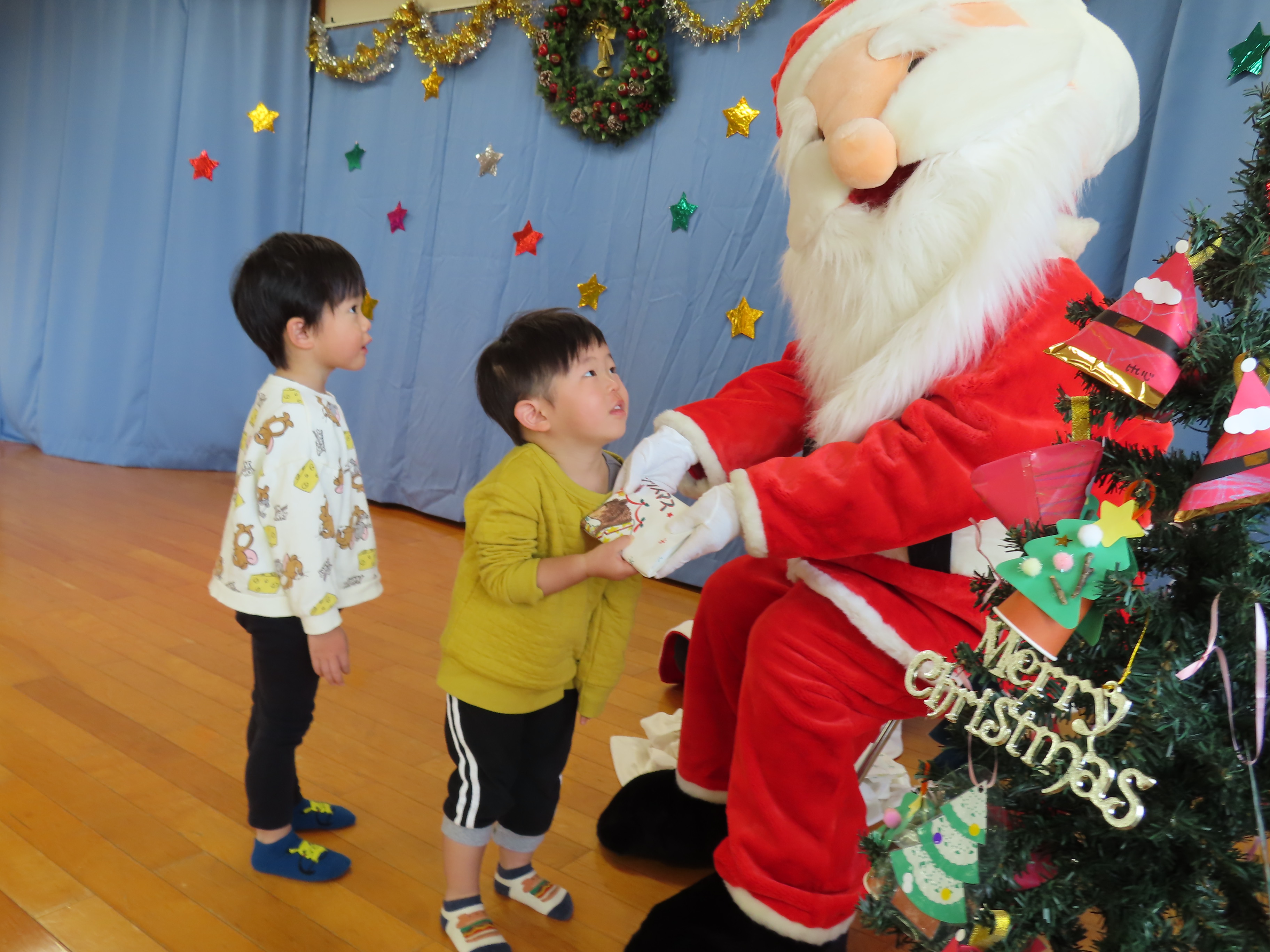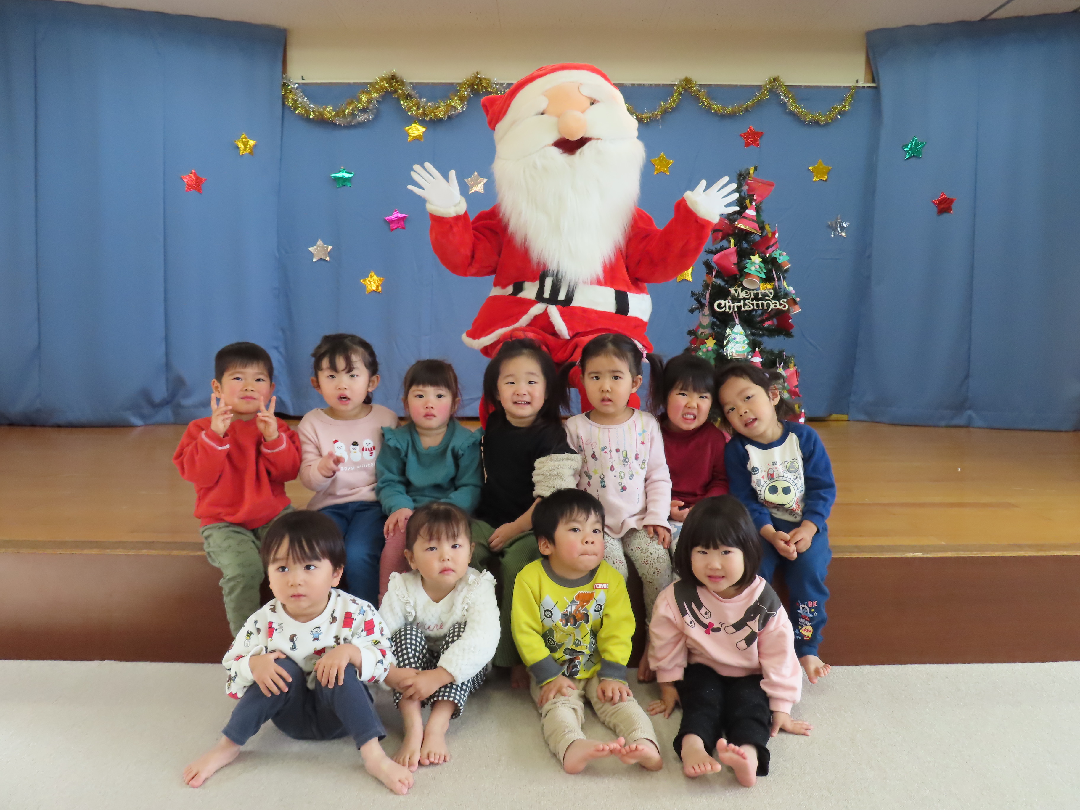 やってきました!クリスマス~♪きてくれました‼サンタさん~♡ みんなのお家にもサンタさんが来てくれたかな?十全保育園にもサンタさんがきてくれたので、みんなと一緒にクリスマス会を楽しみました(*^_^*) 思いのほか、大きなサンタさんの登場に小さなお友だちは驚いて、泣いちゃいました(*_*; それでも、少しづつサンタさんの存在に慣れつつ…笑顔も増えていった子どもたちです。 各クラス、手作りしたオーナメントを紹介したり、代表でサンタさんからクリスマスプレゼントをもらったり、保育士による催し物を楽しんだりと、みんなでステキな時間を過ごしましたよ♪ 今年最後の大イベント!!をみんなで楽しめて良かったです(*^_^*)