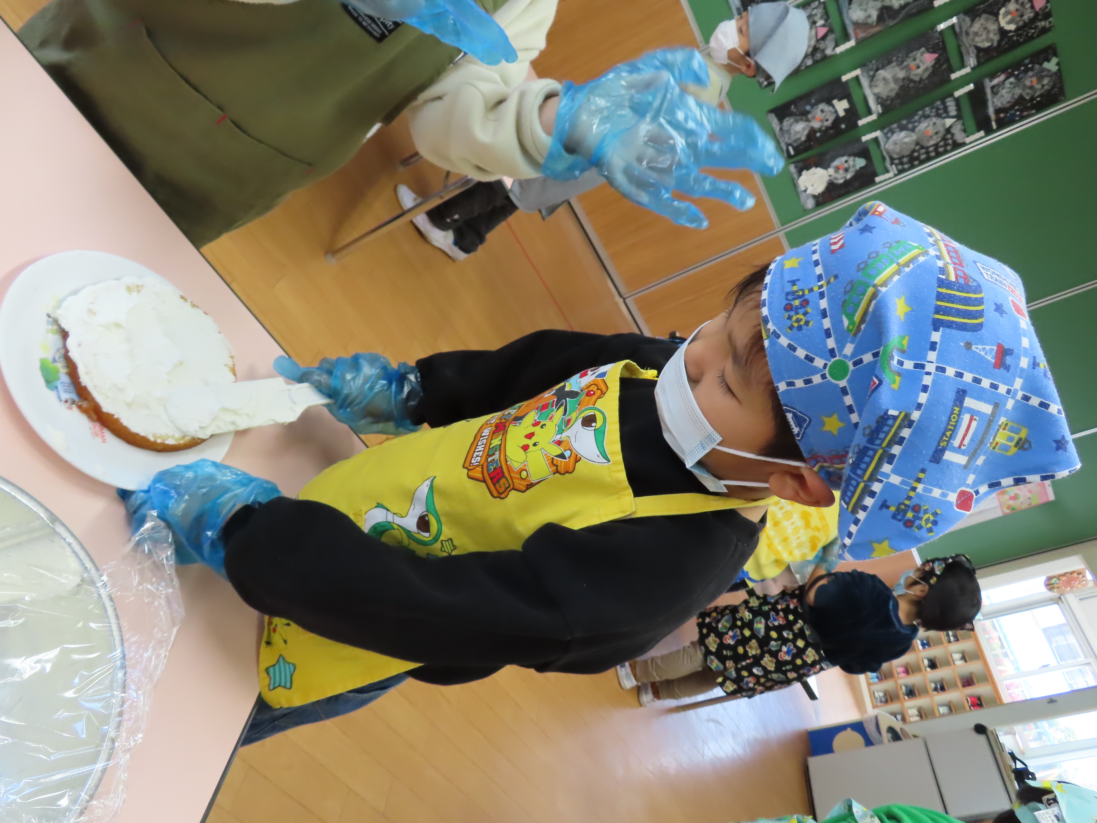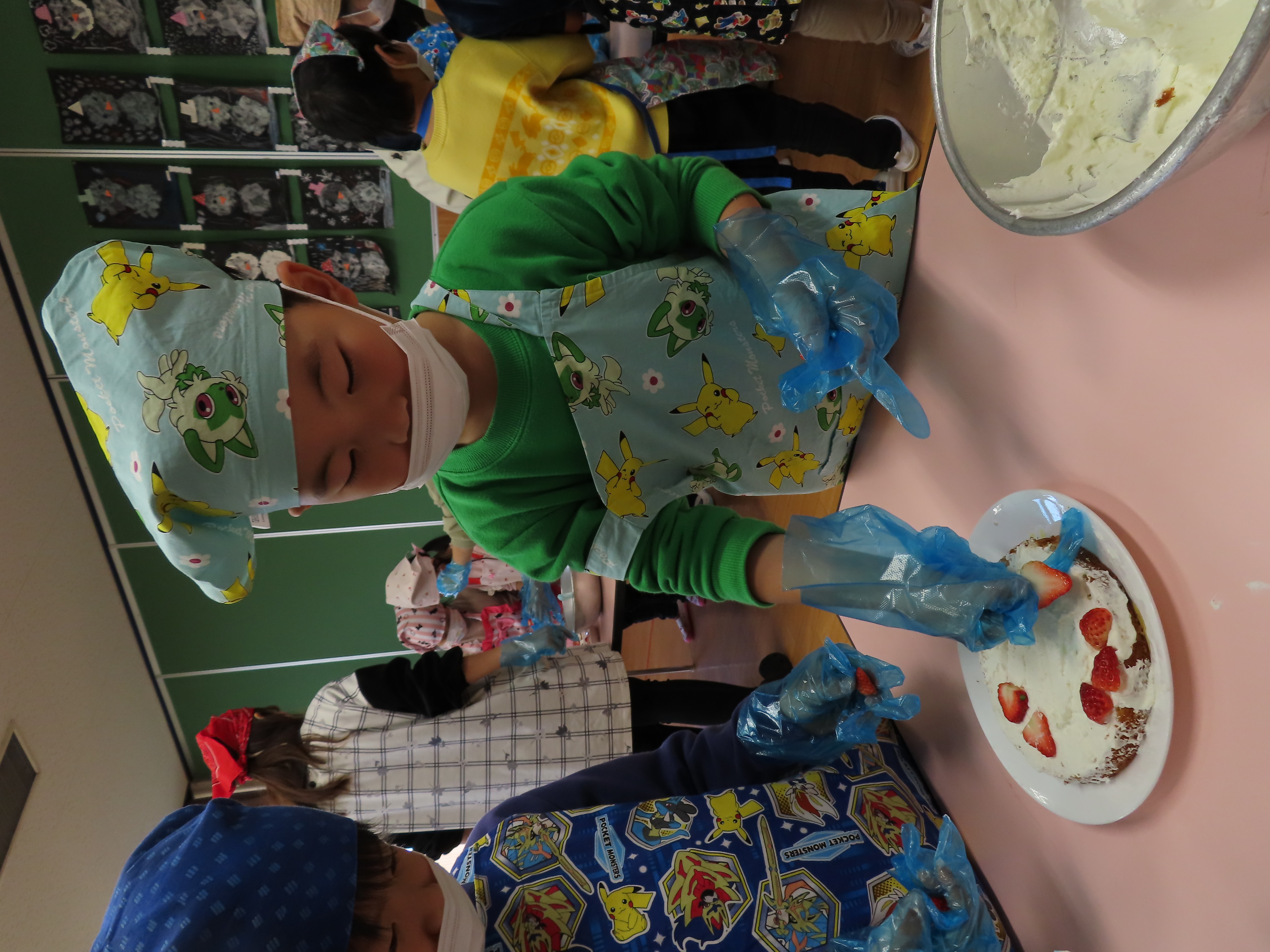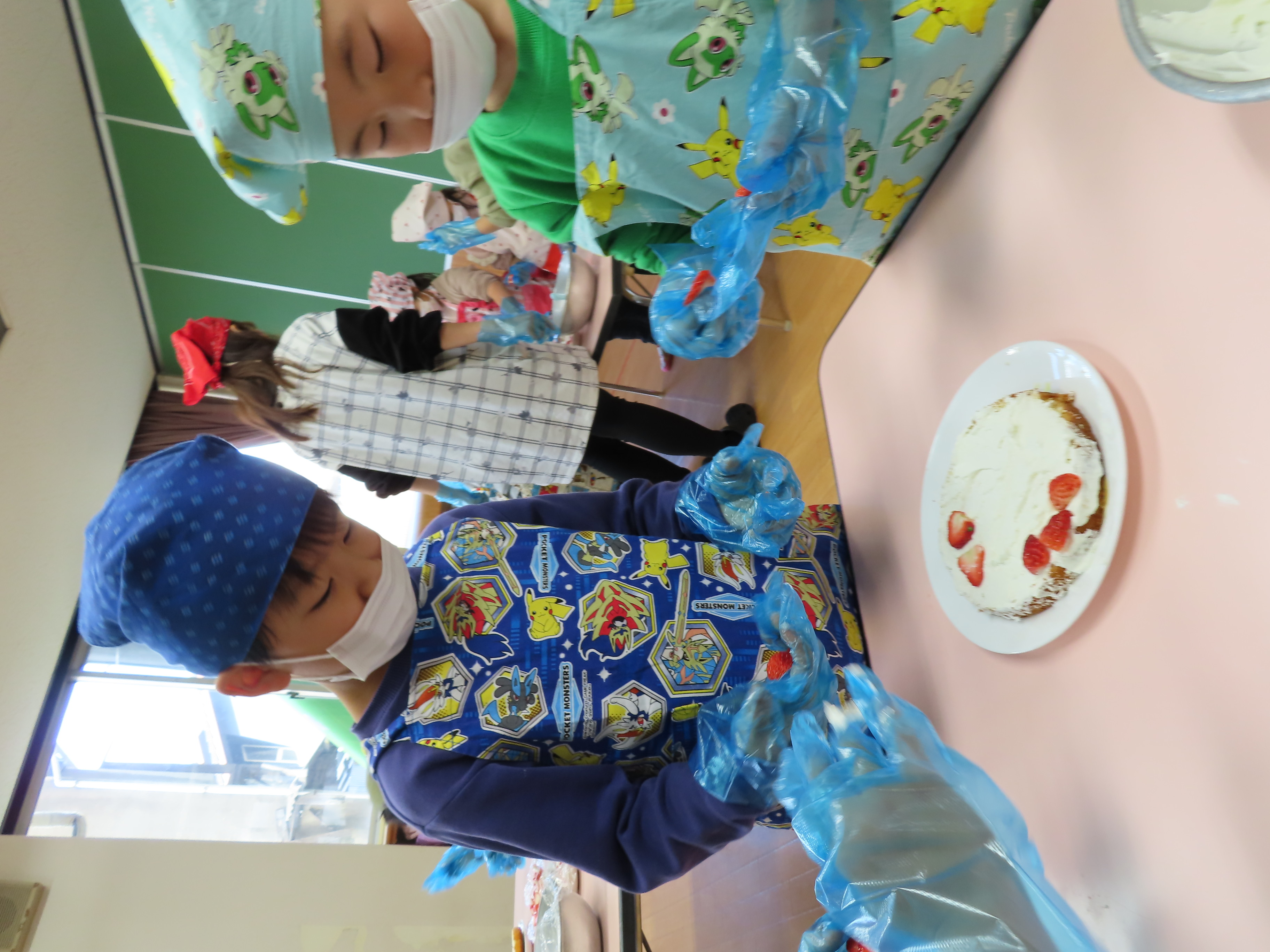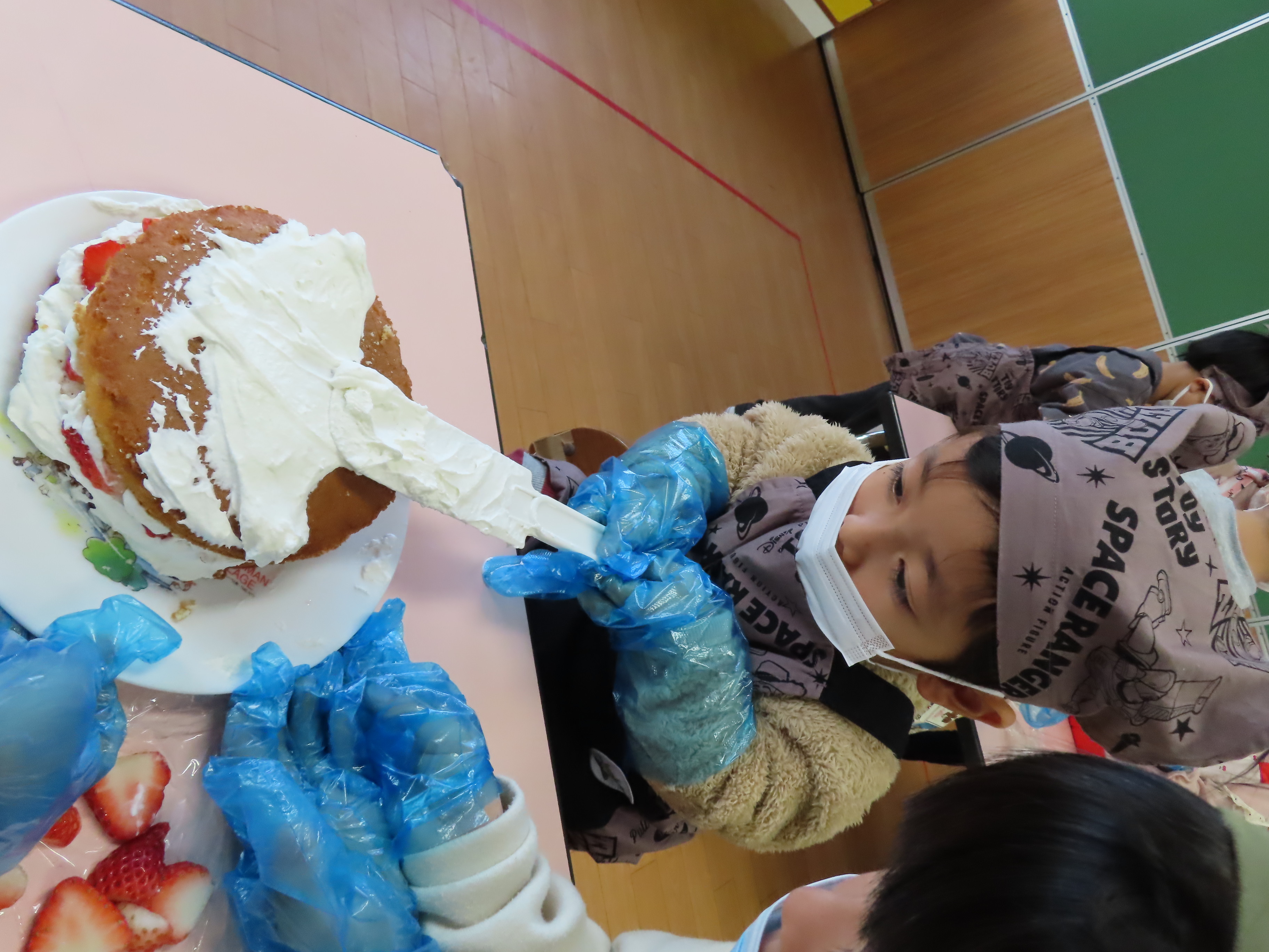 年長児さんたちは、クリスマスケーキ飾りをしました♪ 生クリームを塗って、苺をのせて♡かわいくデコレーション(*^_^*) 「先生~!早く食べたあ~い!」と言いながら、作ってました(笑)自分たちで飾ったケーキをおやつに頂きました!ごちそうさまでしたっ!!