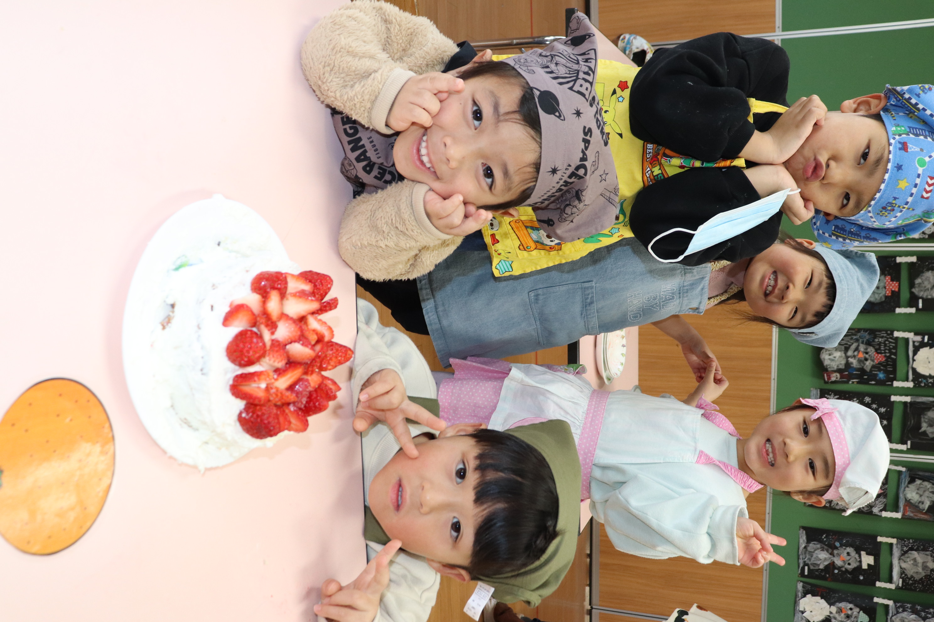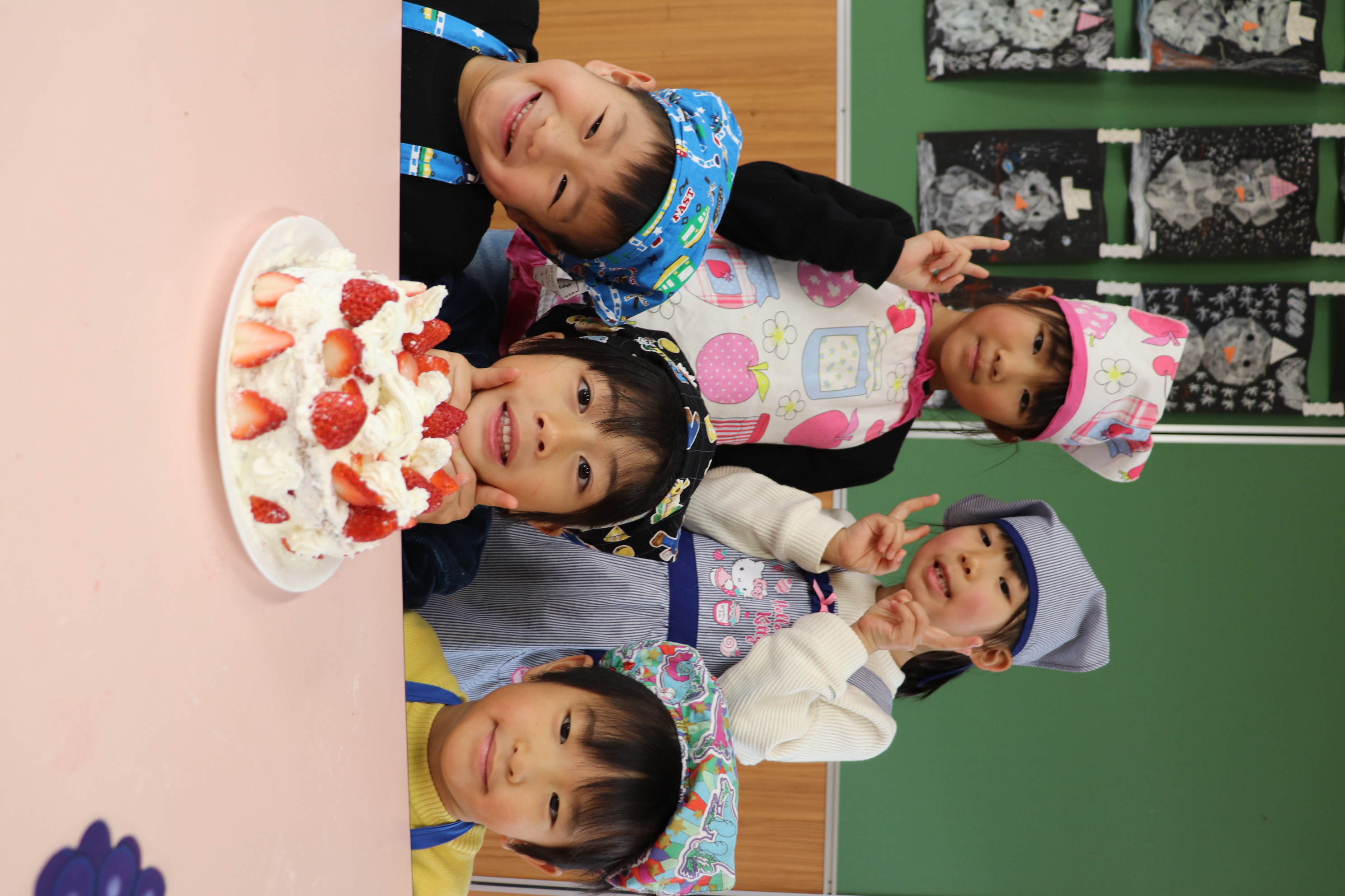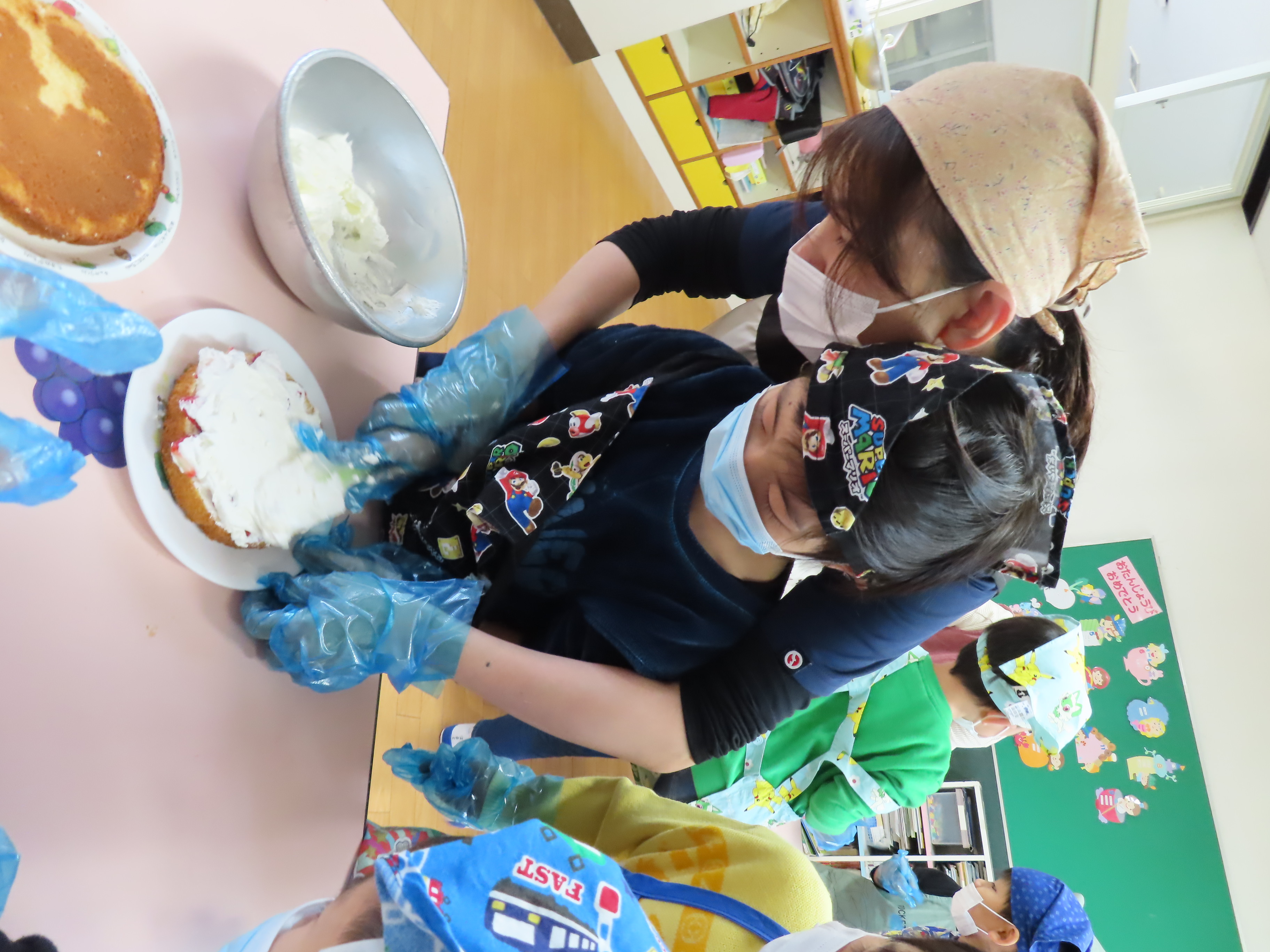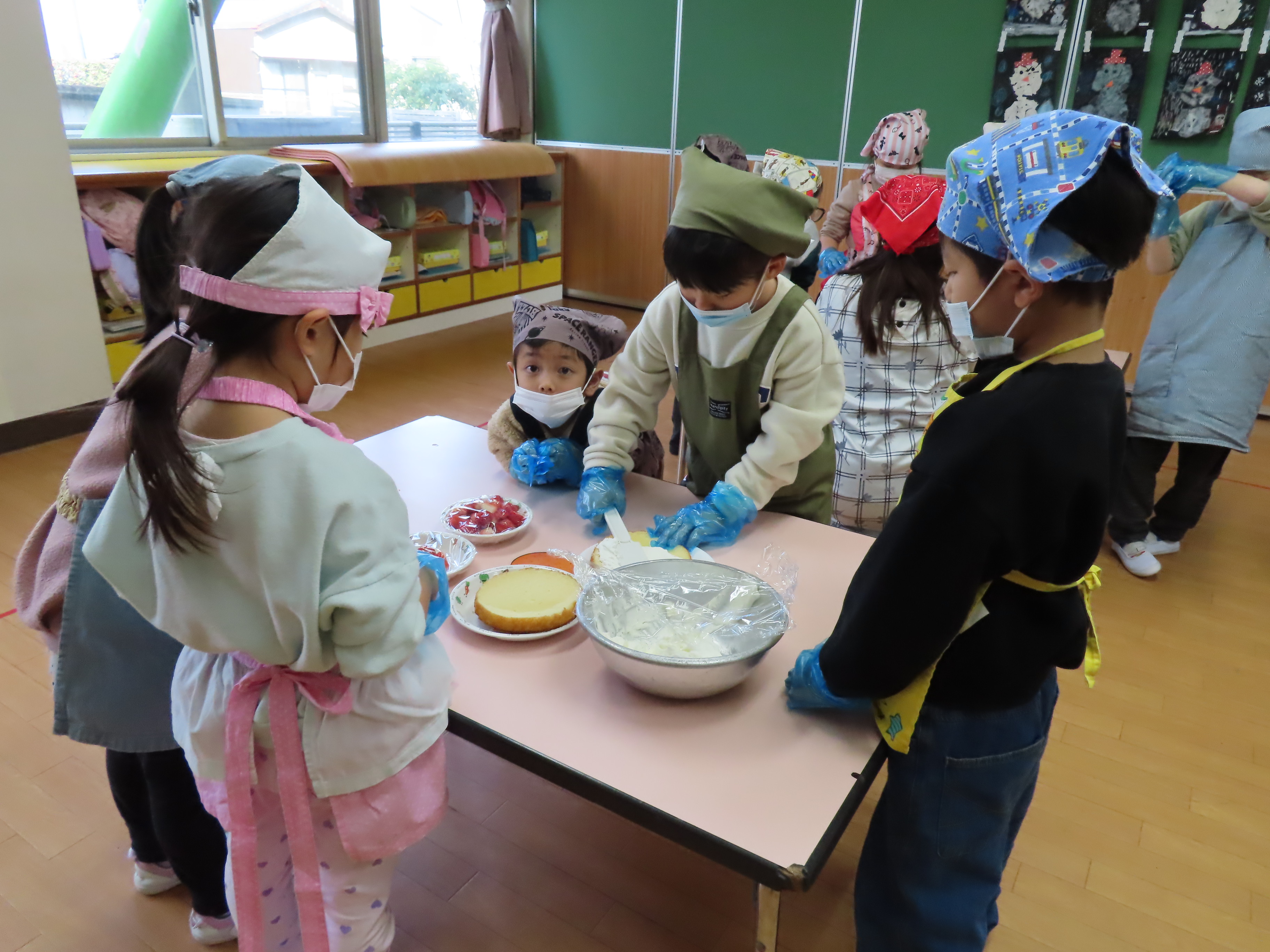 年長児さんたちは、クリスマスケーキ飾りをしました♪ 生クリームを塗って、苺をのせて♡かわいくデコレーション(*^_^*) 「先生~!早く食べたあ~い!」と言いながら、作ってました(笑)自分たちで飾ったケーキをおやつに頂きました!ごちそうさまでしたっ!!
