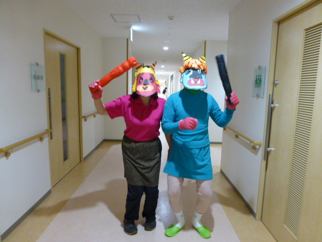 2/3節分2014年2月3日 今日は節分。 朝礼のあと、豆まきをしましたよ。 季節の変わり目には邪気(鬼)が生じると考えられており、 それを追い払うための悪霊ばらい行事なんです。 年女・年男です。 「福は内、鬼は外」の掛け声で 豆を投げつけられるかわいそうな鬼!! 職員 だれとだれでしょうか??? 豆は痛かったよ~~~。 でも、美味しかったです。 皆さん、元気に過ごしましょう。。 施設情報愛媛県新居浜市にある養護老人ホーム慈光園ご利用される方の一人ひとりの意志および人格を尊重し、安心して豊かな施設生活を営むことができるよう必要な支援を行います。養護老人ホーム 新居浜市立 慈光園〒792-0035愛媛県新居浜市西の土居町1-6-20 TEL:0897-32-4325 FAX:0897-32-4328慈光園WEBサイト最近の記事2025年10月27日芋アート養護老人ホーム 慈光園2025年10月27日芋ほり養護老人ホーム 慈光園2025年10月16日太鼓台 訪問養護老人ホーム 慈光園2025年10月14日new 秋の新作 手芸クラブ養護老人ホーム 慈光園2025年10月14日10月の誕生者おめでとうございます!養護老人ホーム 慈光園2025年10月14日防火訓練(昼間想定)養護老人ホーム 慈光園慈光園の記事一覧