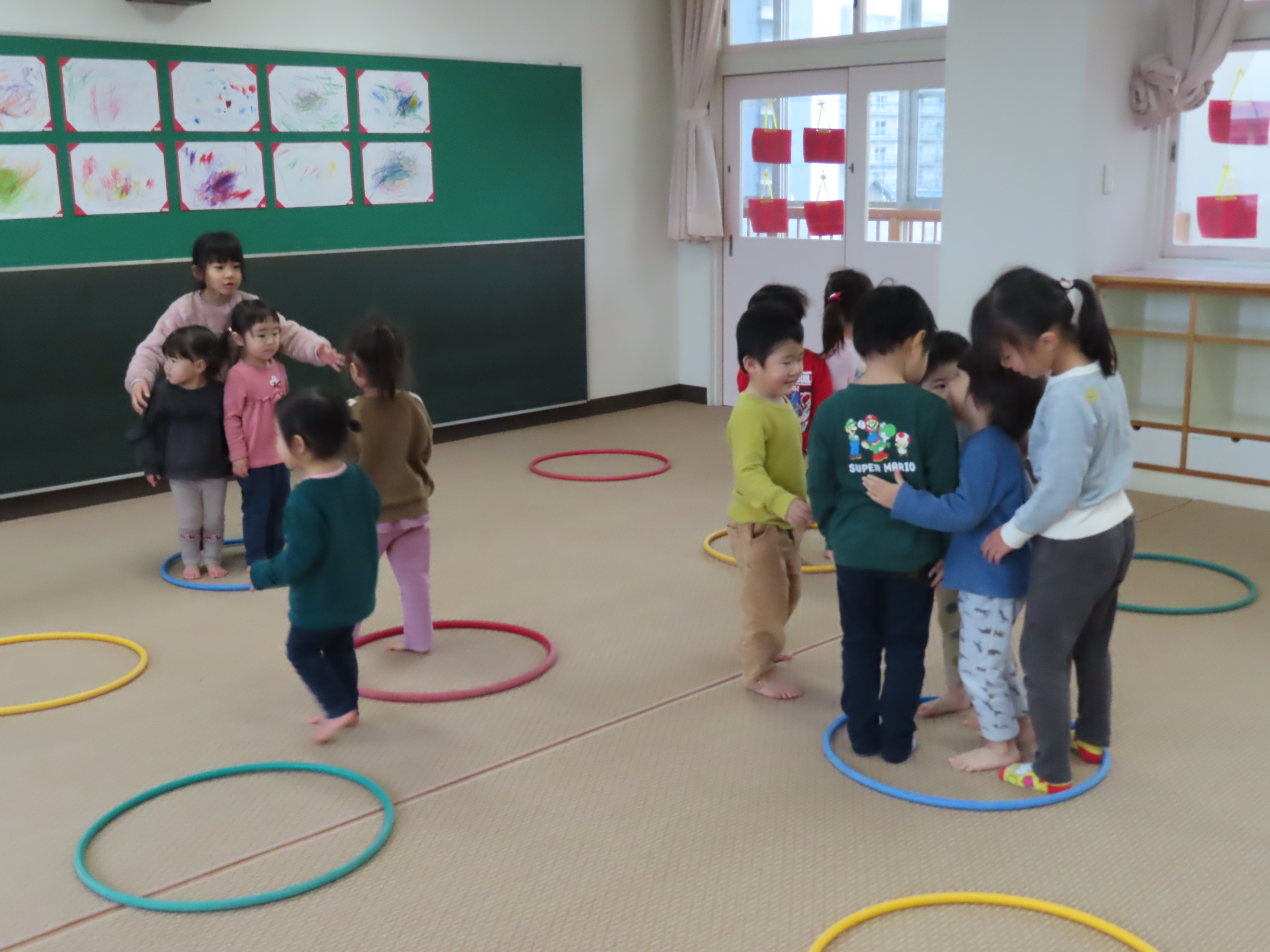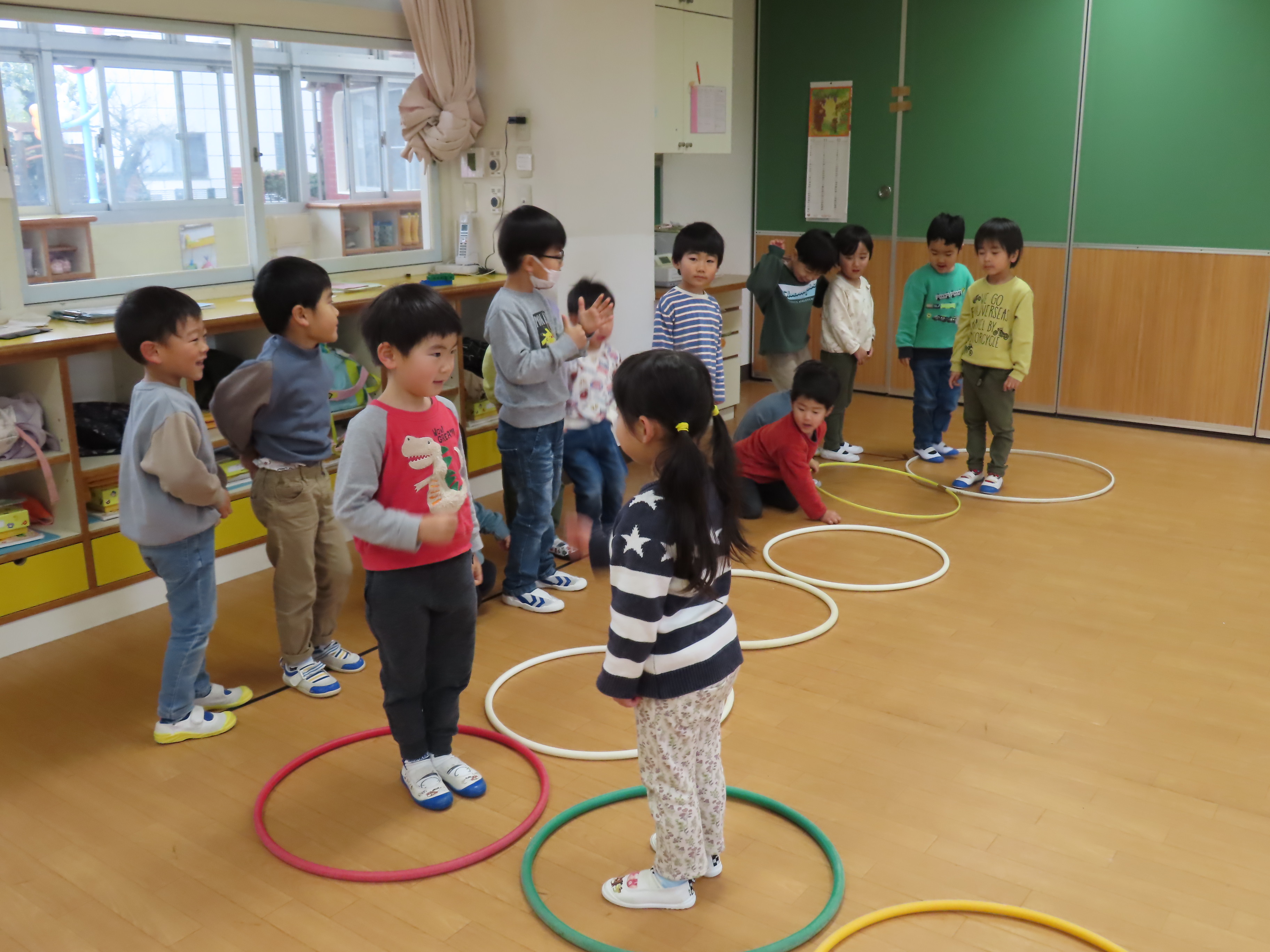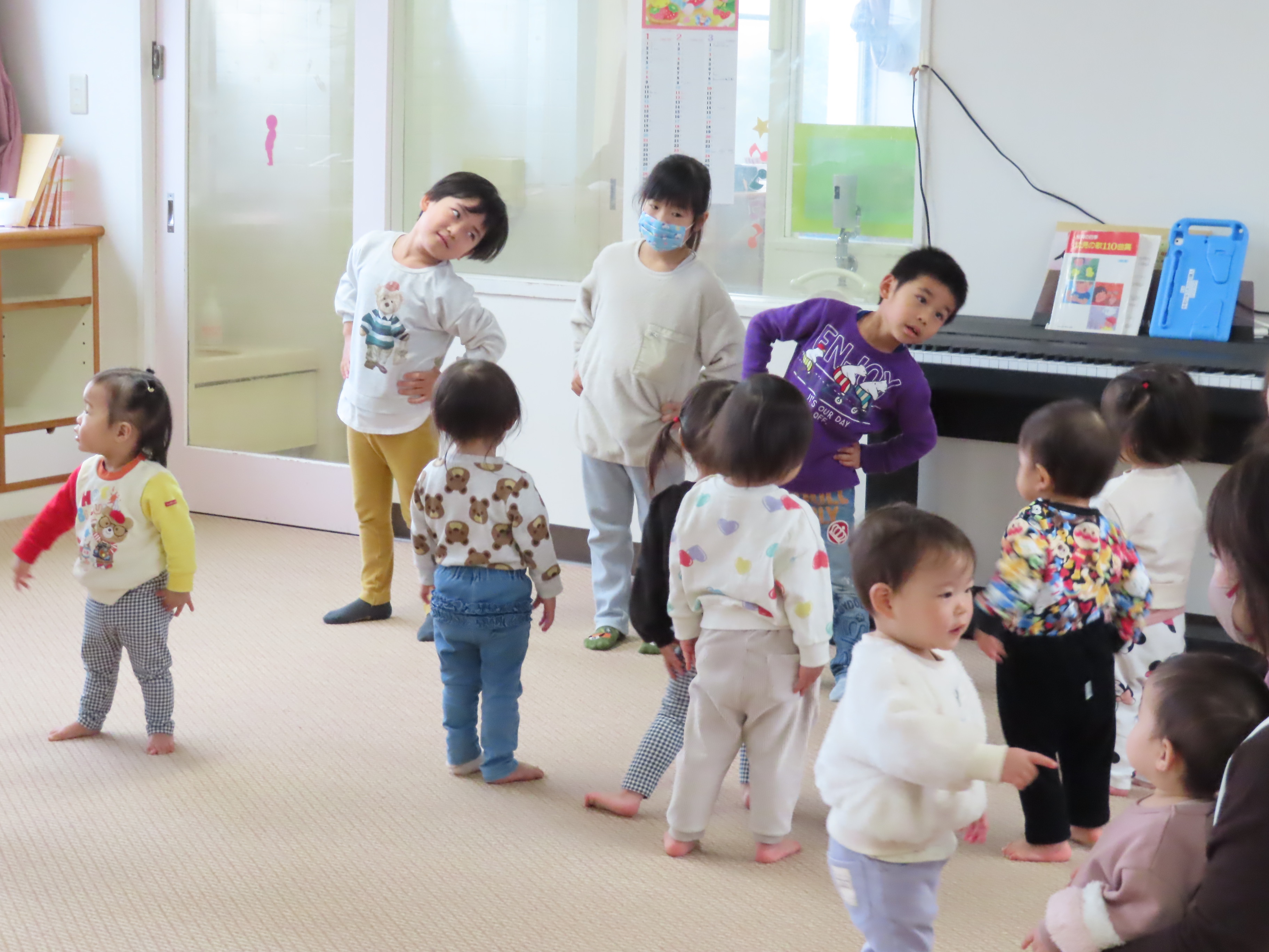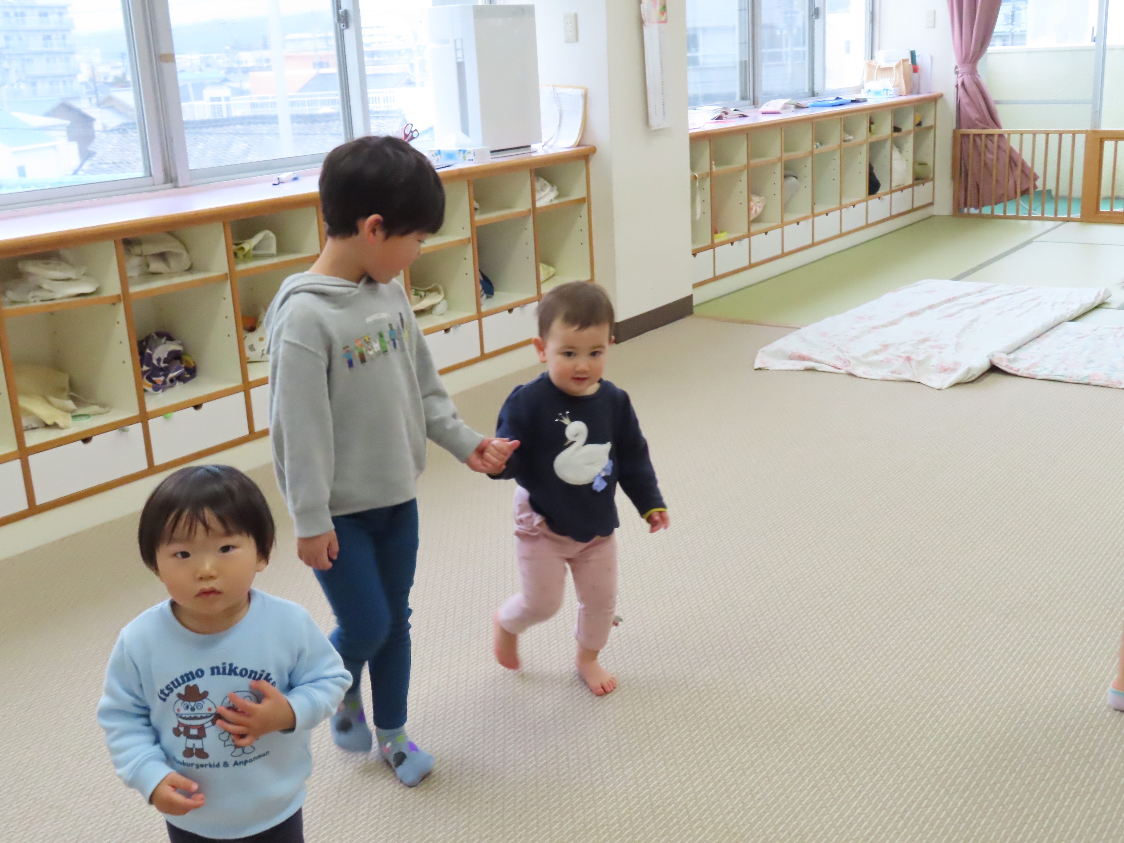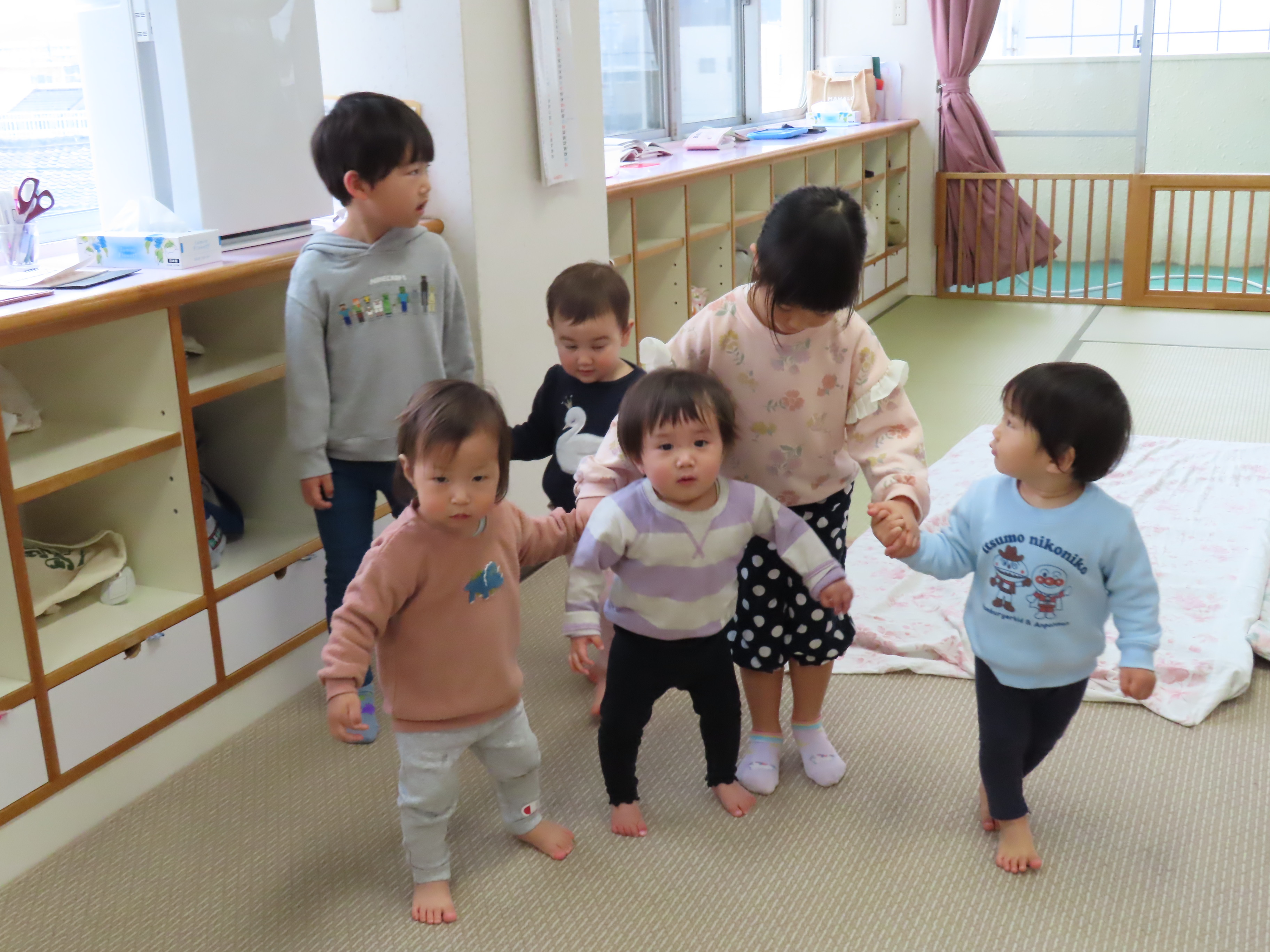 今年度最後の縦割り保育、「仲良しの日」を行いました。年長児さんが、数名ずつ各クラスへお邪魔しての縦割り保育(*^_^*) 何度行っても、最初は緊張するようで…よそ行きの顔をした年長児さんたちでした(笑)同じ時間を過ごしていく中で少しずつ小さなお友だちにも慣れてきて、一緒に踊ったり、手を繋いで歩いたりして距離を縮められたようで良かったです☆ 「みんなかわいかった♡」と年長児さんたちも、嬉しそうでした♪