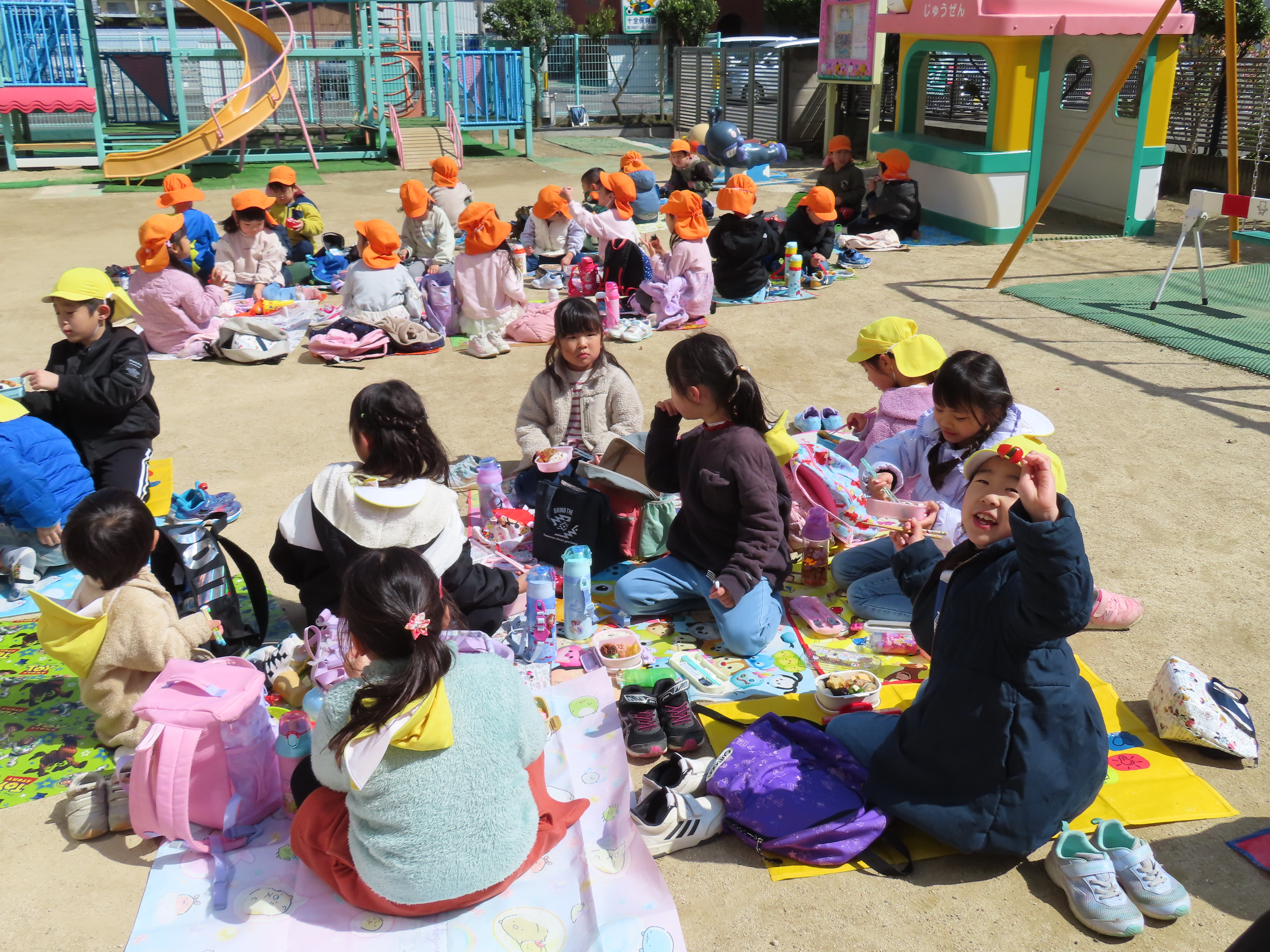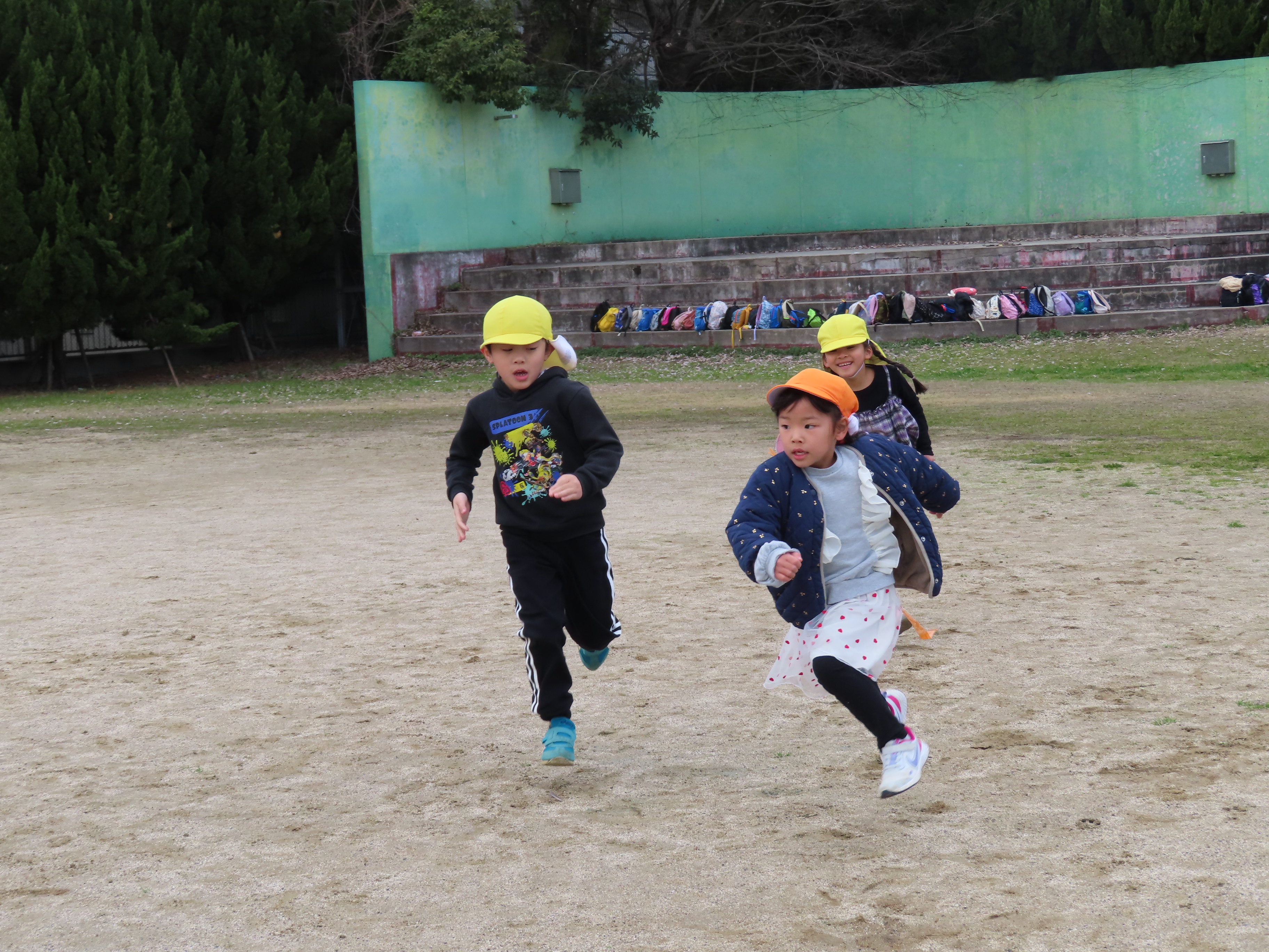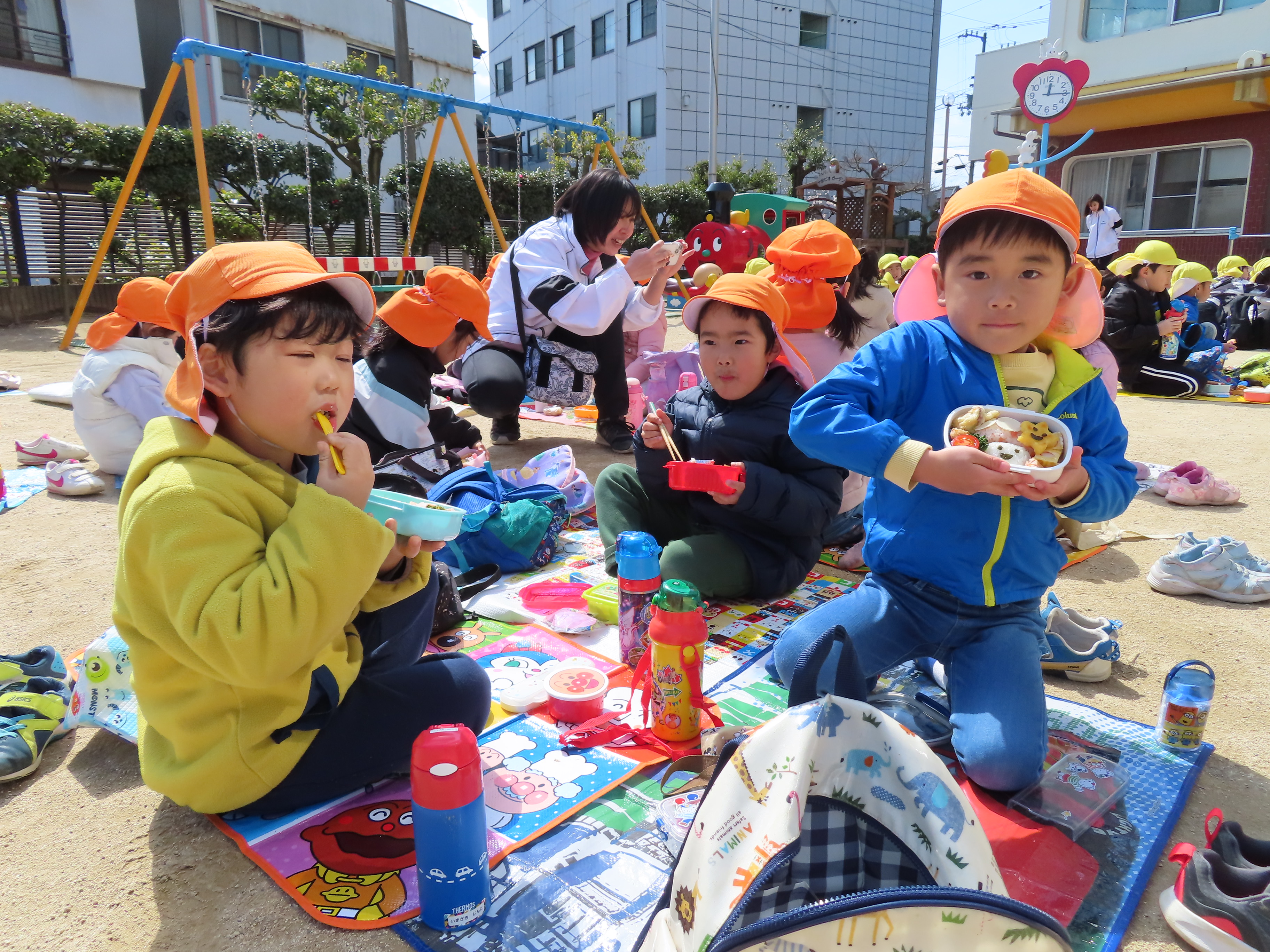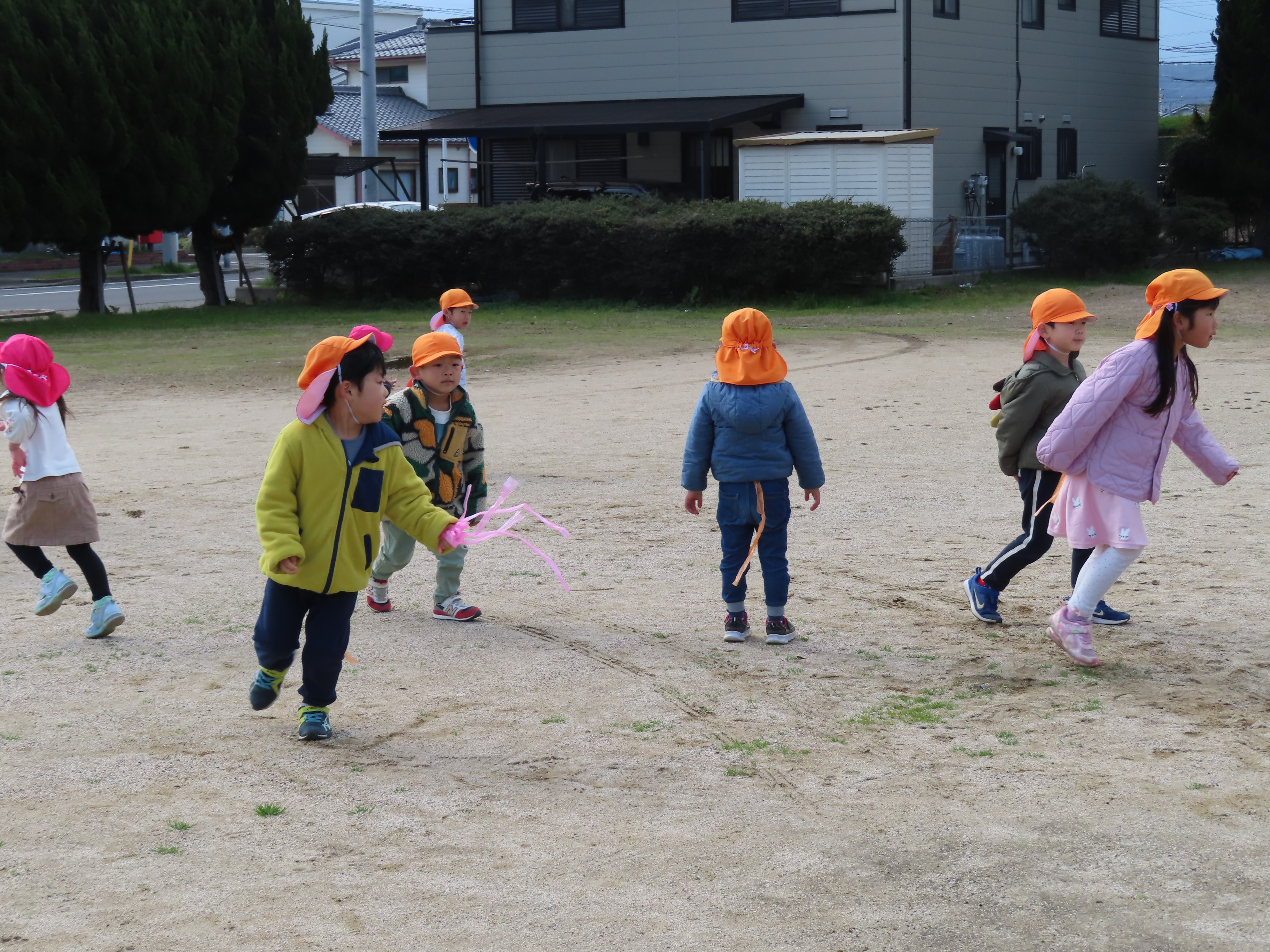もうすぐ保育園を卒園する年長児さんと年中、年少児さんたちで大江浜広場まで遠足に行ってきました(*^_^*)園から、海沿いを通って一直線ではあるもののけっこうな距離に「先生~、まだ着かん?」「先生~、もうお腹がすいた~」と疲れながら歩いた子どもたちでした(笑)「もう少し‼!頑張れ!!」とたくさん励ましながらなんとか無事に到着!‼広場に着いたら、みんなでしっぽ取りゲームを楽しんだのですが、さっきまでの疲れはどこに?というほどに、走って‼走って‼しっぽを追いかける子どもたちでした(*^_^*) 広場でお弁当も食べる予定でしたが、雨もポツポツ、風もビュービュー…なので、保育園に帰ってお弁当を食べました。お母さんが作ってくれたお弁当が、嬉しくって嬉しくって、お友だち同士で見せ合いっこする子どもたちの姿がなんともほほえましかったです(#^^#) お忙しい中、準備等ありがとうございました!