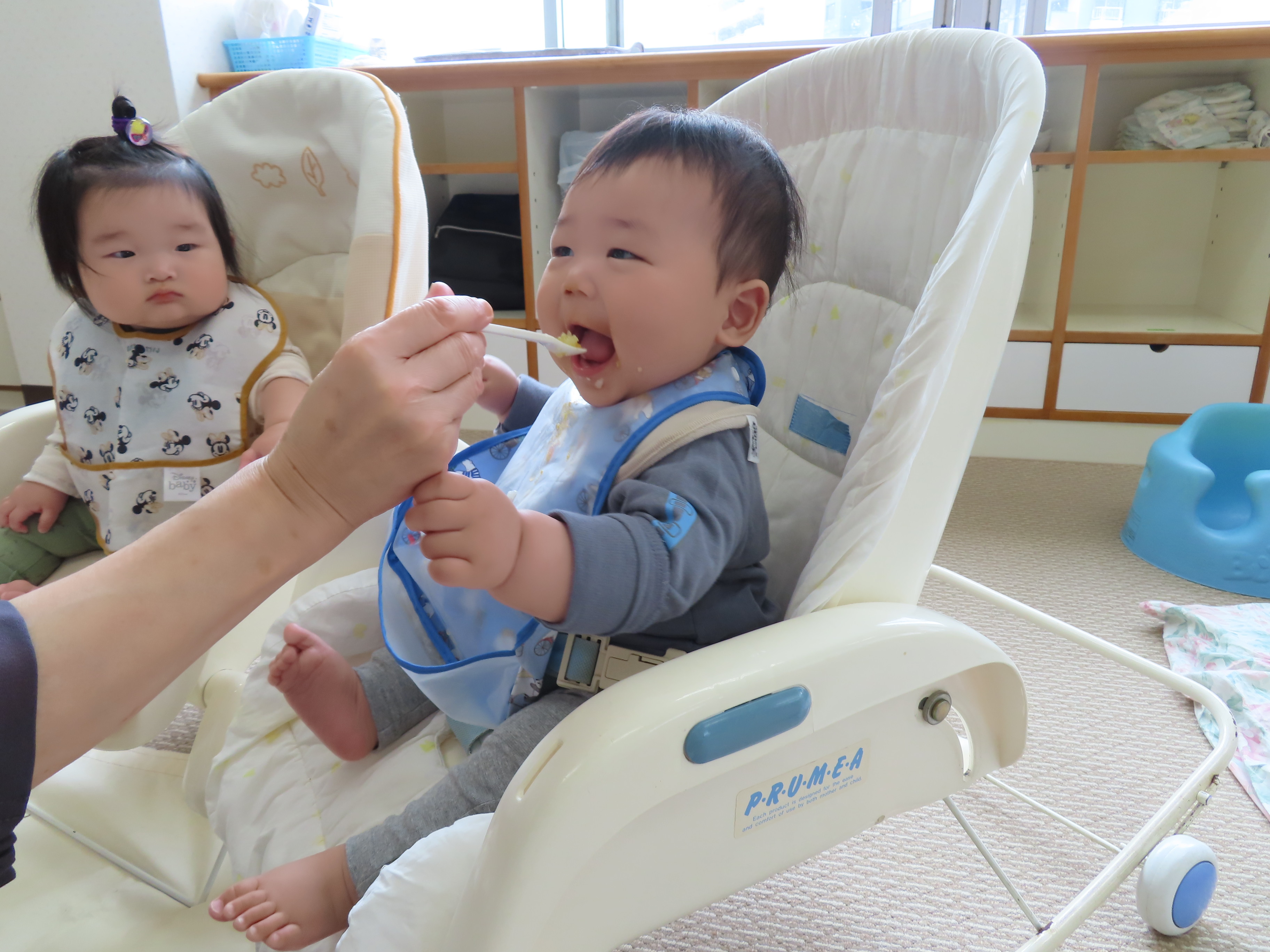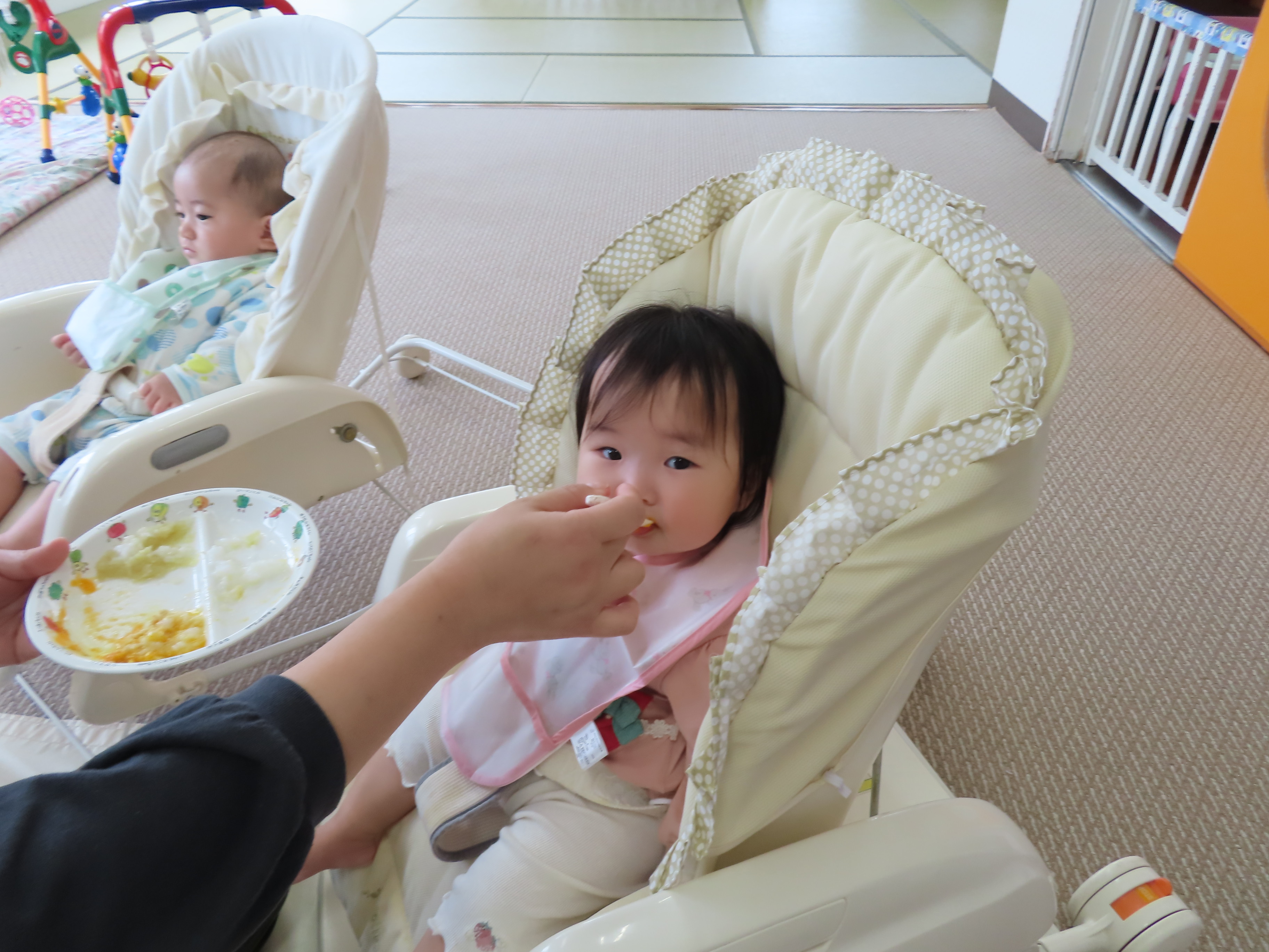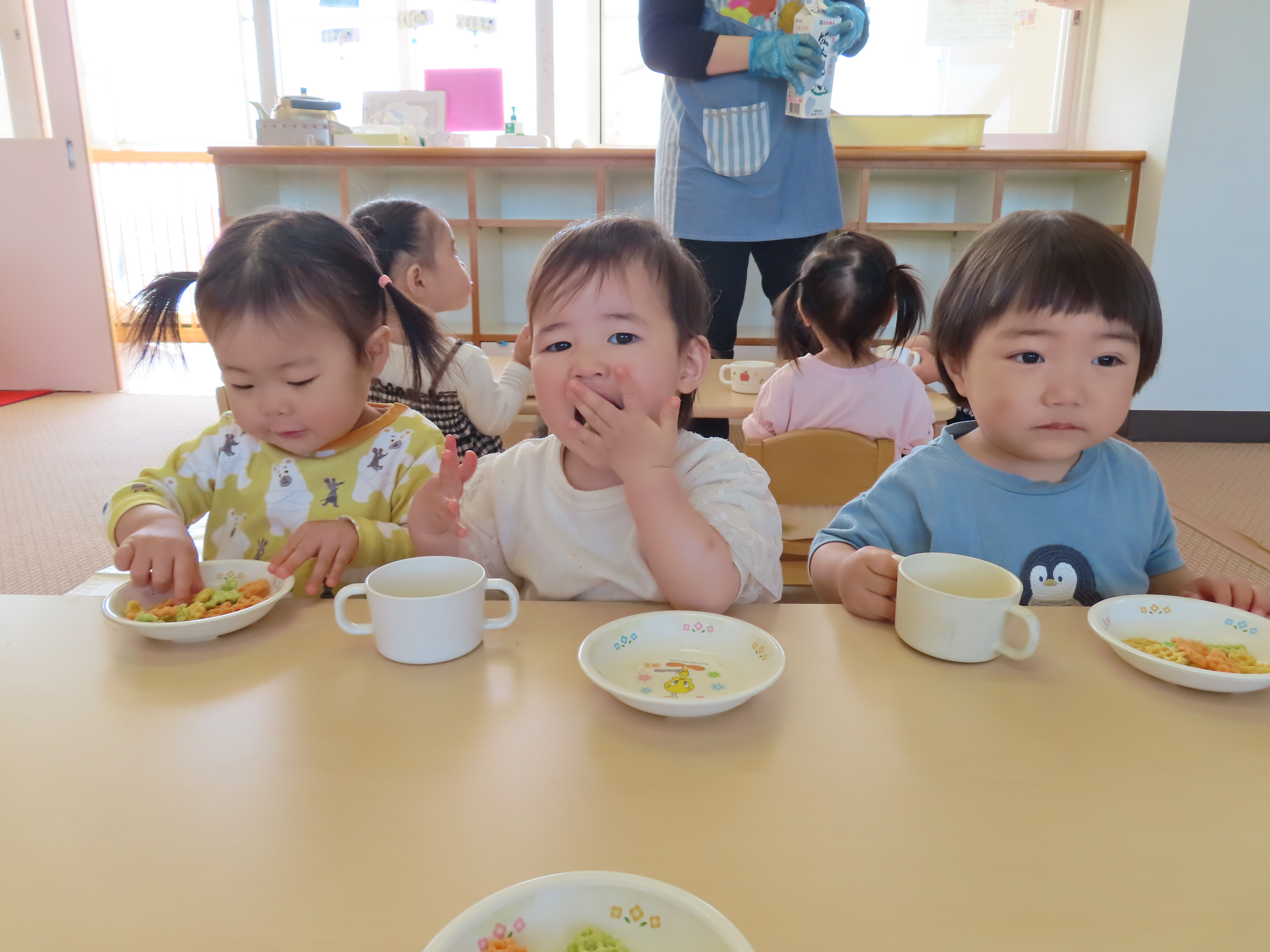 つぼみ組ともも組のおやつ、離乳食の様子です(*^_^*) つぼみ組の小さなお友達も新しい環境、保育園に慣れてきたので、離乳食も開始です!!保育園の離乳食はおいしいかな?もぐもぐと喜んで食べてくれているので、食べさせている保育士も嬉しくなります!!たくさん食べて大きくなぁ~れっ(*^_^*)