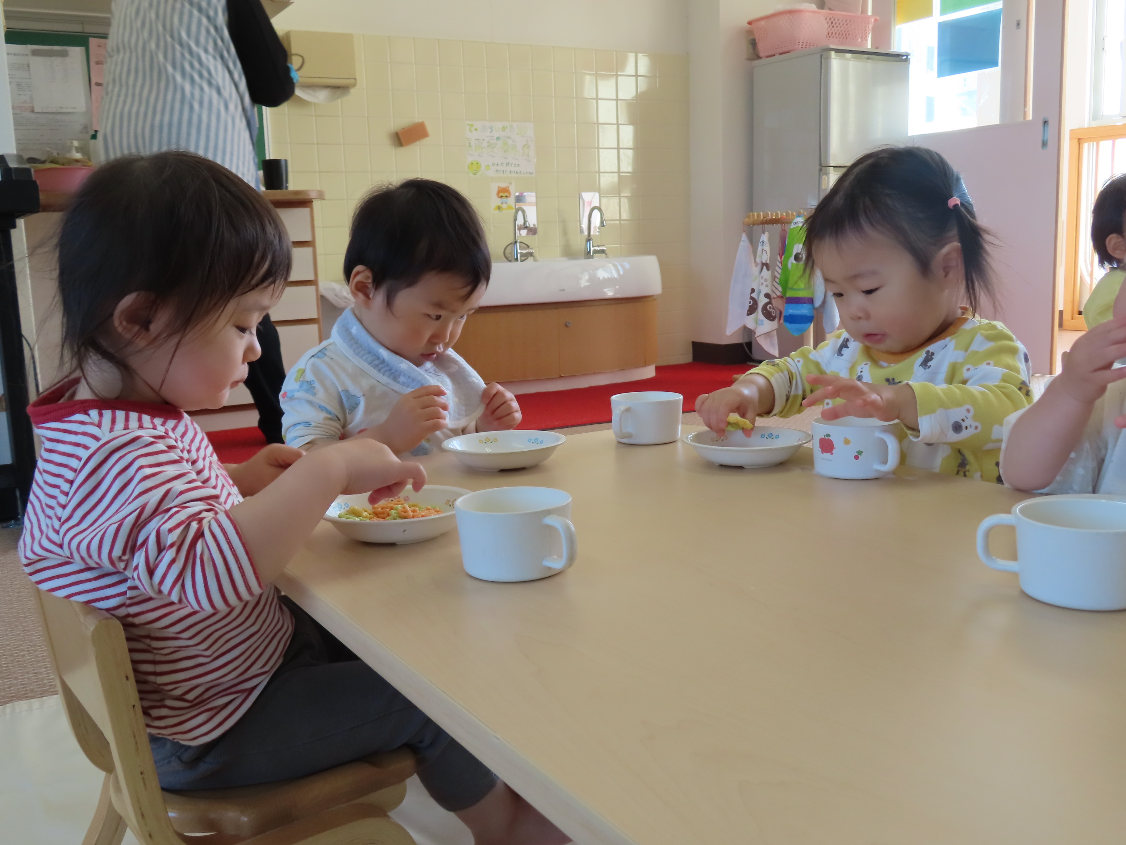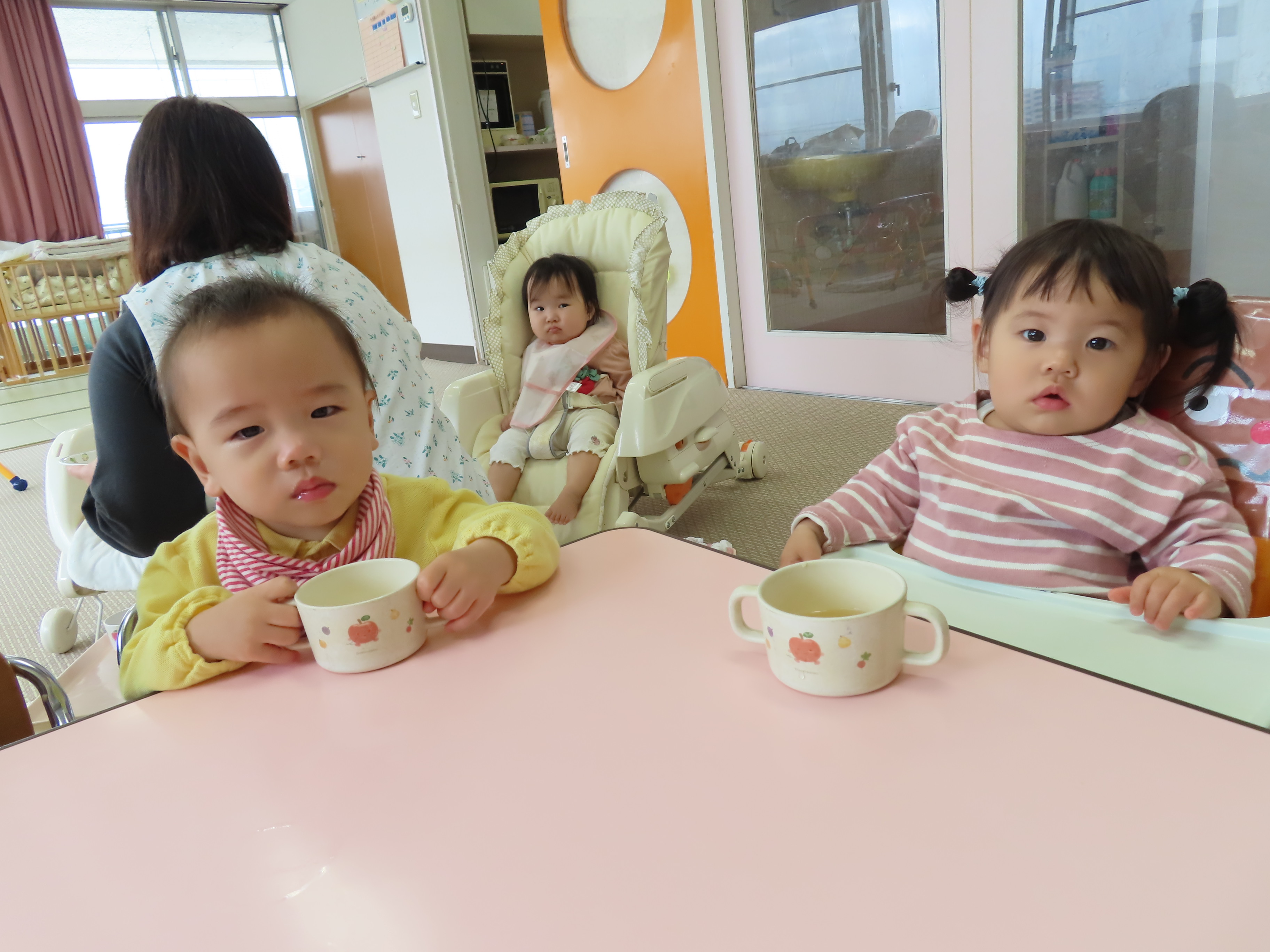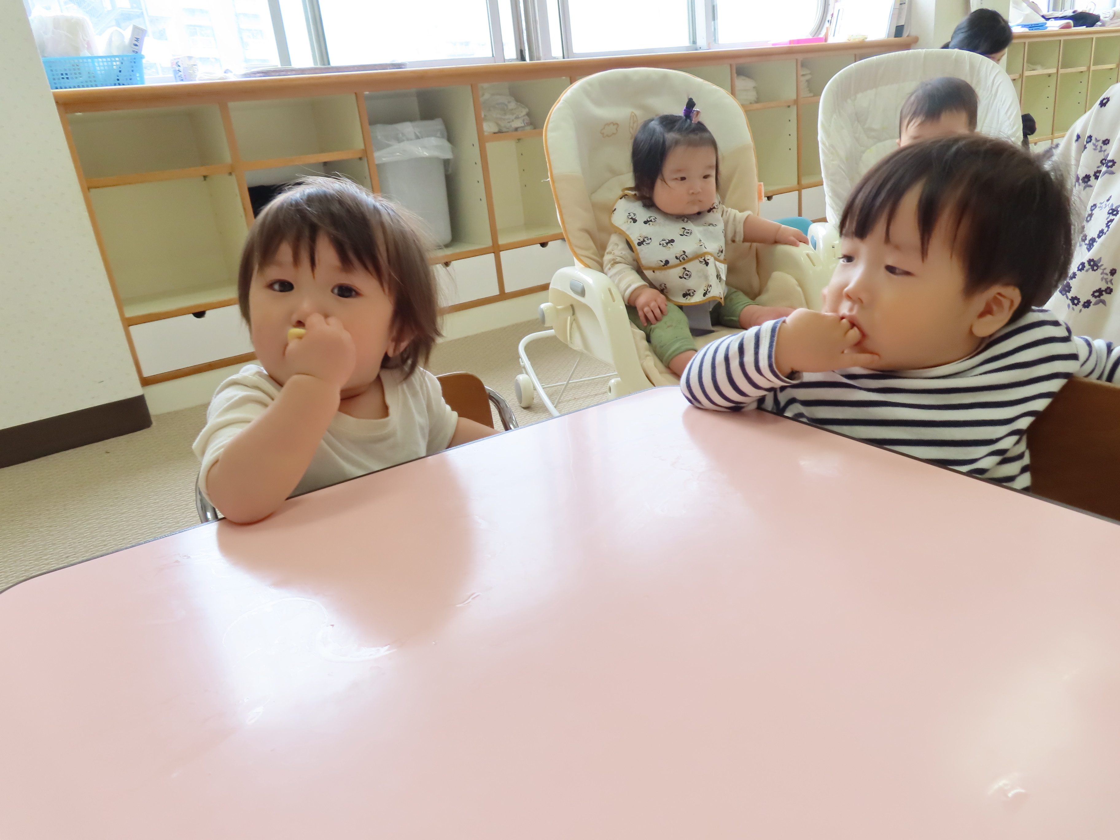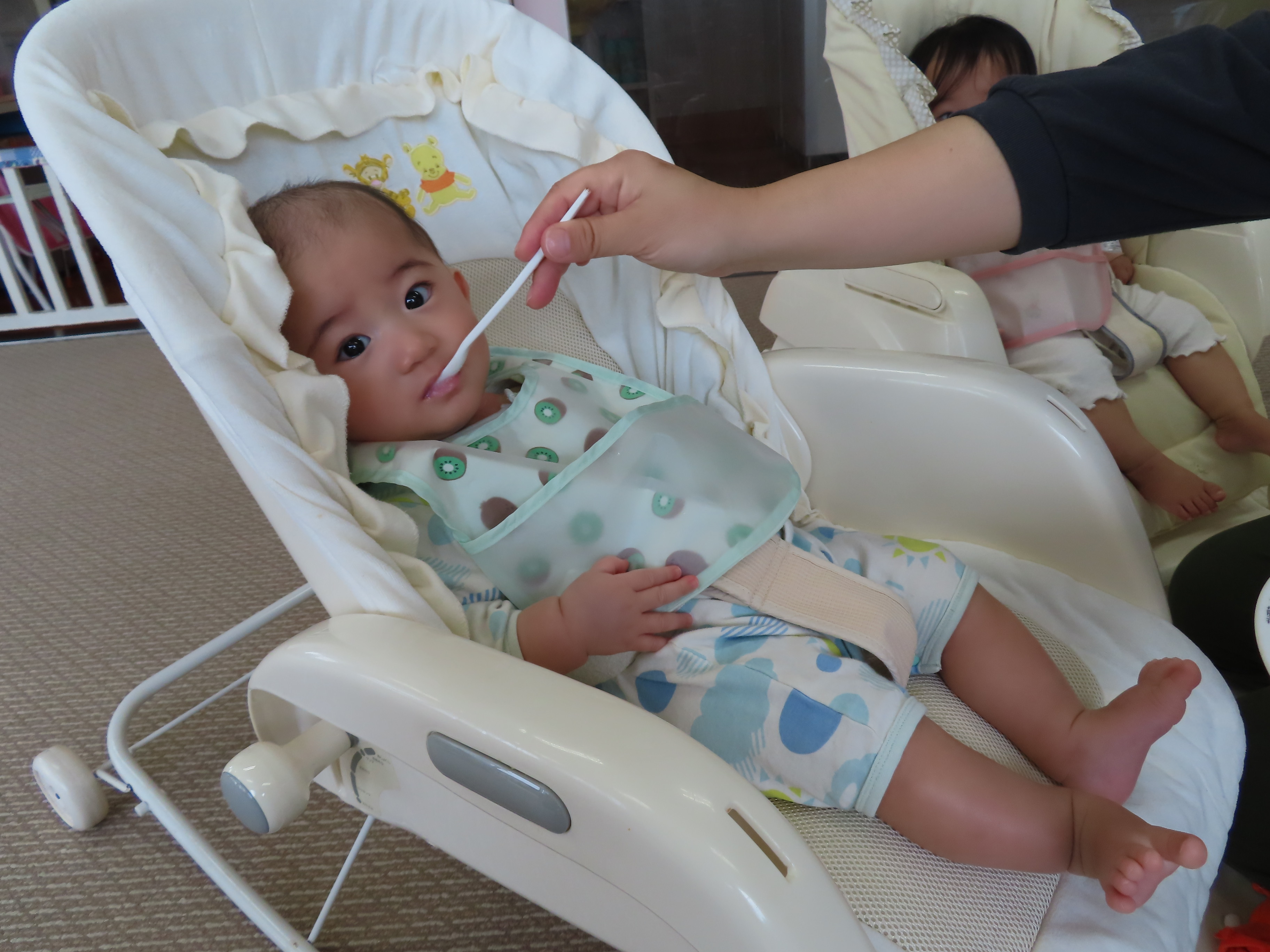 つぼみ組ともも組のおやつ、離乳食の様子です(*^_^*) つぼみ組の小さなお友達も新しい環境、保育園に慣れてきたので、離乳食も開始です!!保育園の離乳食はおいしいかな?もぐもぐと喜んで食べてくれているので、食べさせている保育士も嬉しくなります!!たくさん食べて大きくなぁ~れっ(*^_^*)