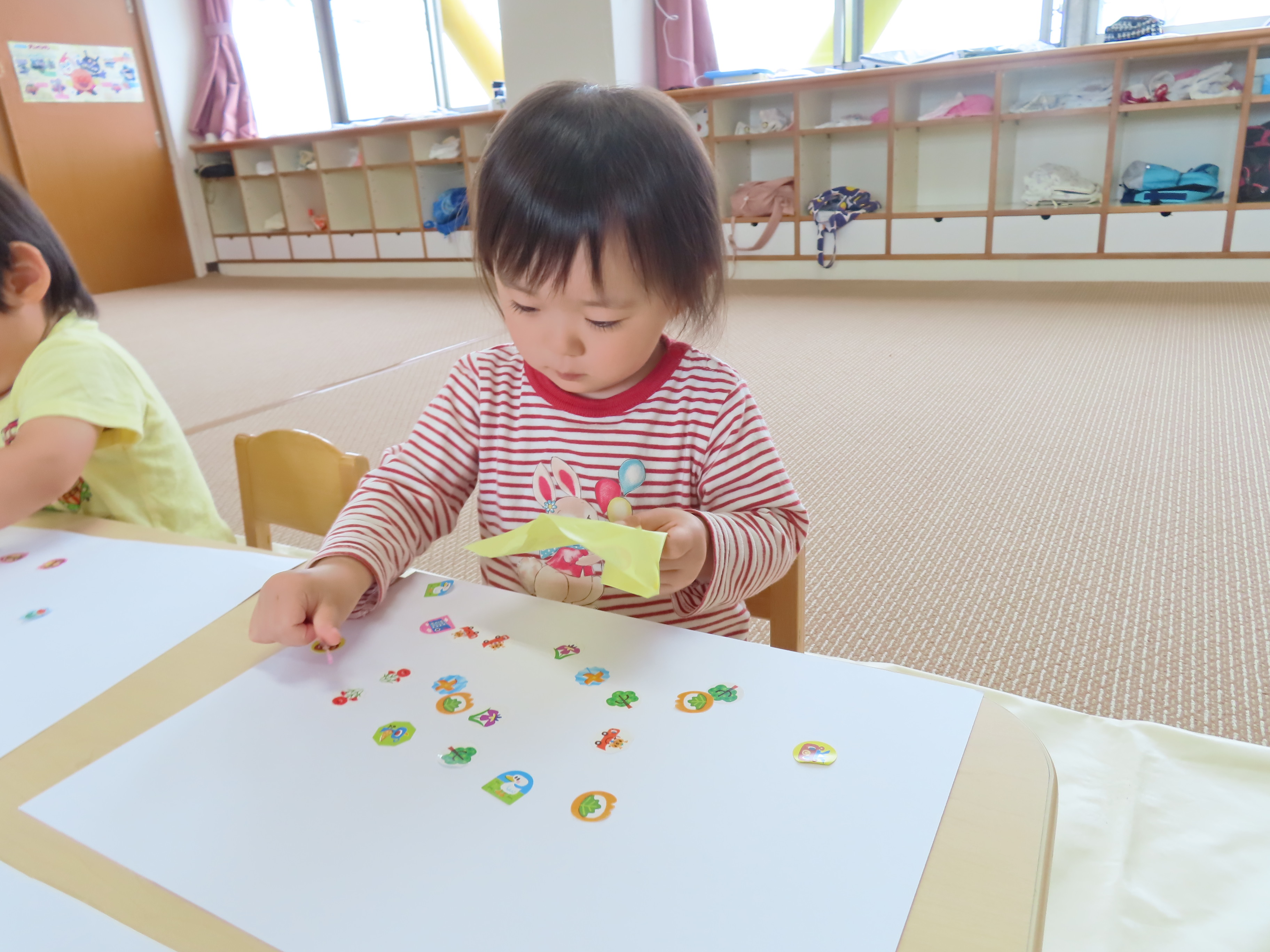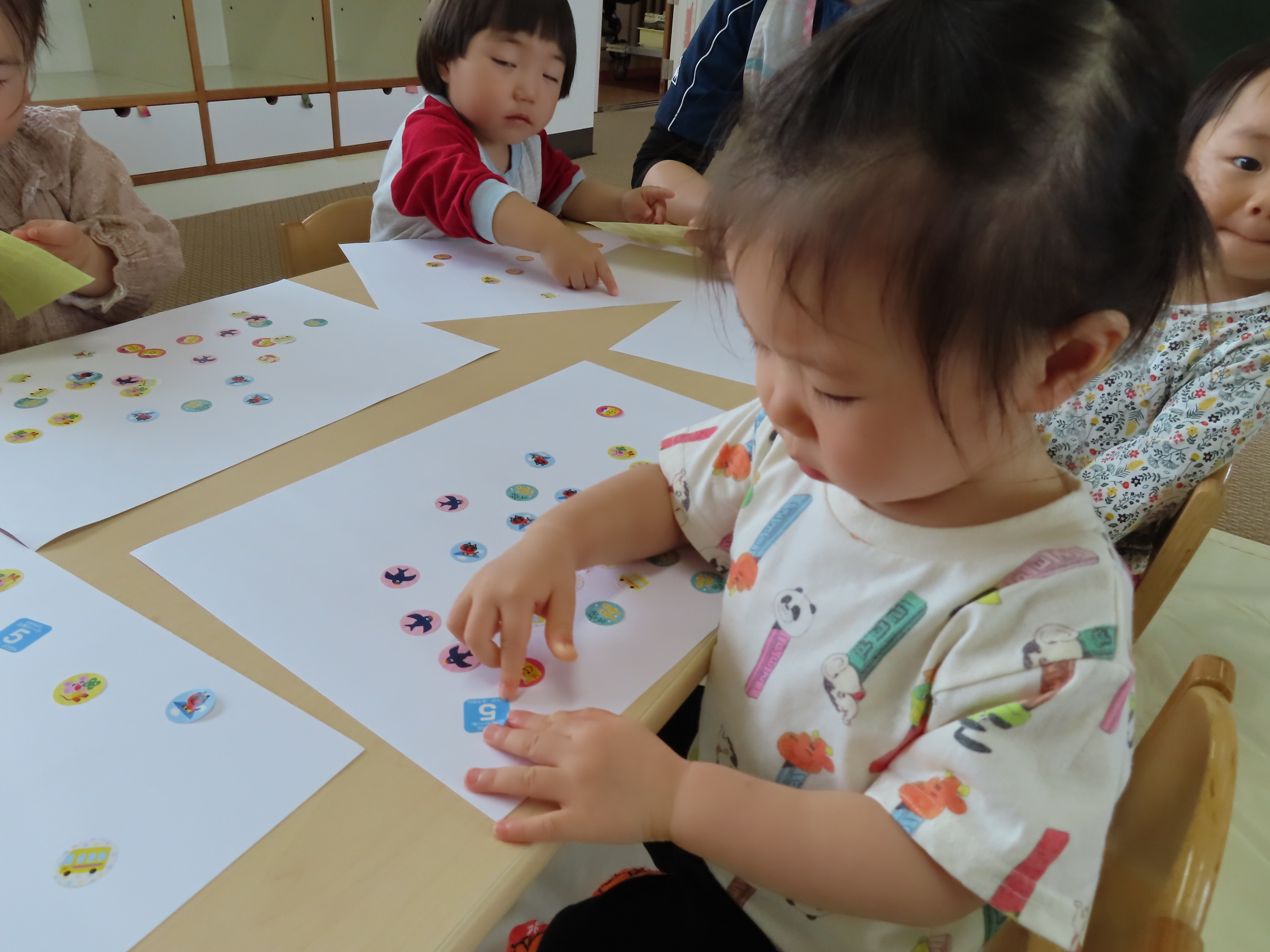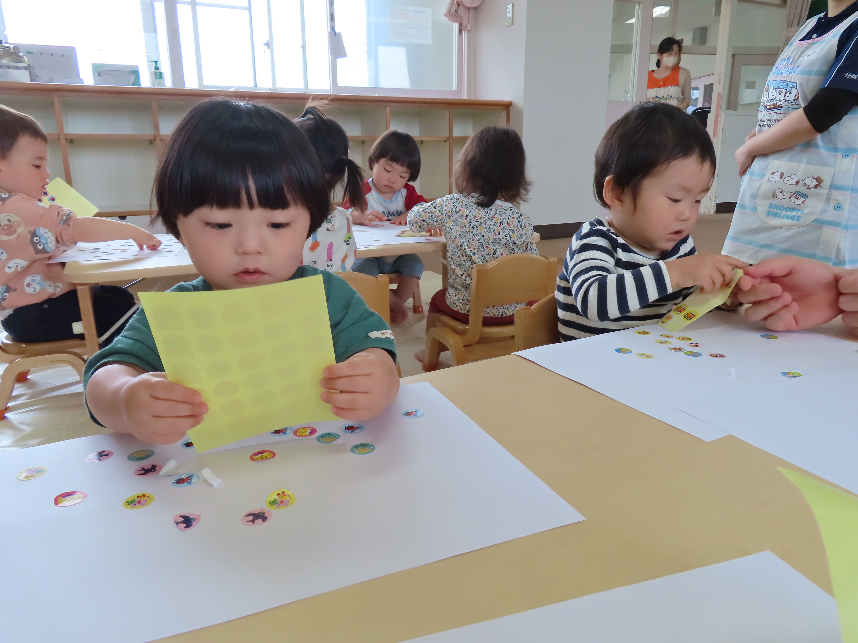 シール貼りを楽しみました!指先もだいぶ器用になってきて、シールをはがして、画用紙に貼るまでのスピードもはやくなってきたので、画用紙にもシールがいっぱい♪ 子どもたちの表情もとっても真剣ですした!!