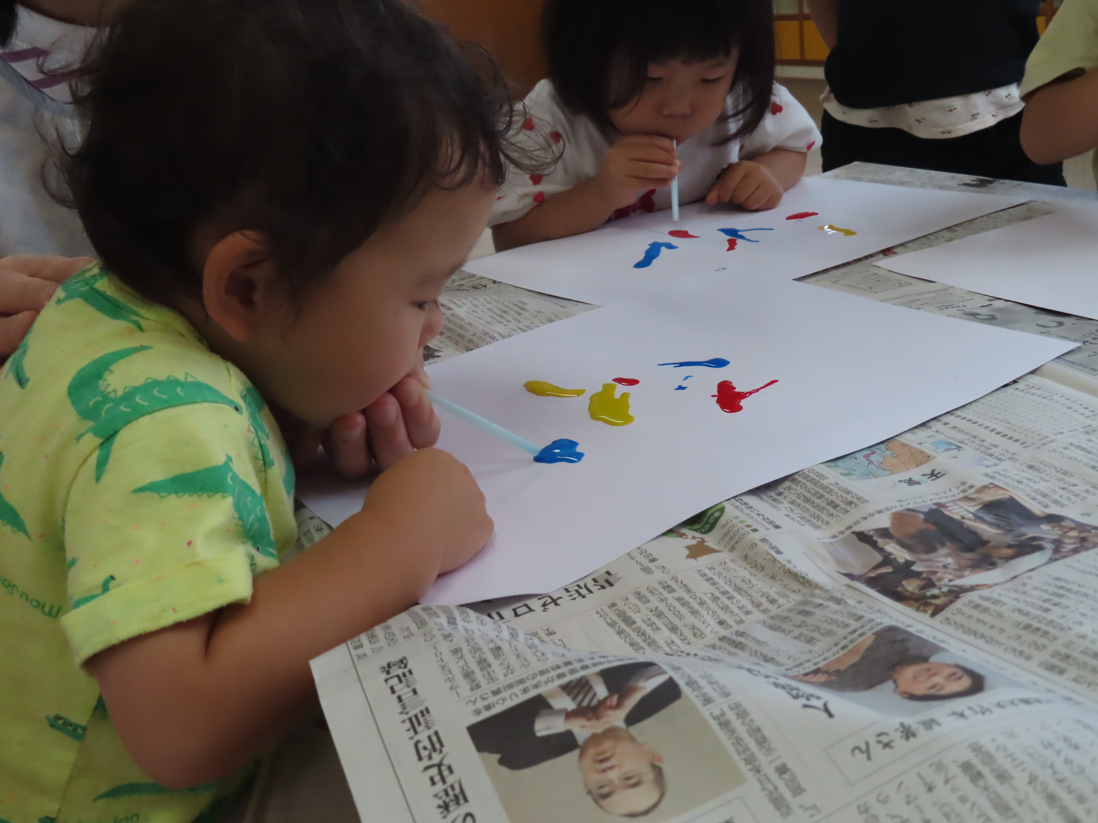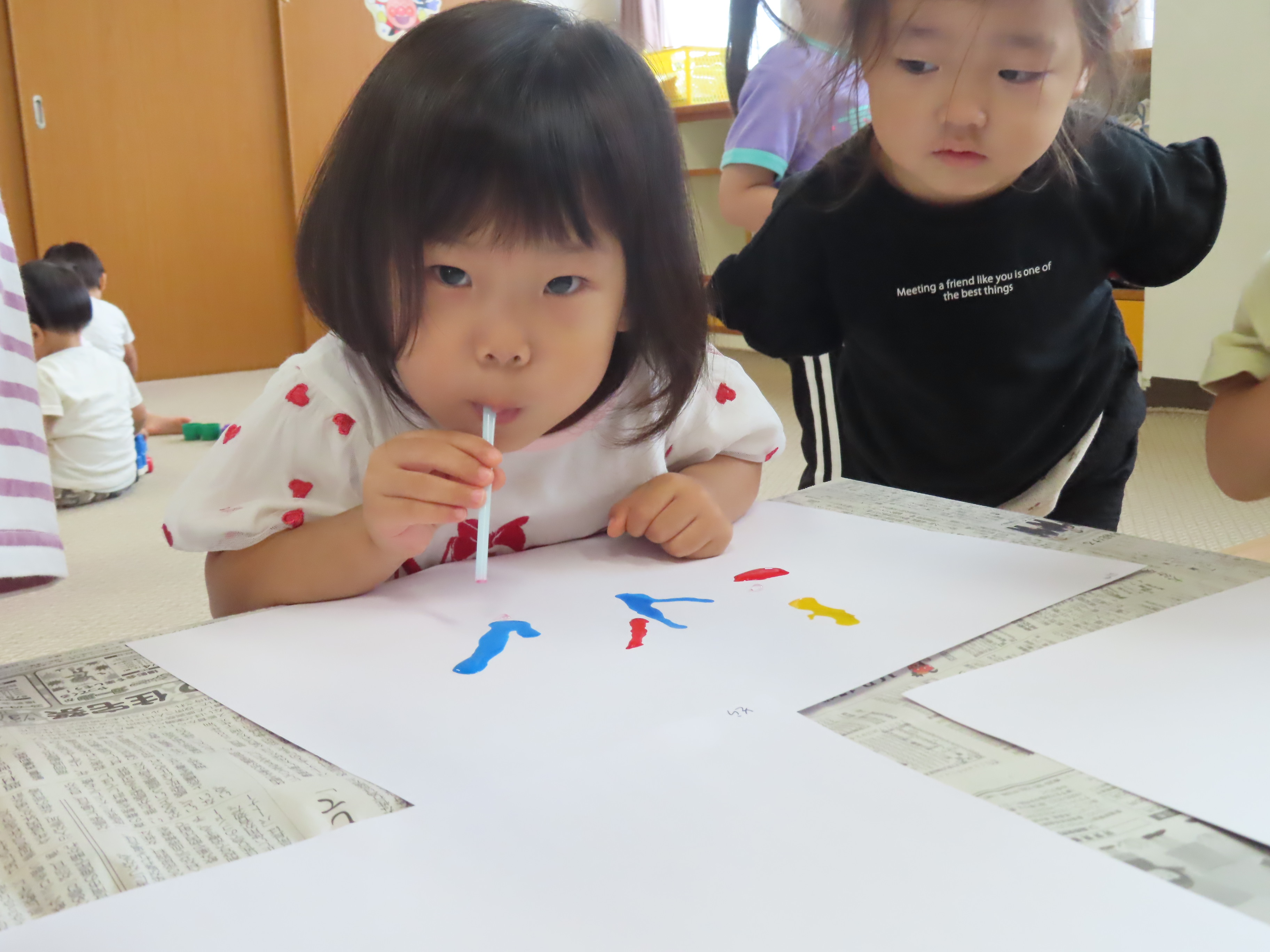 すみれ組でおもしろそうな製作遊びをしていたので、写真をパシャリ(*^_^*) 水分多めの絵の具を垂らして、ストローでフ~!!!っと息を吹きかけて、模様を作ろうと子どもたち頑張ってました!が…なかなか勢いの良い息が続かず苦戦!(^^)! 時々よだれもでつつ(笑)何度もフ~!!っと頑張る姿が可愛らしくて、見ていてクスっと笑ってしまい心和ませてもらいました♡